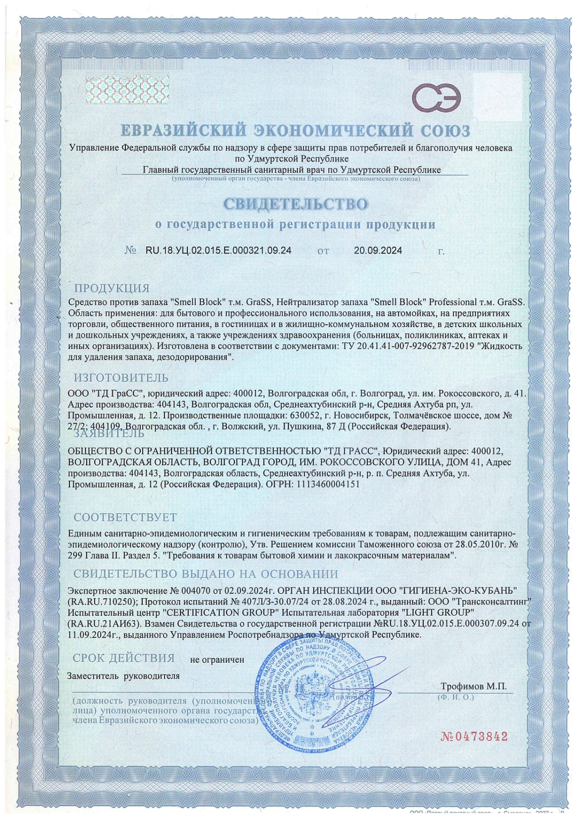 Нейтрализатор запаха 600 мл, GRASS SMELL BLOCK "Антизапах", распылитель Код товара: 702607 235,25 ₽ Купить Производитель:GRASS Блокиратор запахов GRASS SMELL BLOCK "Антизапах" предназначен для блокирования гнилостных и табачных запахов, запахов гари после пожара, неприятных запахов животных. Распыляется на поверхность, источающую неприятный запах. Обладает собственным приятным ароматом. Ключевые особенности: - антизапах, - блокатор запаха, - придает свежий аромат, - для различных поверхностей. Состав: не менее 30% вода, менее 5%: неионогенные ПАВ, соль цинка, ароматизирующая добавка, метилхлороизоциазолинон, метилизоциазолинон. Способ применения: Распылить с помощью триггера на поверхность, источающую запах. Меры предосторожности: беречь от детей! Хранить вдали от пищевых продуктов. При попадании в глаза немедленно промыть водой. При чувствительной коже и повреждениях кожи избегать длительного контакта со средством.Производство: РоссияТип товара: аэрозольныйОтдушка: нейтральнаяРазрешено для детских учреждений: даОбласть применения: бытовое использование, государственные учреждения, предприятия общественного питания, санаторно-курортные учреждения, сфера услуг, торговые учреждения, учреждения образования (школьные, дошкольные, средние, высшие)Объем/вес: 600 мл/гСрок годности: 24 месВес: 658 грРазмер упаковки: 4.9 × 28.3 × 9.5 смОбъём: 0.0015 м3Промежуточная упаковка: 8 штТранспортная упаковка: 8 штШтрих-код: 4650067524290 Файлы Сертификат-1.jpg Сертификат-2.jpg Сертификат-3.jpg Сертификат-4.jpg Сертификат-5.jpg