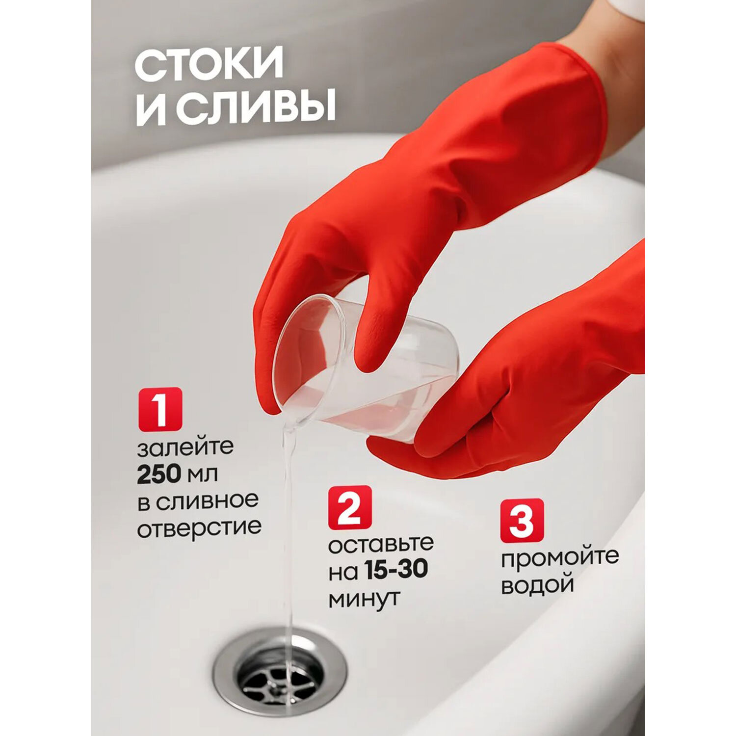 Идеально подходит для чистки унитазов, ванн, раковин, кафеля, стоков, сливов, пола и рабочих поверхностей. Используется при отбеливании белья.