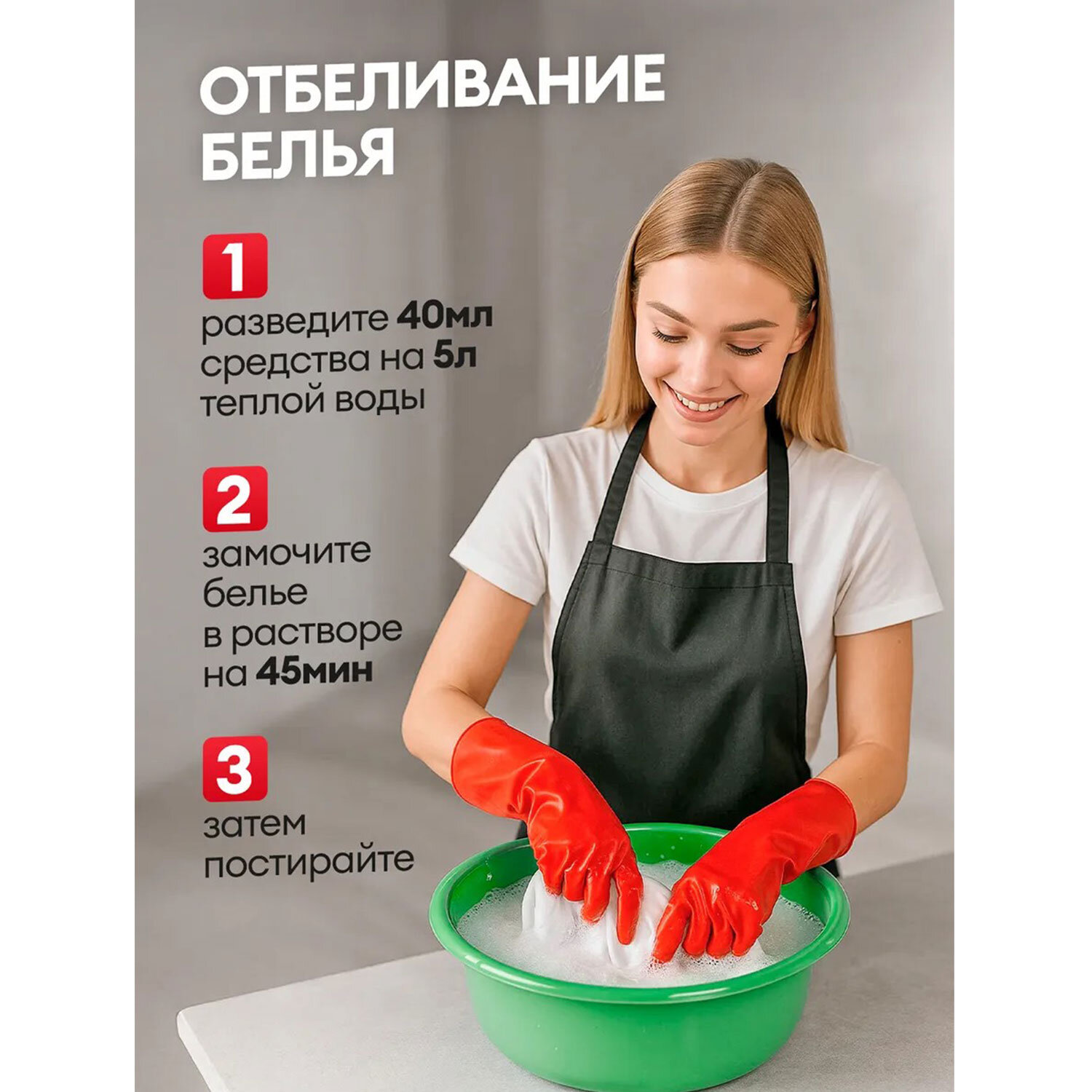 • Отбеливание белья – развести 40 мл средства на 5 л теплой воды, замочить белье в растворе на 45 минут, затем постирать обычным способом.