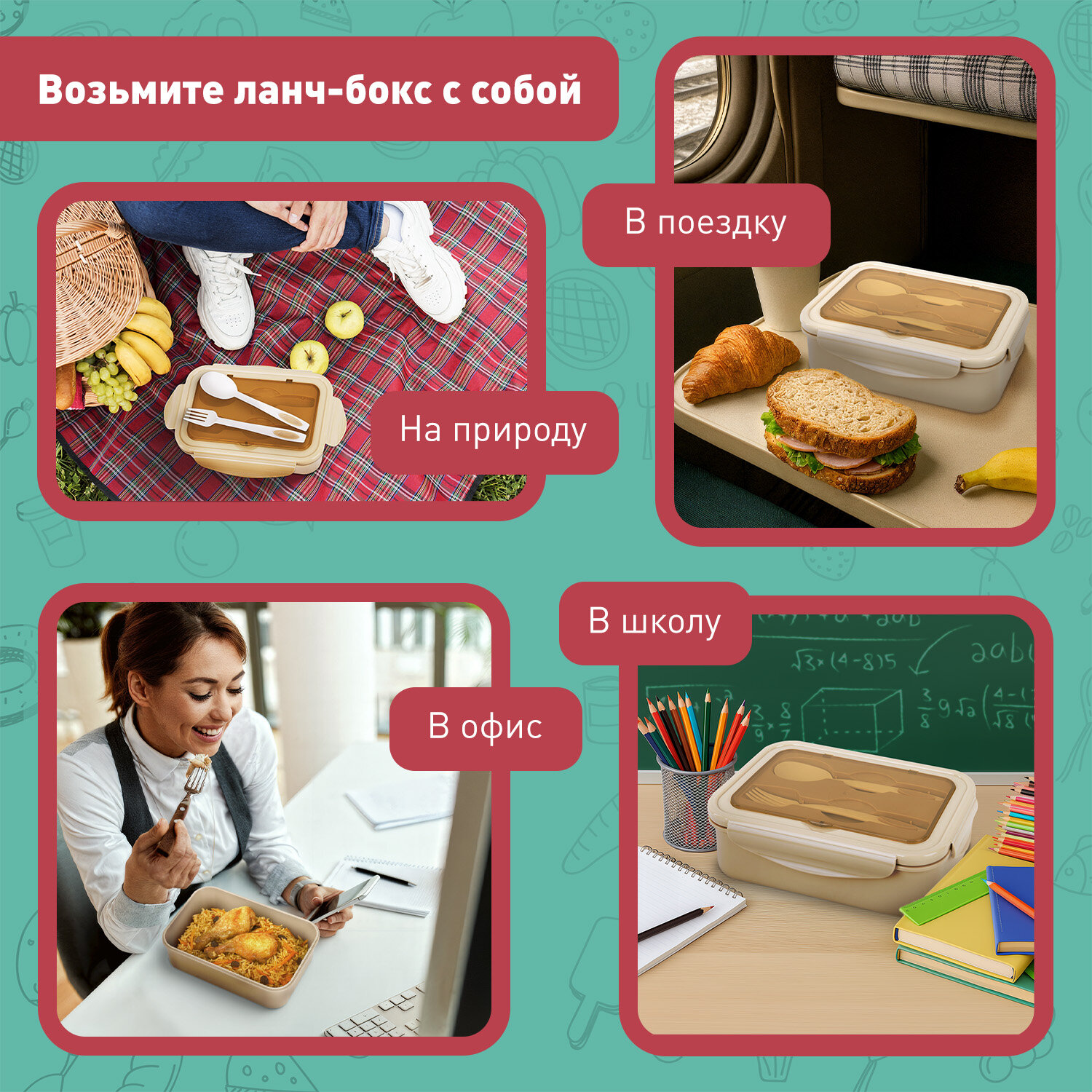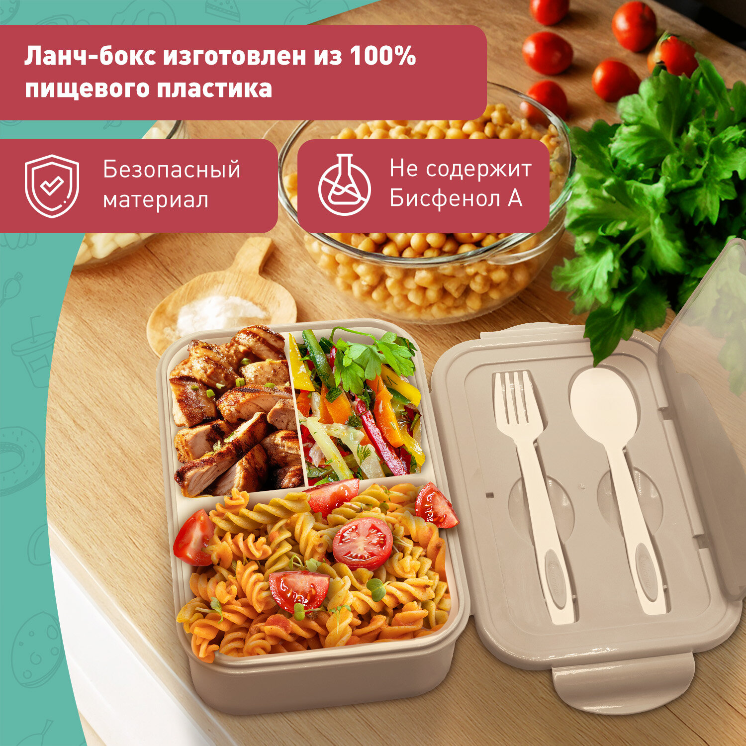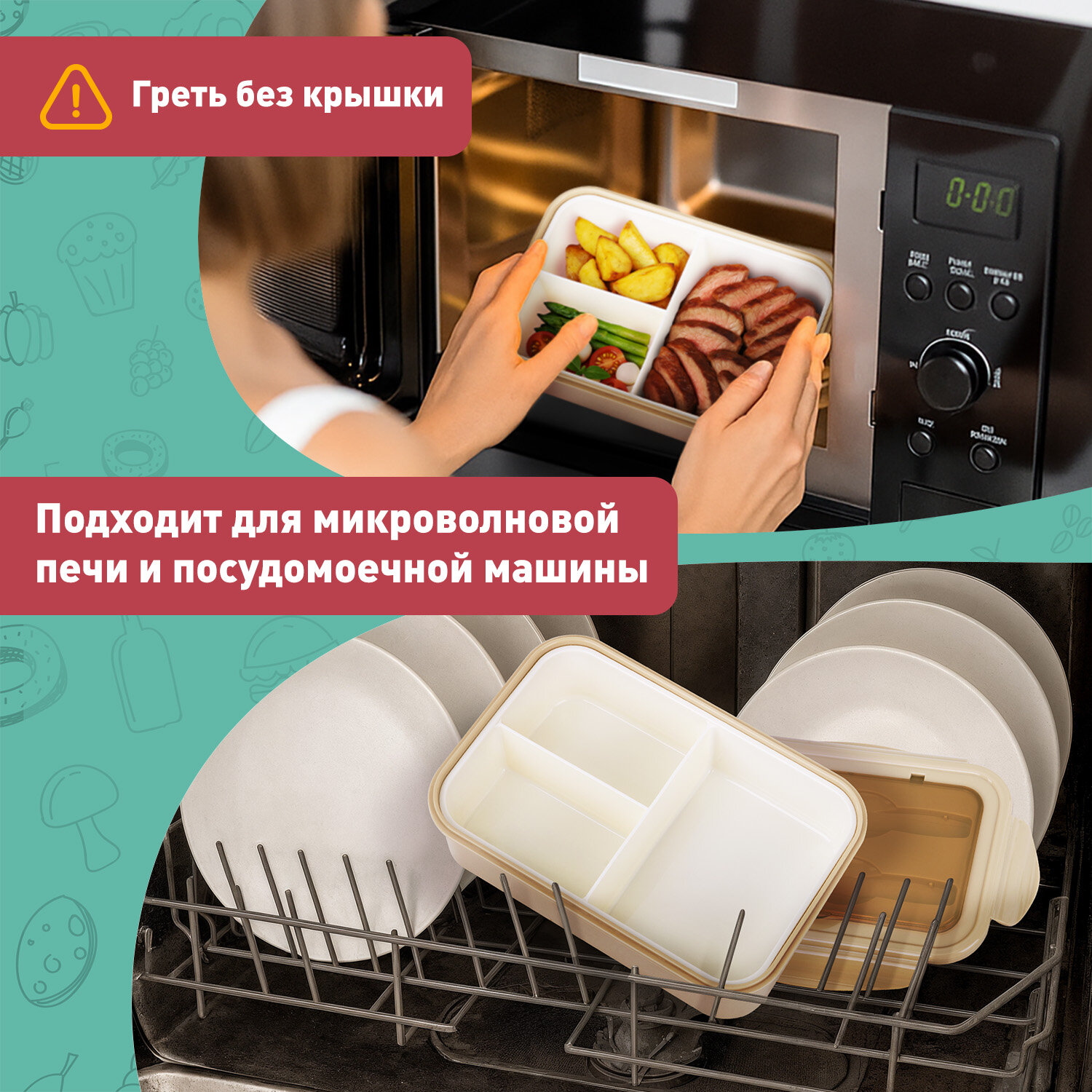 Ланч-бокс контейнер, 2 секции 3+1 отделение 1,4 л, ложка, вилка 7х21х14 см, бежевый, JOYLUX (ДЖОЙЛЮКС) Код товара: 609349 561,7 ₽ Купить Производитель:Joylux Многофункциональный герметичный ланч-бокс Joylux объемом 1400 мл имеет два уровня на ваш выбор и изготовлен из пластика высокого качества – это универсальное и безопасное решение для полноценного приема пищи в офисе, школе, поездках и путешествиях! Ланч-бокс Joylux выполнен из высококачественного полипропилена, который соответствует всем требованиям безопасности и не содержит бисфенола А. Материал устойчив к высоким температурам и подходит для использования в микроволновой печи и посудомоечной машине, что делает уход за контейнером максимально простым. Герметичность обеспечивается за счёт силиконового уплотнителя на крышке – это позволяет безопасно переносить даже первые блюда без риска протекания. В комплект входят пластиковые ложка и вилка, которые надёжно закреплены в специальных держателях на крышке. Объём ланч-бокса – 1400 мл, что оптимально для полноценного обеда. Он состоит из двух уровней: первый (700 мл) представляет собой большое отделение для основного блюда, а второй (700 мл) разделён на 3 секции и подойдёт для сэндвичей, закусок, десертов или салата. Благодаря перегородкам продукты не смешиваются между собой. Таким образом, ланч-бокс универсален: его можно использовать как для одного блюда, так и для комбинации из разных блюд. Joylux отличается современным и лаконичным дизайном, который подойдёт и детям, и взрослым. Компактные размеры и удобная форма позволяют легко разместить его в сумке или рюкзаке. Рекомендации по использованию: - Используйте ланч-бокс для хранения и транспортировки горячих и холодных блюд (диапазон температур при использовании: от -20 до +110 °C). - Перед разогревом в микроволновой печи убедитесь, что крышка открыта. - Подходит для посудомоечной машины и микроволновой печи.Производство: КитайОбъем: 1.4 лНазначение: СВЧ, хранениеКоличество секций: 2Особенности: герметичныйЦвет контейнера: бежевыйЦвет крышки: бежевыйМатериал: пластикВысота: 7 смШирина: 21 смГлубина: 14 смВес: 422 грРазмер упаковки: 7.7 × 22.2 × 15.6 смОбъём: 0.0032 м3Промежуточная упаковка: 42 штТранспортная упаковка: 42 штШтрих-код: 4606224440088 Сертификат-1.jpg Сертификат-2.jpg Сертификат-3.jpg