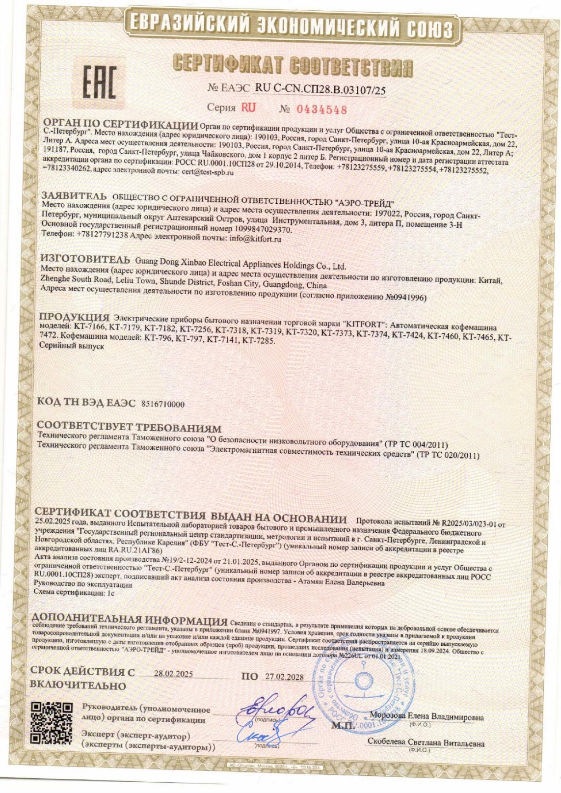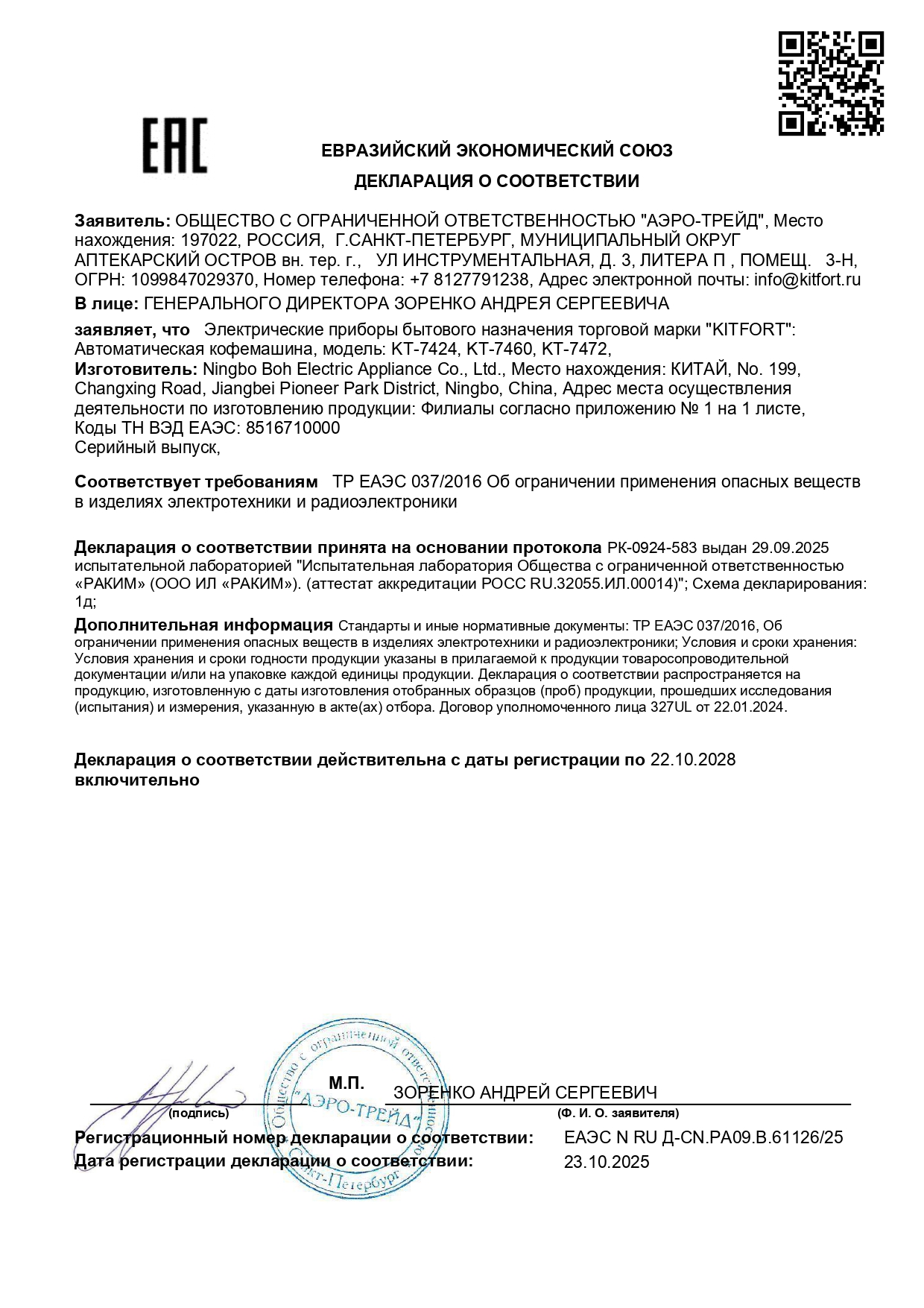 Кофемашина KITFORT КТ-7424, 1480 Вт, объем 1,5 л, для зерен 200 г, черная Код товара: 458161 33 075,84 ₽ Купить Производитель:KITFORT Наслаждайтесь бариста-кофе каждый день с автоматической кофемашиной KITFORT KT-7424 – мощной, функциональной и простой в использовании. Эта модель приготовит эспрессо, лунго, американо, лонг блэк и мягкий американо без лишних усилий! Кофемашина оснащена встроенной кофемолкой с 5 уровнями помола, что позволяет измельчать зёрна непосредственно перед завариванием для максимального раскрытия аромата. Давление 19 бар обеспечивает идеальную экстракцию, а регулировка крепости, температуры и объёма напитка даёт полный контроль над вкусом. Вы можете настроить количество зёрен, степень уплотнения таблетки, температуру воды и объём готового напитка под свои предпочтения. Удобная панель управления с дисплеем делает выбор режимов интуитивно понятным. В комплекте есть подставка для чашек, а съёмный поддон для капель с поплавком сигнализирует о необходимости опорожнения. Резервуар для воды – 1,5 л, контейнер для зёрен – 200 г, что достаточно для нескольких дней использования. Мощность устройства – 1480 Вт, уровень шума – до 70 дБ, длина шнура – 1 м, а отсек для хранения шнура расположен на дне корпуса. Габариты: 425х320х245 мм, вес – 9,1 кг. Все съёмные детали легко моются, а в комплекте идут ёршик и щётка для чистки, что упрощает уход. Производитель оставляет за собой право без предварительного уведомления вносить изменения в технические характеристики, комплектацию и конструкцию, не ухудшающие эксплуатационные характеристики изделия.Производство: КитайМощность: 1480 ВтДавление: 19 БарЕмкость резервуара для воды: 1.5 лЕмкость резервуара для зерен: 200 гИспользуемый кофе: зерновойАвтоматическая программа очистки от накипи: даВстроенная кофемолка: жерноваяМатериал жерновов: металлСъемный лоток для сбора капель: даРегулировка степени помола: даРегулировка температуры кофе: даРегулировка крепости кофе: даПодача горячей воды (для чая): даЖК-дисплей: даКомплектация: инструкцияМатериал корпуса: пластикЦвет корпуса: черныйШирина: 245 ммВысота: 320 ммГлубина: 425 ммВес: 9.1 кгСерия: KITFORT КТ-7424Размер упаковки: 40.3 × 50 × 32 смОбъём: 0.0645 м3Промежуточная упаковка: 1 штТранспортная упаковка: 1 штШтрих-код: 4630277484515 Файлы Приложение-1.pdf Сертификат-1.jpg Сертификат-2.jpg Сертификат-3.jpg Сертификат-4.jpg Сертификат-5.jpg Сертификат-6.jpg Сертификат-7.jpg