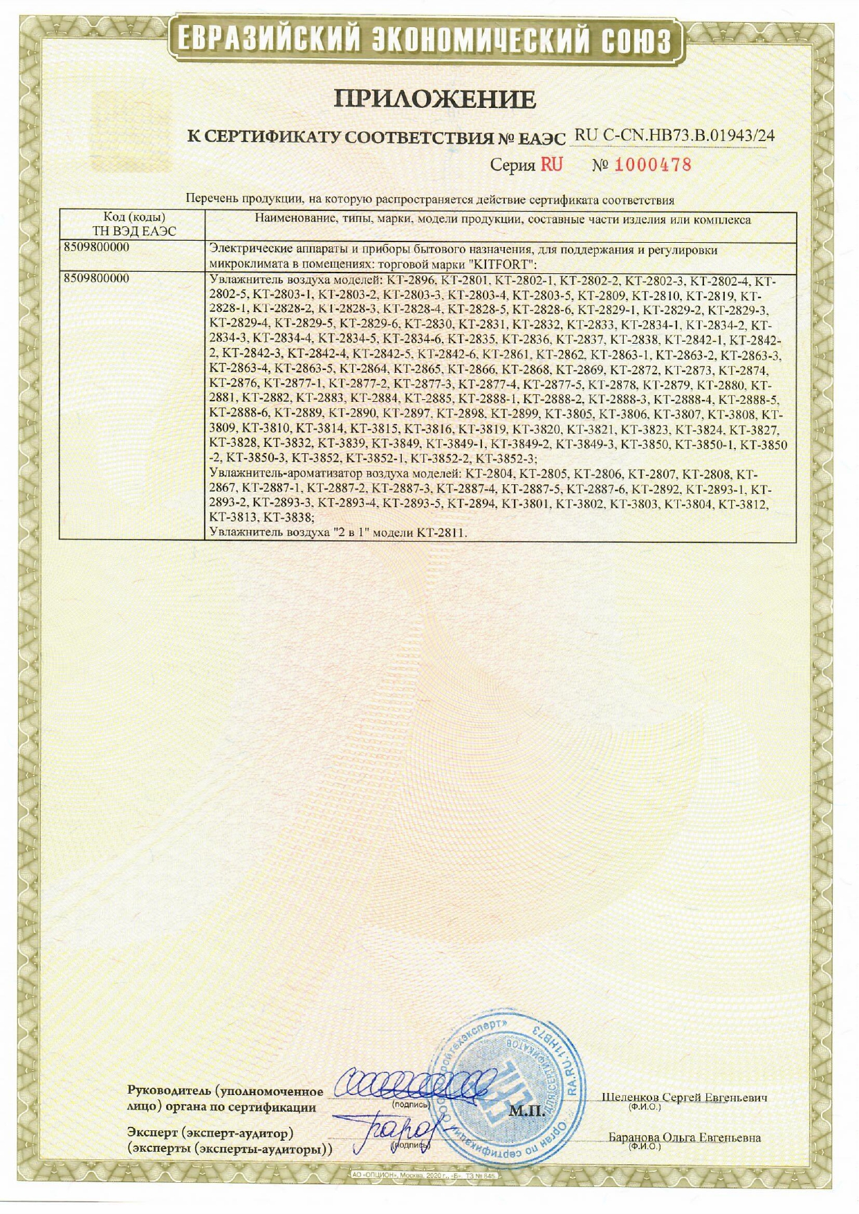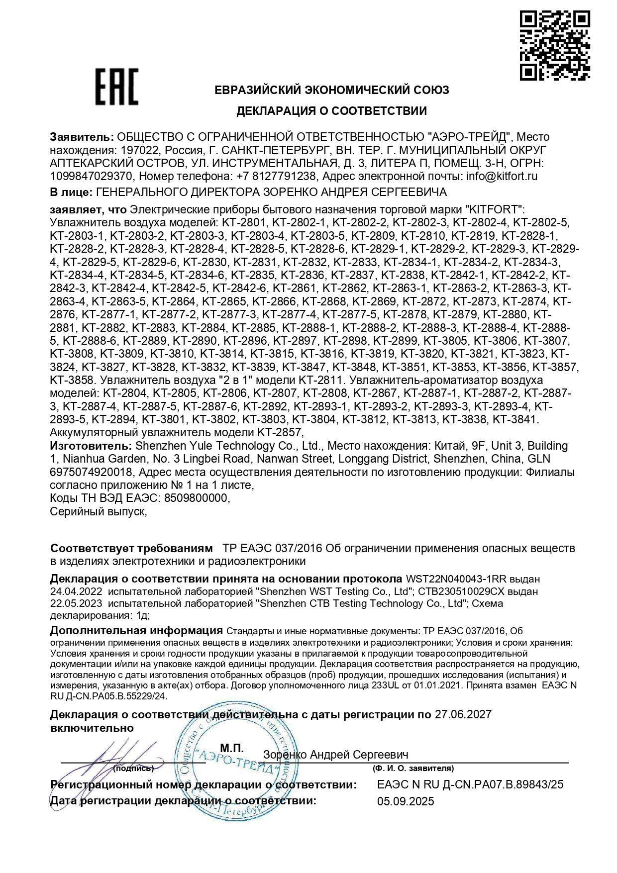 Увлажнитель воздуха KITFORT KT-2832, объем бака 4,5 л, 25 Вт, белый Код товара: 458189 5 662,27 ₽ Купить Производитель:KITFORT Создайте здоровый и уютный микроклимат в доме с ультразвуковым увлажнителем KITFORT KT-2832 – тихим, стильным и эффективным решением для помещений до 25 м2. Модель идеально подходит для спальни, детской или гостиной, обеспечивая комфортное дыхание! Устройство оснащено вместительным резервуаром на 4,5 литра, который позволяет работать до 30 часов без долива воды. Благодаря уровню шума всего 32 дБ, увлажнитель работает практически бесшумно – вы даже не заметите его включённым во время сна или отдыха. Максимальная скорость испарения – 300 мл/ч, мощность – 25 Вт, что делает прибор энергоэффективным и экономичным. Управление простое и интуитивное: кнопки "Вкл/выкл", "Таймер" (от 2 до 8 часов) и "Подсветка" позволяют легко настроить работу под ваши нужды. Резервуар легко наполняется – достаточно снять крышку, а при пустом баке устройство автоматически переходит в режим ожидания. Особенность модели – цветная подсветка мерной шкалы, которая плавно переливается между оттенками или фиксируется в одном цвете, создавая уютную атмосферу в комнате. В основе работы – пьезокерамический излучатель, создающий мелкодисперсный туман за счёт ультразвуковых колебаний, что обеспечивает равномерное и эффективное увлажнение воздуха. Габариты: 205х205х300 мм, вес – 1,2 кг, компактные размеры и лёгкость делают устройство мобильным и удобным в использовании. Производитель оставляет за собой право без предварительного уведомления вносить изменения в технические характеристики, комплектацию и конструкцию, не ухудшающие эксплуатационные характеристики изделия.Производство: КитайТип увлажнителя: ультразвуковойПлощадь использования: 25 м2Емкость резервуара для воды: 4.5 лМощность: 25 ВтРегулировка интенсивности испарения: даФункции: автоматическое отключение, подсветка, таймерСерия: КТ-2832Расход воды: 300 мл/чТип управления: электронныйУровень шума: 32 дБВремя непрерывной работы: 30 чВерхний долив воды: даПодсветка корпуса: даЦвет: белыйВысота: 300 ммШирина: 205 ммГлубина: 205 ммВес (без упаковки): 1.2 кгВес: 1,86 кгРазмер упаковки: 33.8 × 23.9 × 25 смОбъём: 0.0228 м3Промежуточная упаковка: 4 штТранспортная упаковка: 4 штШтрих-код: 4650301865097 Файлы Приложение-1.pdf Сертификат-1.jpg Сертификат-2.jpg Сертификат-3.jpg Сертификат-4.jpg Сертификат-5.jpg Сертификат-6.jpg Сертификат-7.jpg Сертификат-8.jpg