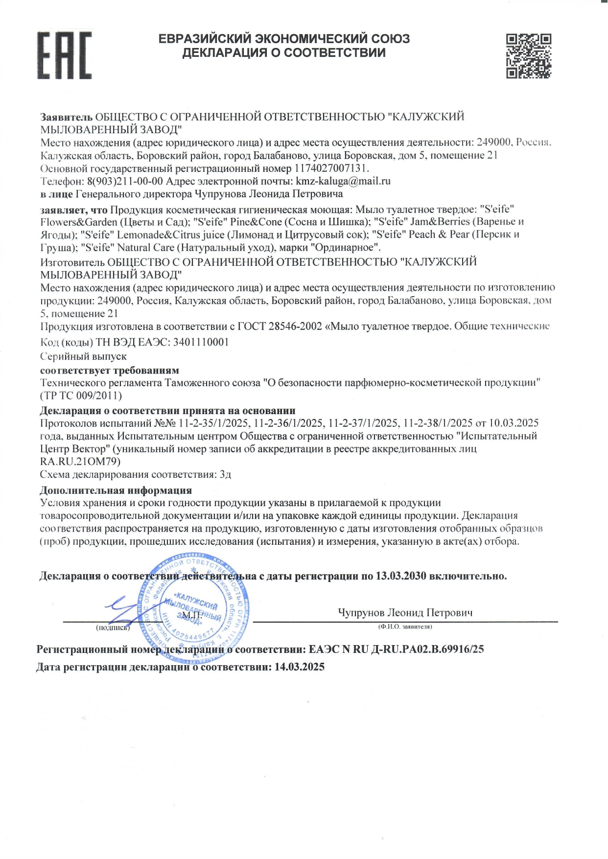 Мыло туалетное 100 г S'EIFE "Flowers & Garden" (Цветы и Сад), КМЗ, штампованное Код товара: 702578 33,75 ₽ Купить Производитель:КМЗ Туалетное мыло прекрасно сочетает в себе хорошее моющее свойство с благотворным влиянием на кожу. Предназначено для мытья рук и тела. Глицерин, входящий в состав туалетного мыла, смягчает и увлажняет кожу. Изготовлено из натуральных жиров и масел. Состав: натриевые соли жирных кислот натуральных пищевых жиров, пальмового и кокосового масел, вода, парфюмерная композиция, глицерин, хлорид натрия, Антал-Н, диоксид титана.Производство: РоссияТип: туалетноеВес: 100 гОтдушка: цветочнаяЭффект от использования: увлажнениеКоличество в упаковке: 1 шт.Марка: S'EIFEТовар относится к сегменту ЭКОНОМ: даСерия: Цветы и СадВид упаковки: полиэтиленСрок годности: 36 месРазмер упаковки: 5.3 × 8.5 × 3 смОбъём: 0.0001 м3Промежуточная упаковка: 64 штТранспортная упаковка: 64 штШтрих-код: 4627151992020 Сертификат-1.jpg Сертификат-2.jpg Сертификат-3.jpg