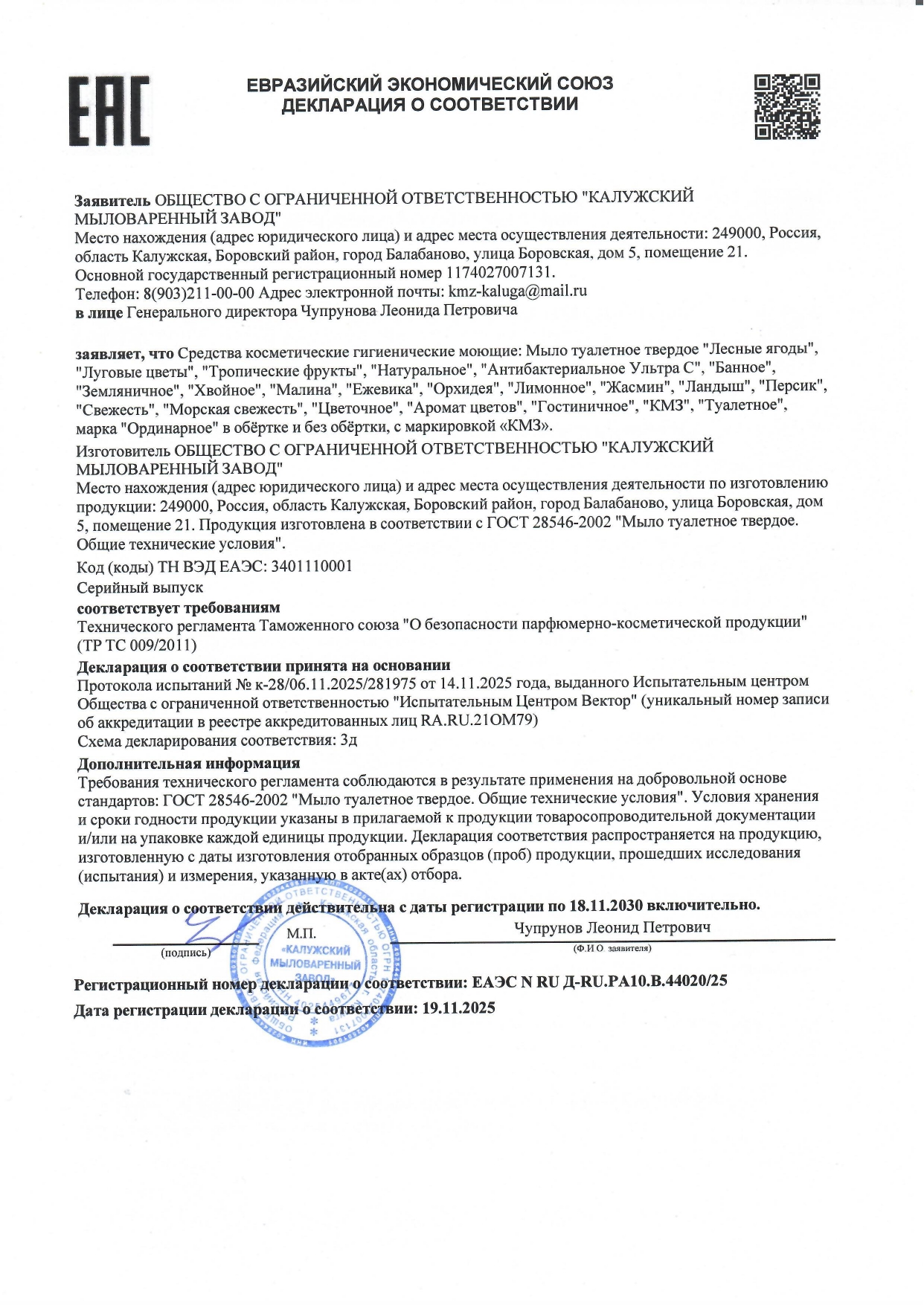 Мыло туалетное 200 г "Земляничное", КМЗ, ординарное, цветная обертка Код товара: 702582 59,4 ₽ Купить Производитель:КМЗ Туалетное мыло прекрасно сочетает в себе хорошее моющее свойство с благотворным влиянием на кожу. Предназначено для мытья рук и тела. Глицерин, входящий в состав туалетного мыла, смягчает и увлажняет кожу. Изготовлено из натуральных жиров и масел. Состав: натриевые соли жирных кислот натуральных пищевых жиров, пальмового и кокосового масел, вода, парфюмерная композиция, глицерин,хлорид натрия, Антал-П2, диоксид титана.Производство: РоссияТип: туалетноеВес: 200 гОтдушка: ЗемляникаЭффект от использования: увлажнениеКоличество в упаковке: 1 шт.Марка: ОрдинарноеТовар относится к сегменту ЭКОНОМ: даВид упаковки: полиэтиленСрок годности: 36 месРазмер упаковки: 5.5 × 9 × 3.5 смОбъём: 0.0002 м3Промежуточная упаковка: 40 штТранспортная упаковка: 40 штШтрих-код: 4627151992068 Сертификат-1.jpg Сертификат-2.jpg Сертификат-3.jpg
