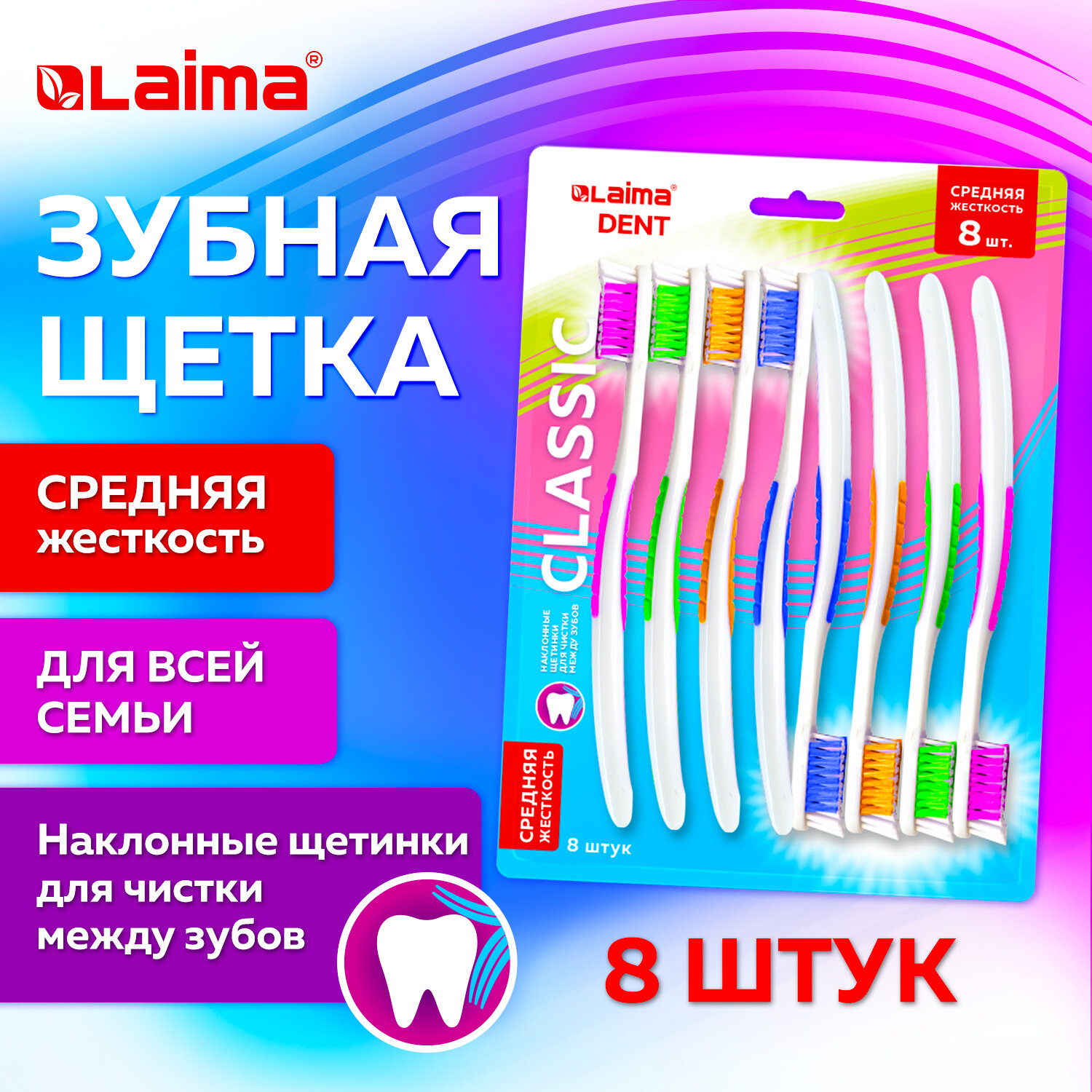 Зубная щетка средней жесткости CLASSIC, КОМПЛЕКТ 8 шт., LAIMA DENT Код товара: 609314 213,43 ₽ Купить Производитель:LAIMA DENT Зубная щетка LAIMA DENT "CLASSIC"– идеальный выбор для всей семьи! Обеспечивает качественную гигиену полости рта. Щетина средней жесткости обеспечивает максимальное очищение, щетинки эффективно удаляют налет и бактерии, предотвращая кариес и зубной камень Компактная головка щетки легко проникает в труднодоступные места. Удобная ручка для комфортного захвата. Важно! Перед использованием новую зубную щетку промыть в теплой воде (не более 60 °С) с мылом. Более высокая температура воды может деформировать материал щетки и её ручки. Во время использования рекомендуется хранить щетку в вертикальном положении, щетиной вверх. Рекомендуемый срок службы зубной щетки – 2-3 месяца.Производство: КитайТип товара: зубная щеткаЖесткость щетины: средняяПрорезиненная вставка на рукоятке : даКоличество в упаковке: 8 шт.Особенности щетки: наклонные щетинкиСерия: DENT SETВозрастная группа: взрослаяВес: 168 грРазмер упаковки: 1.5 × 24.4 × 18 смОбъём: 0.0009 м3Промежуточная упаковка: 12 штТранспортная упаковка: 72 штШтрих-код: 4606224439426 Сертификат-1.jpg Сертификат-2.jpg