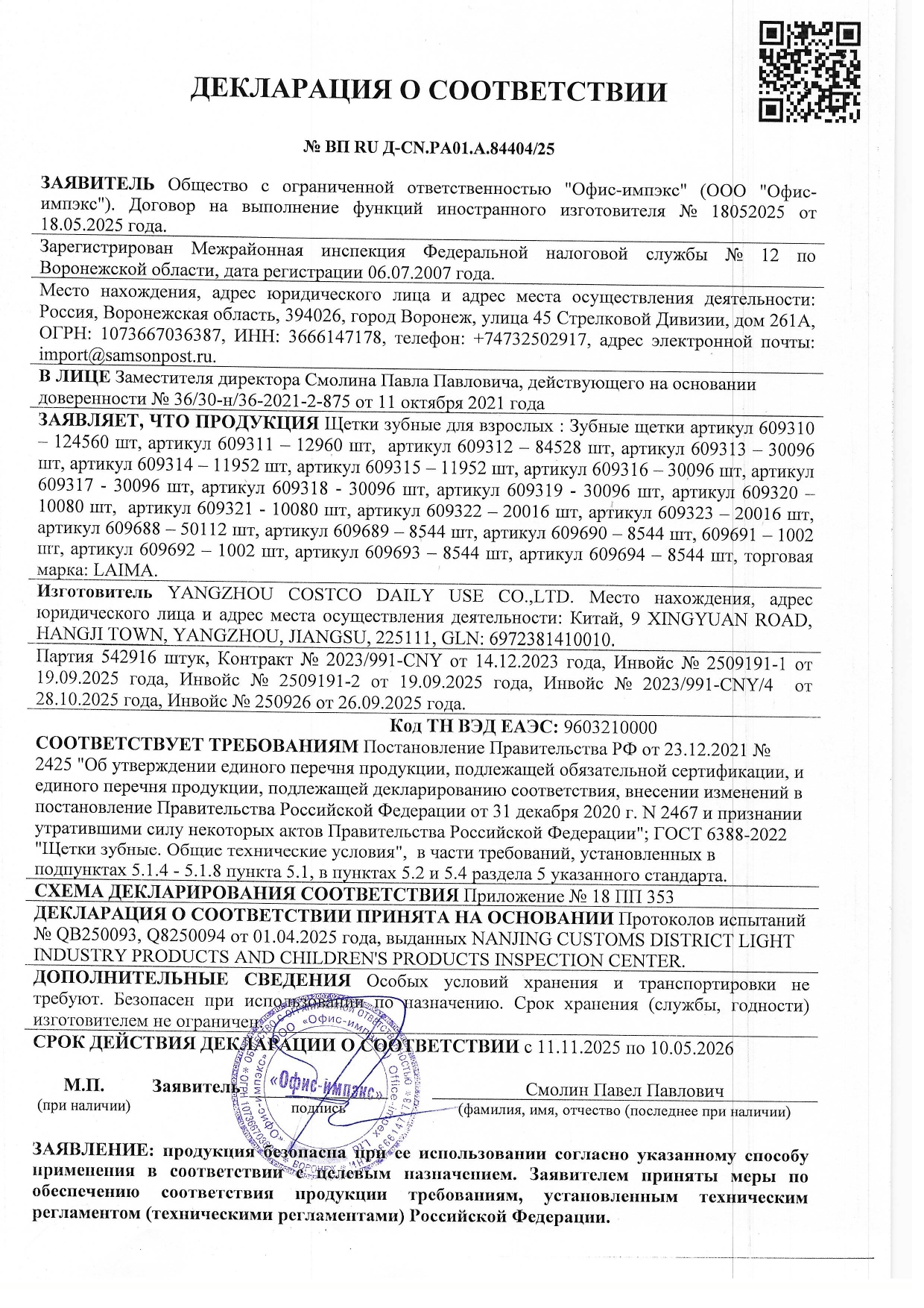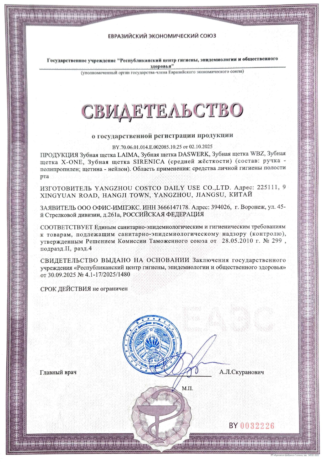 Зубная щетка средней жесткости, щетинки с угольным напылением, КОМПЛЕКТ 2 шт., LAIMA DENT Код товара: 609319 99,22 ₽ Купить Производитель:LAIMA DENT Набор зубных щёток LAIMA – это идеальное решение для ухода за полостью рта и сохранения здоровья зубов! В комплект входят 2 зубные щетки, подходящие как для взрослых, так и для детей. Угольные щетинки средней жесткости обеспечивают деликатное очищение. Каждая щетка эффективно удаляет налет и бактерии, предотвращая кариес и зубной камень. Компактная головка щетки легко проникает в труднодоступные места, а удобная пластиковая ручка обеспечивает комфортный захват. Важно! Перед использованием новую зубную щетку промыть в теплой воде (не более 60 °С) с мылом. Более высокая температура воды может деформировать материал щетки и её ручки. Во время использования рекомендуется хранить щетку в вертикальном положении, щетиной вверх. Рекомендуемый срок службы зубной щетки – 2-3 месяца.Производство: КитайТип товара: зубная щеткаЖесткость щетины: средняяНаличие скребка для языка: даПрорезиненная вставка на рукоятке : даКоличество в упаковке: 2 шт.Особенности щетки: с угольным напылениемСерия: DENT SETВозрастная группа: взрослаяВес: 49 грРазмер упаковки: 1.5 × 24.1 × 6 смОбъём: 0.0004 м3Промежуточная упаковка: 12 штТранспортная упаковка: 144 штШтрих-код: 4606224439471 Сертификат-1.jpg Сертификат-2.jpg