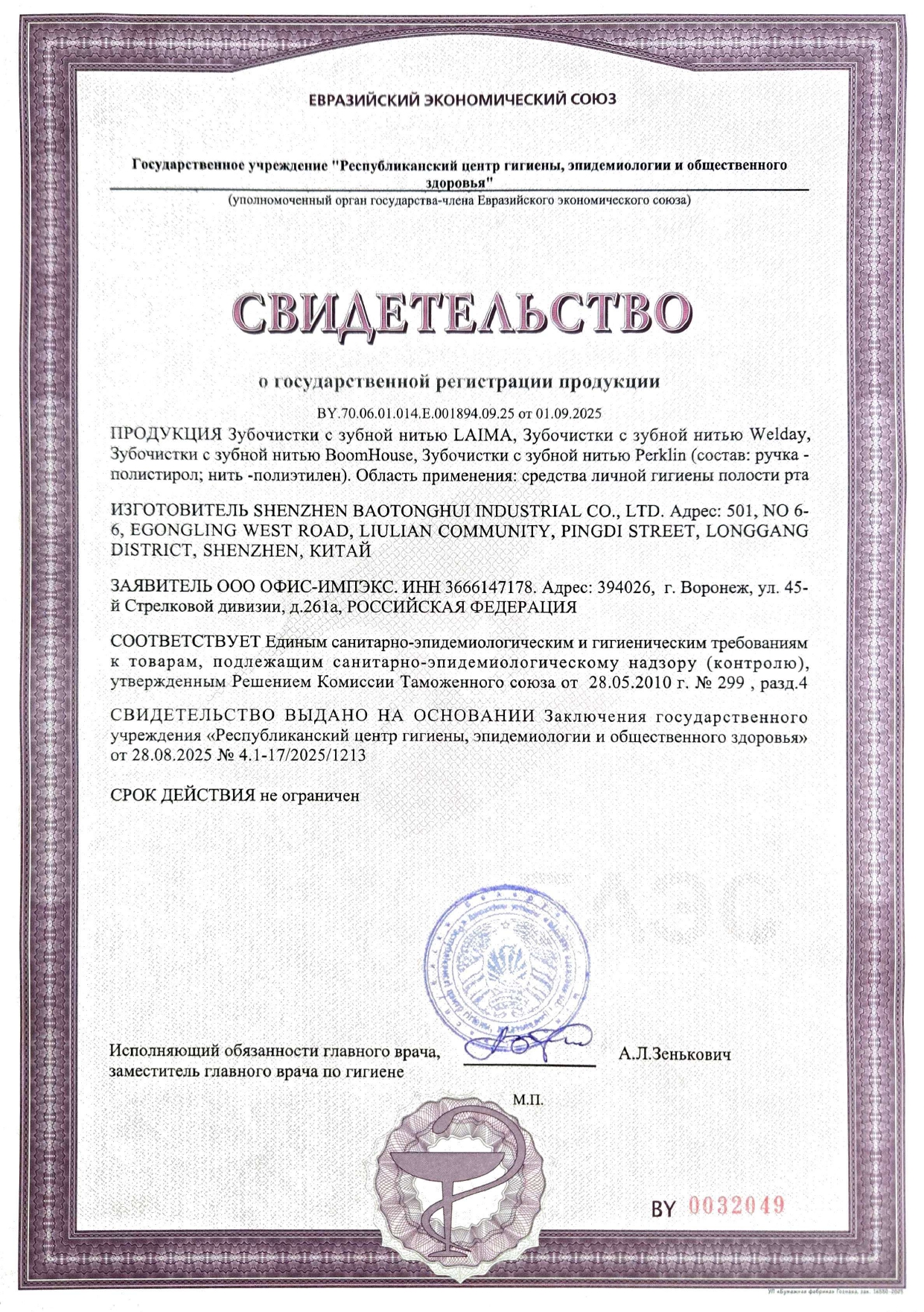 Зубочистки-флоссеры с зубной нитью "150 шт. + 5 шт. в подарок!", ВКУС МЯТЫ, зиплок-пакет, LAIMA DENT Код товара: 609403 158,33 ₽ Купить Производитель:LAIMA DENT Зубочистки-флоссеры с зубной нитью предназначены для ежедневного ухода за полостью рта, предотвращают кариес и неприятный запах во рту. В комплекте 150 (+5) зубочисток-флоссеров с ароматом мяты, упакованных в удобный пакет с многоразовой застежкой. Зубочистки-флоссеры изготовлены из полистирола (ручка) и полиэтилена (нить). Прочные и безопасные благодаря гибкой структуре материала. Совмещают в себе две функции: зубочистку и зубную нить. С одной стороны ручка эргономичной формы имеет заостренный плоский конец, а с другой стороны – мягкую и прочную зубную нить. Зубочистки-флоссеры с зубной нитью – незаменимое средство для бережной очистки межзубных пространств от остатков пищи и зубного налета.Производство: КитайТип товара: зубочистки-флоссерыКоличество в упаковке: 155 шт.Длина: 76 ммДвусторонние: даАромат: мятаМатериал: полистирол и полиэтиленУпаковка: зиплок-пакетВес: 91 грРазмер упаковки: 2.4 × 17.4 × 14.7 смОбъём: 0.0004 м3Промежуточная упаковка: 100 штТранспортная упаковка: 100 штШтрих-код: 4606224440774 Сертификат-1.jpg Сертификат-2.jpg