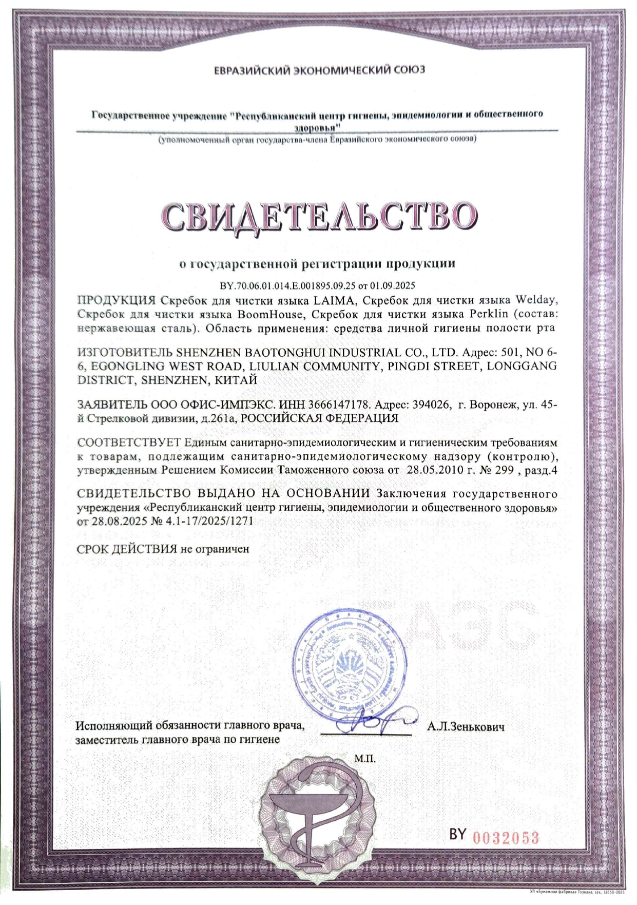 Скребок для языка из нержавеющей стали, КОМПЛЕКТ 2 шт. (большой и малый), с футляром, LAIMA DENT Код товара: 609409 167,69 ₽ Купить Производитель:LAIMA DENT Скребки для очищения языка предназначены для ежедневного ухода за полостью рта, эффективно удаляют налёт, бактерии и предотвращают неприятный запах во рту. Способствуют гигиене и профилактике болезней ротовой полости. В комплекте два скребка разного размера: большой скребок (размер: 147x36 мм) и малый скребок (размер: 146x23 мм). Упакованы в удобный металлический футляр и картонную коробку. Скребки изготовлены из нержавеющей стали SUS 420. Прочные, безопасные и комфортные в использовании благодаря анатомической форме и качеству используемого материала. Имеют две стороны: одна – для бережной очистки, вторая – для интенсивной. Легко моются и дезинфицируются. Скребки для очищения языка – незаменимое средство для бережной очистки языка и поддержания гигиены ротовой полости.Производство: КитайТип товара: скребки для языкаКоличество в упаковке: 2 шт.Длина: 147 ммШирина: 36 ммДвусторонние: даНаличие футляра: даМатериал: стальСерия: DENTУпаковка: металлический футлярВес: 81 грРазмер упаковки: 2.1 × 18.1 × 4 смОбъём: 0.0002 м3Промежуточная упаковка: 100 штТранспортная упаковка: 100 штШтрих-код: 4606224440835 Сертификат-1.jpg Сертификат-2.jpg