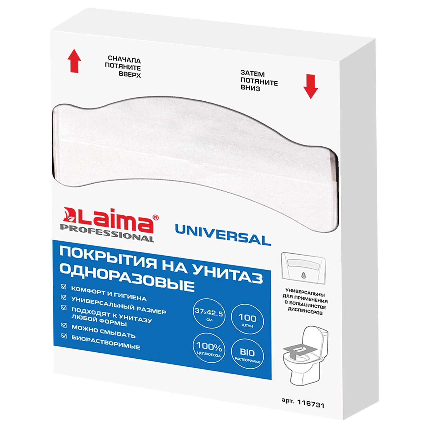 Покрытия на унитаз UNIVERSAL, 1/4 сложения, LAIMA, 14 г/м2, КОМПЛЕКТ 100 шт., 37х42,5 см Код товара: 116731 179,35 ₽ Купить Производитель:LAIMA Покрытия на унитаз LAIMA PROFESSIONAL обеспечивают высокую гигиеничность во время посещений туалетных комнат в общественных местах. Защищают кожу от контакта с грязью и бактериями. Универсальный размер. Сочетаются с диспенсерами других производителей. Предназначены для одноразового использования. Подходят к унитазам любой формы. Изготовлены из 100% целлюлозы белого цвета. Тип сложения – 1/4. В упаковке 100 покрытий для унитаза. Размер листа – 37х42,5 см.Производство: КитайТип сложения: 1/4Количество в комплекте: 100 шт.Длина покрытия: 42.5 смШирина покрытия: 37 смМожно смывать в унитаз: даКоличество комплектов: 1 шт.Сочетаются с оборудованием других производителей: даМатериал: 100% целлюлозаЦвет: белыйСерия: UNIVERSALАртикул: 116731Диспенсерная система: нетШирина пачки: 20 смВысота пачки: 25 смГлубина пачки: 2 смВес: 265 грРазмер упаковки: 2.4 × 25.5 × 18.5 смОбъём: 0.0011 м3Промежуточная упаковка: 24 штТранспортная упаковка: 24 штШтрих-код: 4606224477619