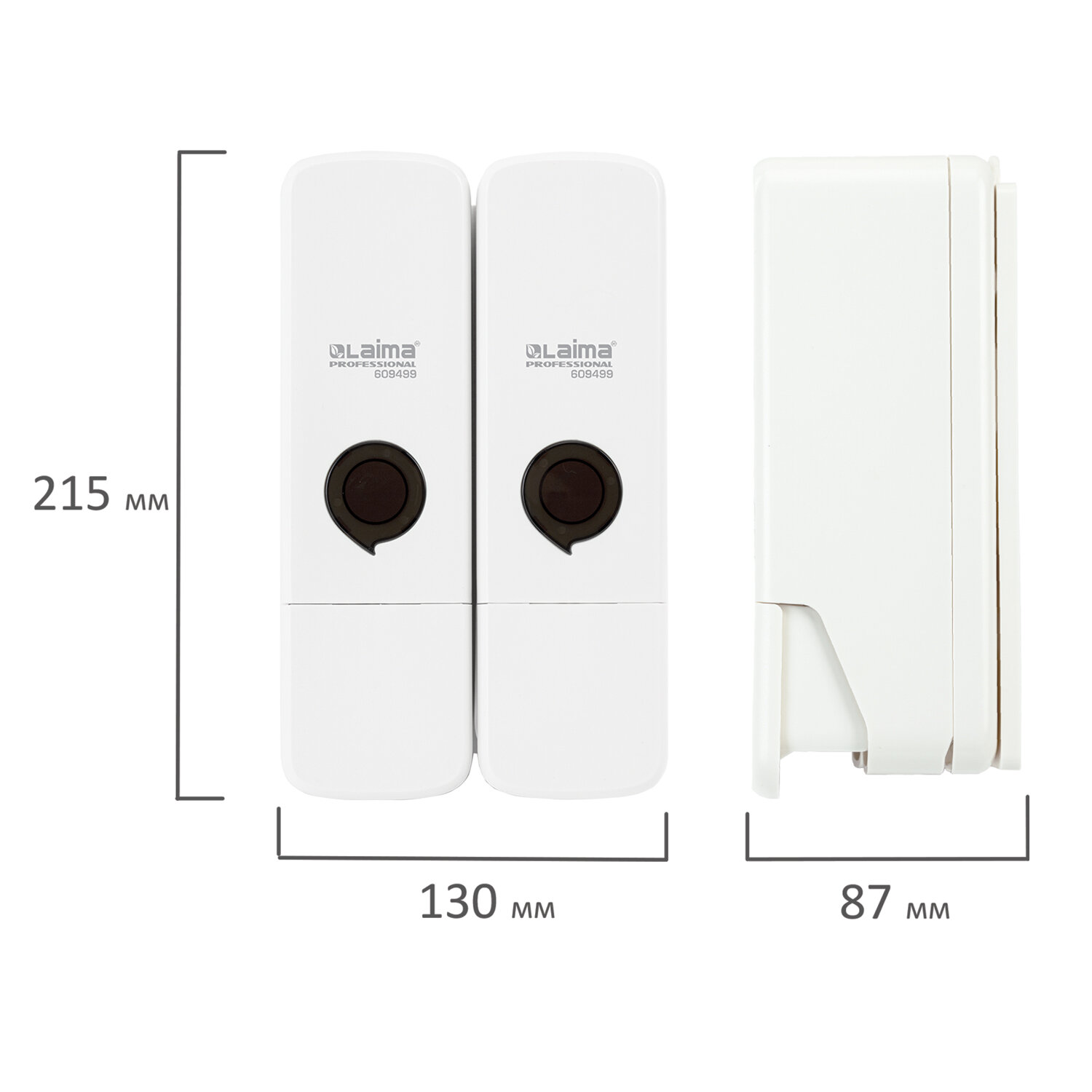 Дозатор двойной 2 х 0,3 л для жидкого мыла/шампуня/геля LAIMA PREMIUM, НАЛИВНОЙ, белый, ABS-пластик Код товара: 609499 1 490,54 ₽ Купить Производитель:LAIMA Дозатор двойной для жидкого мыла/шампуня/геля LAIMA объёмом 2 х 0,3 л прекрасно подойдёт для использования как в бытовых условиях, так и в общественных местах, где необходимо применение двух моющих средств разного типа одновременно. Дозатор изготовлен из АБС-пластика. Сдвоенный с двумя контейнерами для расходных материалов объёмом 0,3 л каждый. Для удобства в комплект входят наклейки с обозначением пяти видов моющих средств: жидкое мыло, гель для душа, шампунь, кондиционер, для посуды. Пользователь в соответствии со своими потребностями может выбрать нужные стикеры и наклеить их на дозаторы. Кроме того, стикеры задублированы на русском и английском языках. В комплект поставки входит набор для монтажа на стену со сверлением стены и без сверления (шурупы с пластиковыми дюбелями и монтажная пластина с клеевым слоем).Производство: КитайОбъем: 0.6 лТип диспенсера: наливной для жидкого мылаАртикул: 609499Серия: PremiumДиспенсерная система: нетУправление: механическоеИндикаторы: окно для контроля уровня мылаКомплектация: крепежные материалыКоличество режимов дозирования: 1Сочетается с расходными материалами других производителей: даМатериал замка: пластикМатериал корпуса: ударопрочный пластик ABSЦвет корпуса: белыйШирина: 130 ммВысота: 215 ммГлубина: 87 ммВес: 746 грРазмер упаковки: 9.4 × 22.7 × 14.2 смОбъём: 0.0035 м3Промежуточная упаковка: 30 штТранспортная упаковка: 30 штШтрих-код: 4606224447940 Сертификат-1.jpg Сертификат-2.jpg Сертификат-3.jpg