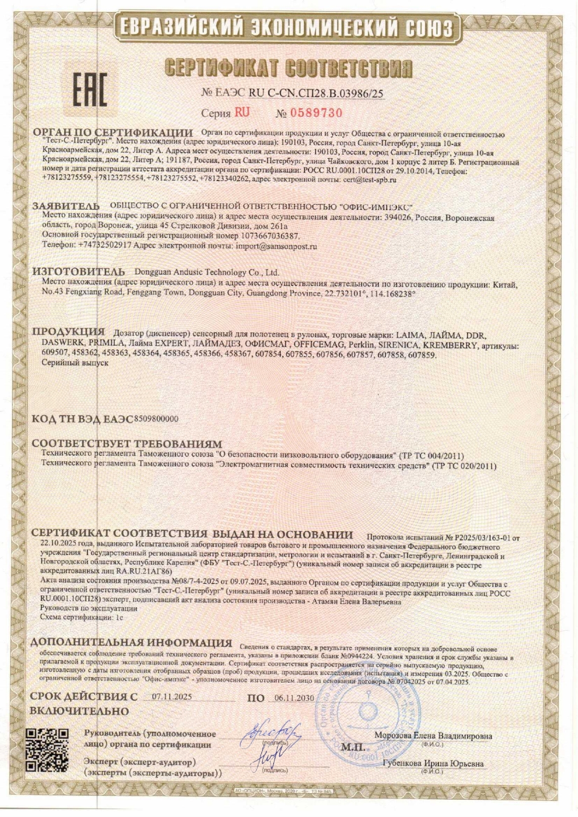 Диспенсер для полотенец в рулонах LAIMA PROFESSIONAL SUPER (H1), СЕНСОРНЫЙ, белый, ABS-пластик Код товара: 609507 7 980,73 ₽ Купить Производитель:LAIMA Сенсорный диспенсер для полотенец в рулонах LAIMA PROFESSIONAL SUPER предназначен для автоматической подачи бумажных полотенец. Обеспечивает высокий уровень гигиены. Антивандальный корпус изготовлен из ударопрочного ABS-пластика. Позволяет использовать 1 рулон бумажных полотенец системы H1. Имеет световой индикатор контроля остатка полотенец и возможность регулировки длины выдаваемого полотенца. Питание осуществляется от 4 батареек LR20, а также возможно подключать к электрической сети через кабель питания (входит в комплект). Сочетается с расходными материалами других производителей. Зона чувствительности сенсора – 9 см. Подача полотенца осуществляется как при поднесении рук к сенсору, так и при нажатии на кнопку. Возможна настройка автоматической подачи полотенца сразу после отрывания предыдущего. Тип закрывания – пластиковый ключ. Самозахлопывающийся замок. Размер – 350х280х225 мм. Устройство представлено в современном дизайне. Отвечает всем требованиям гигиены. Данный товар сочетает в себе высокое качество по доступной цене.Производство: КитайДиспенсерная система: Н1Вид расходных материалов: рулонныйПодходят бумажные полотенца: полотенца в рулонеРежим подачи полотенец: от кнопки, при отрывании предыдущего, сенсорныйИндикаторы: световой индикатор замены элементов питания, световой индикатор контроля остатка полотенецВместимость полотенец: 1 пач./рулоновАнтивандальный корпус: даТип закрывания: пластиковый ключКомплектация: крепежные материалыТип элемента питания: 220 В или 4 батарейки LR20Сочетается с расходными материалами других производителей: даВозможность регулировки длины выдаваемого полотенца: даЗона чувствительности сенсора: 9 смСамозахлопывающийся замок: даМатериал замка: пластикПитание: от сети, элементы питанияМатериал корпуса: ударопрочный пластик ABSАртикул: 609507Серия: SUPERЦвет корпуса: белый/серыйШирина: 280 ммВысота: 350 ммГлубина: 225 ммВес: 3,3 кгРазмер упаковки: 25.6 × 39 × 31.8 смОбъём: 0.0367 м3Промежуточная упаковка: 4 штТранспортная упаковка: 4 штШтрих-код: 4606224448022 Файлы Сертификат-1.jpg Сертификат-2.jpg Сертификат-3.jpg Сертификат-4.jpg