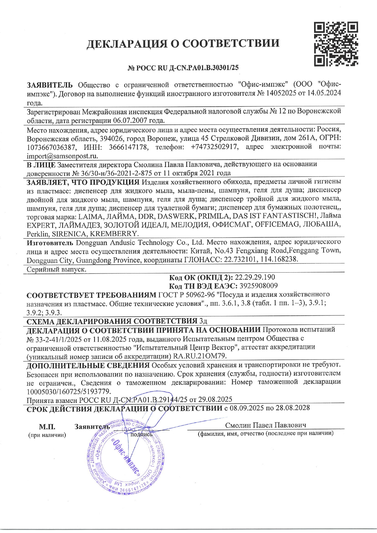 Диспенсер для полотенец LAIMA PROFESSIONAL PREMIUM (Система H2), Z-сложения, белый, ABS-пластик Код товара: 609515 1 034,27 ₽ Купить Производитель:LAIMA Диспенсер для бумажных полотенец LAIMA PROFESSIONAL PREMIUM подходит для использования в местах с небольшой и средней проходимостью, таких как туалетная комната в ресторане, кафе, офисе и т. д. Отличается высокими эксплуатационными характеристиками. Антивандальный корпус изготовлен из ударопрочного ABS-пластика. Диспенсер обеспечивает высокий уровень гигиены и комфортную подачу полотенец. Имеется окошко для контроля остатка полотенец. Сочетается с расходными материалами других производителей. Оборудован самозахлопывающимся замком с ключом. В комплект входят крепежные материалы для установки. Преимущества диспенсера для бумажных полотенец LAIMA PROFESSIONAL PREMIUM: 1) Гигиеничность. Бумажные полотенца находятся внутри корпуса, их не касаются руки пользователей, на них не попадает грязь и капли воды. 2) Стильный и элегантный корпус диспенсера прекрасно впишется в интерьер помещения. 3) Легкость и простота в эксплуатации, не требует особого ухода. 4) Надежность конструкции.Производство: КитайДиспенсерная система: Н2Вид расходных материалов: листовойПодходят бумажные полотенца: Interfold, Multifold, Singlefold, ZРежим подачи полотенец: ручнойИндикаторы: окно для контроля заполненияВместимость полотенец: 1 пач./рулоновАнтивандальный корпус: даТип закрывания: пластиковый ключКомплектация: крепежные материалыТип элемента питания: нетСочетается с расходными материалами других производителей: даЗона чувствительности сенсора: 0 смСамозахлопывающийся замок: даМатериал замка: пластикМатериал корпуса: ударопрочный пластик ABSАртикул: 609515Серия: PremiumЦвет корпуса: белыйШирина: 260 ммВысота: 205 ммГлубина: 100 ммВес: 794 грРазмер упаковки: 10.8 × 27 × 21.8 смОбъём: 0.0075 м3Промежуточная упаковка: 20 штТранспортная упаковка: 20 штШтрих-код: 4606224448107 Сертификат-1.jpg Сертификат-2.jpg Сертификат-3.jpg