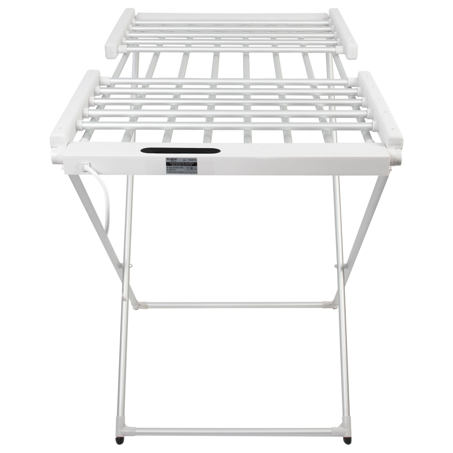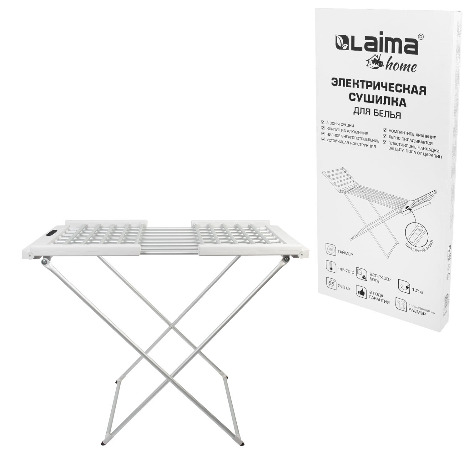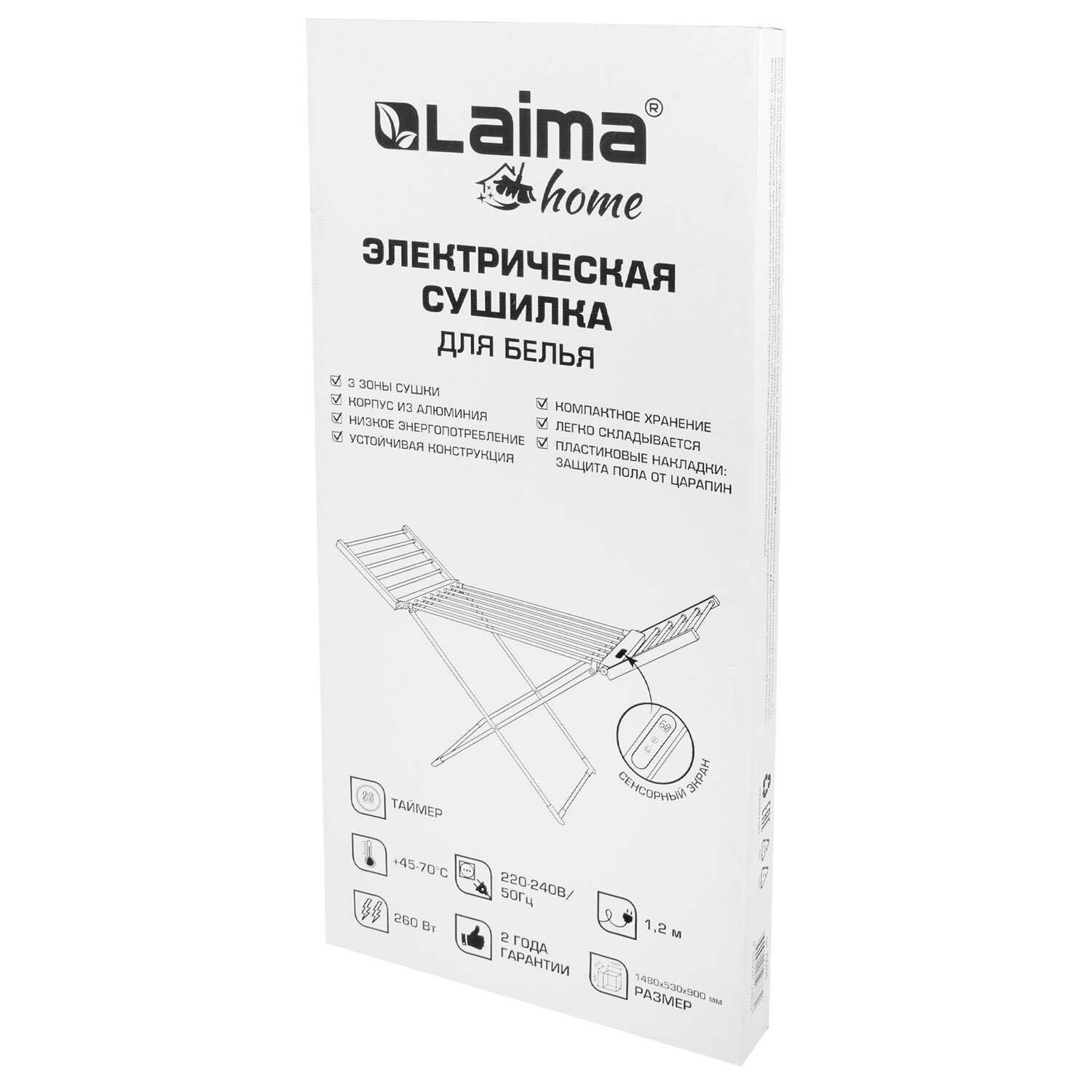 Сушилка для белья напольная, электрическая, раскладная, 3 зоны сушки, алюминиевая, таймер/регулировка темп. 45-70 °С, LAIMA HOME Код товара: 700979 5 785,4 ₽ Купить Производитель:LAIMA Напольная электрическая сушилка для белья с таймером и регулировкой температуры LAIMA HOME – ваш идеальный помощник в уходе за одеждой. Забудьте о долгом ожидании, пока ваши вещи высохнут на воздухе! Раскладная электрическая напольная сушилка для белья LAIMA HOME с таймером и регулировкой нагрева от +45 до +70 °C станет незаменимым атрибутом в вашем доме, обеспечивая быструю, эффективную и бережную сушку одежды в любое время года. Раскладная конструкция позволяет легко хранить сушилку, когда она не используется, а также быстро разложить ее в нужный момент. Три зоны для сушки позволяют одновременно сушить большое количество белья, включая крупные вещи, такие как простыни, пододеяльники и полотенца. Резиновые вставки на ножках обеспечивают устойчивость сушилки и предотвращают скольжение. • Технические характеристики: - Мощность – 260 Вт; - Напряжение – 220–240 В; - Частота – 50 Гц; - Вес сушилки – 2,4 кг; - Максимальная нагрузка – 10 кг; - Длина сетевого шнура – 120 см; - Таймер – 1-24 ч.; - Регулировка нагрева – 45–70°С.Производство: КитайТип товара: сушилка для белья электрическаяМаксимальная нагрузка: 10 кгПолезная длина сушки: 11.5 мРегулировка температуры: даШирина: 148 смВысота: 90 смГлубина: 53 смОсобенности: легко складывается, удобно транспортировать, удобно хранитьСерия: HomeМатериал: алюминийВес: 3,5 кгРазмер упаковки: 7.2 × 109 × 53.3 смОбъём: 0.046 м3Промежуточная упаковка: 5 штТранспортная упаковка: 5 штШтрих-код: 4606224508832 Файлы Сертификат-1.jpg Сертификат-2.jpg Сертификат-3.jpg Сертификат-4.jpg Сертификат-5.jpg Сертификат-6.jpg Сертификат-7.jpg