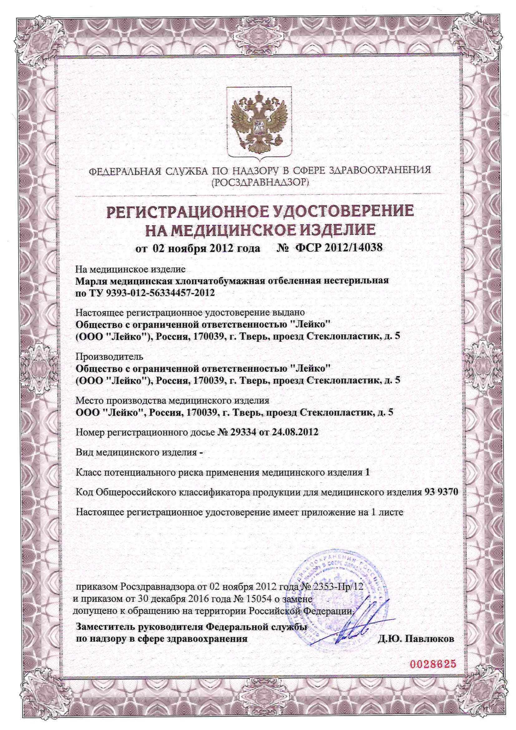Марля медицинская отбеленная в рулоне, 0,9х1000 м, плотность 28 (± 2) г/м2, ЛЕЙКО Код товара: 631666 19 710 ₽ Купить Производитель:Лейко Отрез марлевый медицинский нестерильный размером 1000 м х 90 см, 1 штука в индивидуальной упаковке. Может быть использован в медицинских учреждениях и домашних условиях для изготовления персональных перевязочных материалов. • Состав: марля медицинская хлопчатобумажная отбеленная (100% хлопок). Отрезы марлевые медицинские нестерильные, изготовленные по ТУ 9393-013-56334457-2012, плотность – 28 г/м2 (± 2). Представляет собой ровный кусок хлопчатобумажной гигроскопичной марлевой ткани простого полотняного плетения, индивидуально упакованный в полиэтиленовый пакет. Отрезы могут быть использованы в стационарных, амбулаторных медицинских учреждениях и в домашних условиях. Отбеливается без использования хлора. • Показания: отрезы предназначены для изготовления сорбционных перевязочных средств: салфеток, шариков и турунд, а также ватно-марлевых повязок. • Противопоказания: индивидуальная непереносимость материалов изделия. • Особые условия хранения: хранить в сухом, проветриваемом помещении на расстоянии не менее 1 м от отопительных приборов. • Срок годности: 5 лет при соблюдении условий хранения в невскрытой упаковке производителя. • Страна производителя: Россия.Производство: РоссияТип: марля в отрезахРазмер: 100000х90 смКоличество слоев: 1Плотность: 28 г/м2Количество в комплекте: 1 шт.Формат: рулонСрок годности: 60 месВес: 21,16 кгРазмер упаковки: 30.5 × 93.5 × 30.5 смОбъём: 0.087 м3Промежуточная упаковка: 1 штТранспортная упаковка: 1 штШтрих-код: 4603736527740 Файлы Сертификат-1.jpg Сертификат-2.jpg Сертификат-3.jpg Сертификат-4.jpg Сертификат-5.jpg Сертификат-6.jpg Сертификат-7.jpg Сертификат-8.jpg Сертификат-9.jpg Сертификат-10.jpg Сертификат-11.jpg Сертификат-12.jpg Сертификат-13.jpg Сертификат-14.jpg Сертификат-15.jpg Сертификат-16.jpg Сертификат-17.jpg Сертификат-18.jpg Сертификат-19.jpg Сертификат-20.jpg Сертификат-21.jpg Сертификат-22.jpg Сертификат-23.jpg Сертификат-24.jpg Сертификат-25.jpg