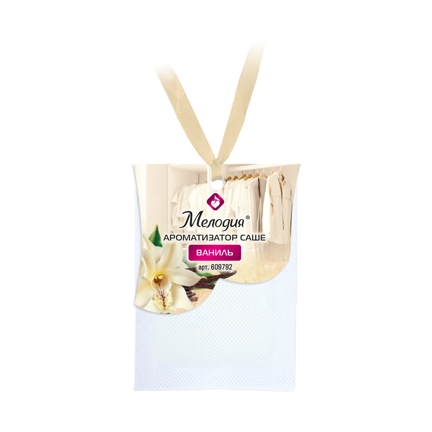Ароматизатор / освежитель саше для помещений, шкафов, комодов, автомобиля, 20 г, МЕЛОДИЯ "Ваниль" Код товара: 609792 54,36 ₽ Купить Производитель:МЕЛОДИЯ Превратите свое пространство в оазис гармонии с ароматическими саше МЕЛОДИЯ. Ароматизатор саше МЕЛОДИЯ окутывает стойким приятным ароматом на длительный срок. Многофункциональность: идеально для ароматизации одежды, белья, книжных полок, ящиков стола или салона автомобиля. Стойкий аромат: создайте в шкафу или небольшом помещении приятный долгий запах. Удобство: компактный мешочек можно разместить где угодно, не опасаясь пролить или просыпать содержимое. Способ применения: достаньте пакетик с ароматическим саше из упаковки. Внимание! Бумажный пакетик с ароматическим саше не вскрывать! Положите саше в ящик для белья, комод или повесьте в платяной шкаф при использовании в качестве инсектицида или средства от моли. Состав: >30% этиленвинилацетат, отдушка.Производство: КитайТип товара: аромасашеОтдушка: ВанильСерия: АроматизаторыОбъем/вес: 20 мл/гПлощадь звучания: 0 м2Упаковка: сашеСрок годности: 48 месВес: 22 грРазмер упаковки: 0.9 × 15.4 × 10 смОбъём: 0.0001 м3Промежуточная упаковка: 200 штТранспортная упаковка: 800 штШтрих-код: 4606224460185 Сертификат-1.jpg Сертификат-2.jpg