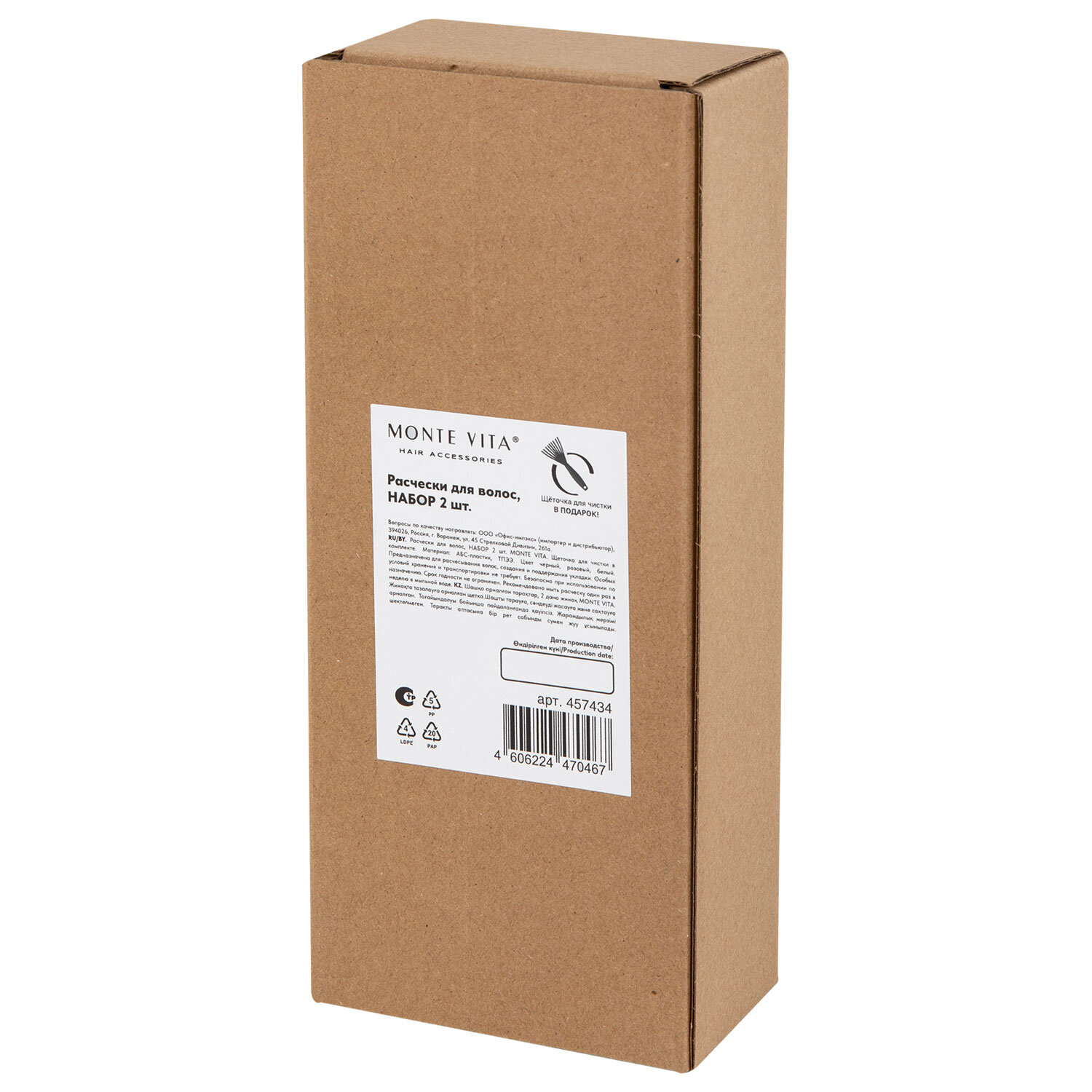 Расческа для волос массажная 20х8,5 см, НАБОР 2 шт. + щетка для чистки В ПОДАРОК, MONTE VITA (МОНТЕ ВИТА), 457434 Код товара: 457434 399,62 ₽ Купить Производитель:MONTE VITA Расческа MONTE VITA – это не просто аксессуар, а незаменимый инструмент для ухода за волосами. Применяется для массажа головы, расчесывания волос, создания прически. Практичный комплект для разных задач и стилей. Каждая из расчесок выполнена с уникальной перфорированной основой, равномерно распределяющей потоки горячего воздуха во время сушки. Такая конструкция предотвращает перегрев и защищает структуру волос. Гибкие зубчики из TPEE мягко фиксируют пряди, позволяя легко создавать как прямые укладки, так и легкие волны с естественным блеском. Эргономичная форма гарантирует удобный хват и комфорт при использовании, антистатический эффект минимизирует наэлектризованность волос. Универсальная щеточка предназначена для быстрой очистки обеих щеток. В наборе: • Продувная расческа – 2 шт. • Щеточка – 1 шт.Производство: КитайТип расчески: продувнаяНазначение: массаж, распутывание волос, сушкаМатериал: ABS-пластик/TPEEЦвет: ассортиНабор: даСостав набора: продувная расческа - 2 шт. + щетка для чисткиРазмер: 20х8,5 смСерия: РасческиУпаковка: гофрокоробВес: 151 грРазмер упаковки: 5.3 × 21.6 × 9.4 смОбъём: 0.0014 м3Промежуточная упаковка: 48 штТранспортная упаковка: 48 штШтрих-код: 4606224470467 Файлы Сертификат-1.jpg Сертификат-2.jpg Сертификат-3.jpg Сертификат-4.jpg Сертификат-5.jpg Сертификат-6.jpg Сертификат-7.jpg Сертификат-8.jpg Сертификат-9.jpg Сертификат-10.jpg Сертификат-11.jpg Сертификат-12.jpg Сертификат-13.jpg Сертификат-14.jpg Сертификат-15.jpg Сертификат-16.jpg Сертификат-17.jpg Сертификат-18.jpg Сертификат-19.jpg Сертификат-20.jpg Сертификат-21.jpg Сертификат-22.jpg Сертификат-23.jpg Сертификат-24.jpg Сертификат-25.jpg Сертификат-26.jpg