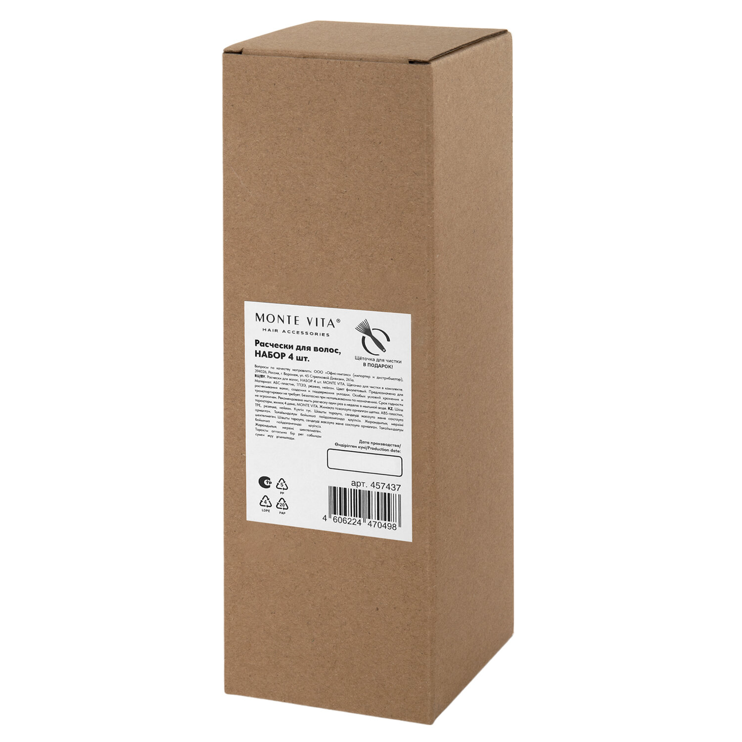 Расческа для волос НАБОР 4 шт + щетка для чистки В ПОДАРОК MONTE VITA (МОНТЕ ВИТА), 457437 Код товара: 457437 830,5 ₽ Купить Производитель:MONTE VITA Расческа MONTE VITA – это не просто аксессуар, а незаменимый инструмент для ухода за волосами. Применяется для массажа головы, расчесывания волос, создания прически. Полный арсенал для идеального ухода и укладки волос любого типа. В наборе четыре надежные расчески, каждая разработана для определенной задачи: расчесывания, объема, массажа или укладки с феном. Две классические расчески изготовлены из прочного и легкого ABS-пластика, устойчивого к царапинам и деформации. Нейлоновые зубчики закреплены на эластичной амортизирующей подушечке из мягкого TPEE, что обеспечивает бережный контакт с кожей головы и волосами. Такая конструкция предотвращает возникновение статического электричества при расчесывании и позволяет деликатно укладывать даже чувствительные или поврежденные волосы без дискомфорта. Скелетная расческа для безопасной укладки феном. Многочисленные вентиляционные отверстия оптимизируют поток горячего воздуха, ускоряя сушку и защищая волосы от перегрева. Брашинг быстро и равномерно распределяет тепло при сушке феном, предотвращая перегрев и сохраняя естественный блеск волос. Нейлоновая щетина создает объем у корней и стимулирует рост. Удобная ручка из ABS-пластика обеспечивает надежный контроль. В комплект входит компактная щеточка – она предназначена для быстрой, легкой очистки всех инструментов от волос. Идеально в качестве стартового набора или полезного подарка! В наборе: • Классическая расческа – 2 шт. • Скелетная расческа – 1 шт. • Брашинг – 1 шт. • Щеточка для очистки – 1 шт.Производство: КитайТип расчески: массажная/скелетная/брашингНазначение: выпрямление, массаж, разглаживание, сушка, укладкаМатериал: ABS-пластик/нейлонЦвет: фиолетовыйНабор: даСостав набора: массажная расческа - 2 шт. + скелетная расческа + брашинг + щетка для чисткиРазмер: 22,5x4,5 / 23x5 / 25х7 / 24,5x8,5 смСерия: РасческиУпаковка: гофрокоробВес: 373 грРазмер упаковки: 9.6 × 25.1 × 9.6 смОбъём: 0.0028 м3Промежуточная упаковка: 48 штТранспортная упаковка: 48 штШтрих-код: 4606224470498 Файлы Сертификат-1.jpg Сертификат-2.jpg Сертификат-3.jpg Сертификат-4.jpg Сертификат-5.jpg Сертификат-6.jpg Сертификат-7.jpg Сертификат-8.jpg Сертификат-9.jpg Сертификат-10.jpg Сертификат-11.jpg Сертификат-12.jpg Сертификат-13.jpg Сертификат-14.jpg Сертификат-15.jpg Сертификат-16.jpg Сертификат-17.jpg Сертификат-18.jpg Сертификат-19.jpg Сертификат-20.jpg Сертификат-21.jpg Сертификат-22.jpg Сертификат-23.jpg Сертификат-24.jpg Сертификат-25.jpg Сертификат-26.jpg