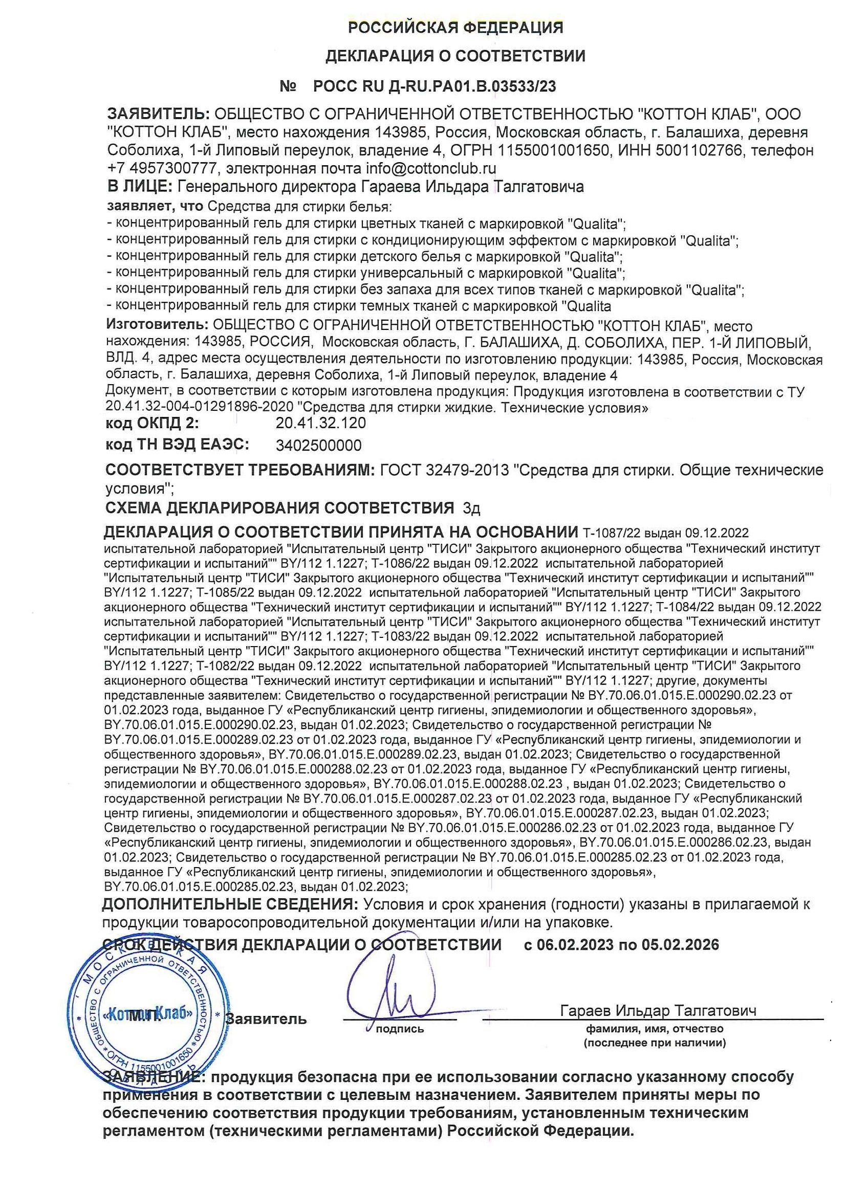 Гель для стирки цветного белья 3 л, QUALITA, концентрат, дой-пак Код товара: 702024 483,76 ₽ Купить Производитель:QUALITA Средство для ручной и машинной стирки изделий из различных видов тканей. Не содержит хлора. Входящие в состав компоненты сохраняют характеристики и качество тканей. • Особенности и преимущества: - эффективно устраняет загрязнения и сохраняет насыщенность цвета; - предназначен для стирки цветных изделий из всех типов тканей, кроме шелка и шерсти; - подходит для ежедневного применения. • Стирка в стиральной машине: добавить средство в отсек для основной стирки или непосредственно в барабан стиральной машины из расчета 30-100 мл на 4-5 кг сухого белья в зависимости от степени загрязнения. • Для ручной стирки: разбавить 10 мл средства на 10 л воды. Состав: меньше 5% АПАВ, меньше 5% НПАВ, меньше 5% мыло, оптический отбеливатель, растительный экстракт, отдушка, консервант. Содержит экстракт хлопка и ингибитор переноса красителя.Производство: РоссияТип: универсальныйОбъем/Вес: 3000 мл/гВид средства: гельНазначение: для цветного белья, кроме шерсти и шелкаОтдушка: нейтральнаяКоличество бункеров: 0 шт.Серия: COLORВид упаковки: дой-пакСрок годности: 36 месРазмер упаковки: 30.3 × 22.6 × 15.6 смОбъём: 0.0083 м3Промежуточная упаковка: 4 штТранспортная упаковка: 4 штШтрих-код: 4600999040542 Сертификат-1.jpg Сертификат-2.jpg