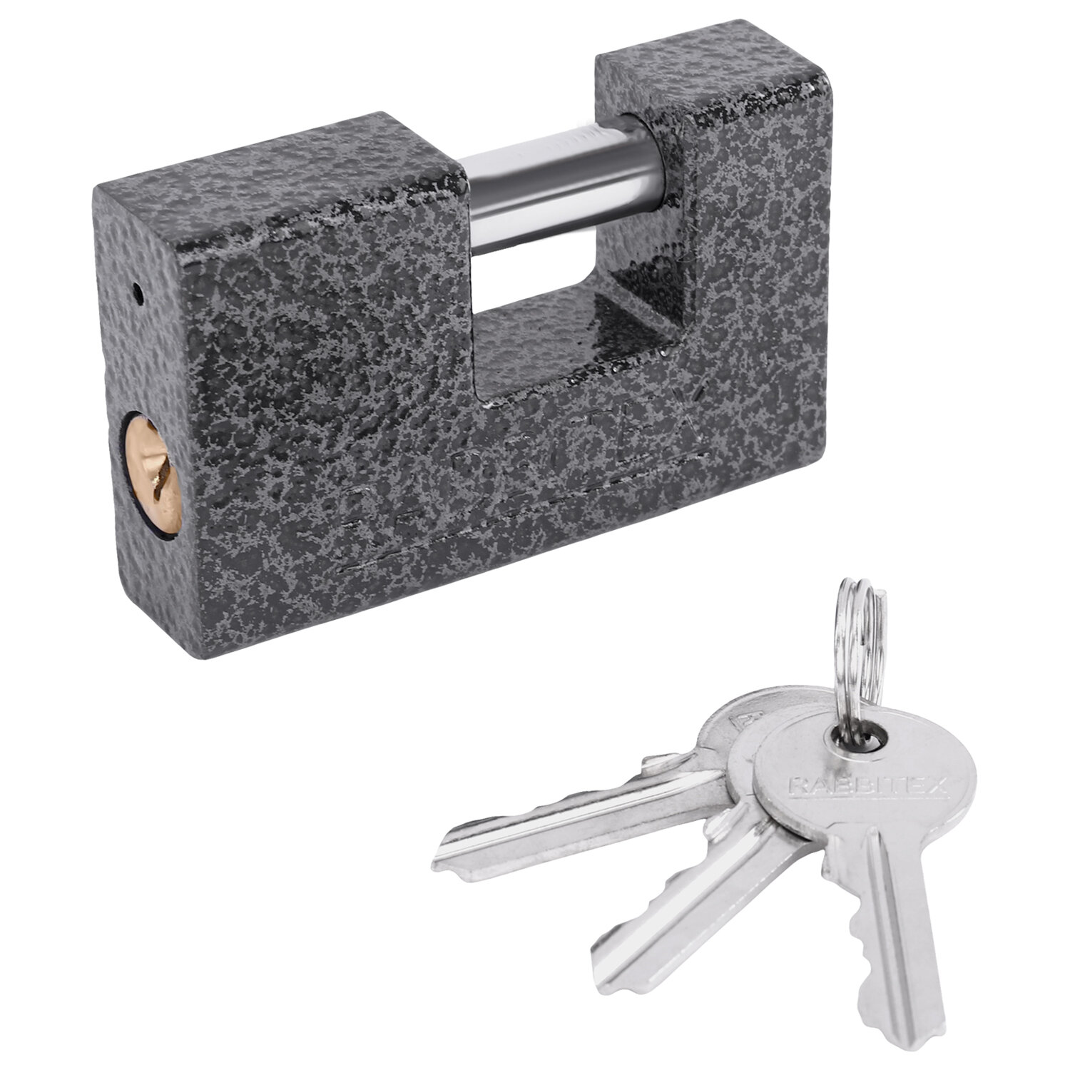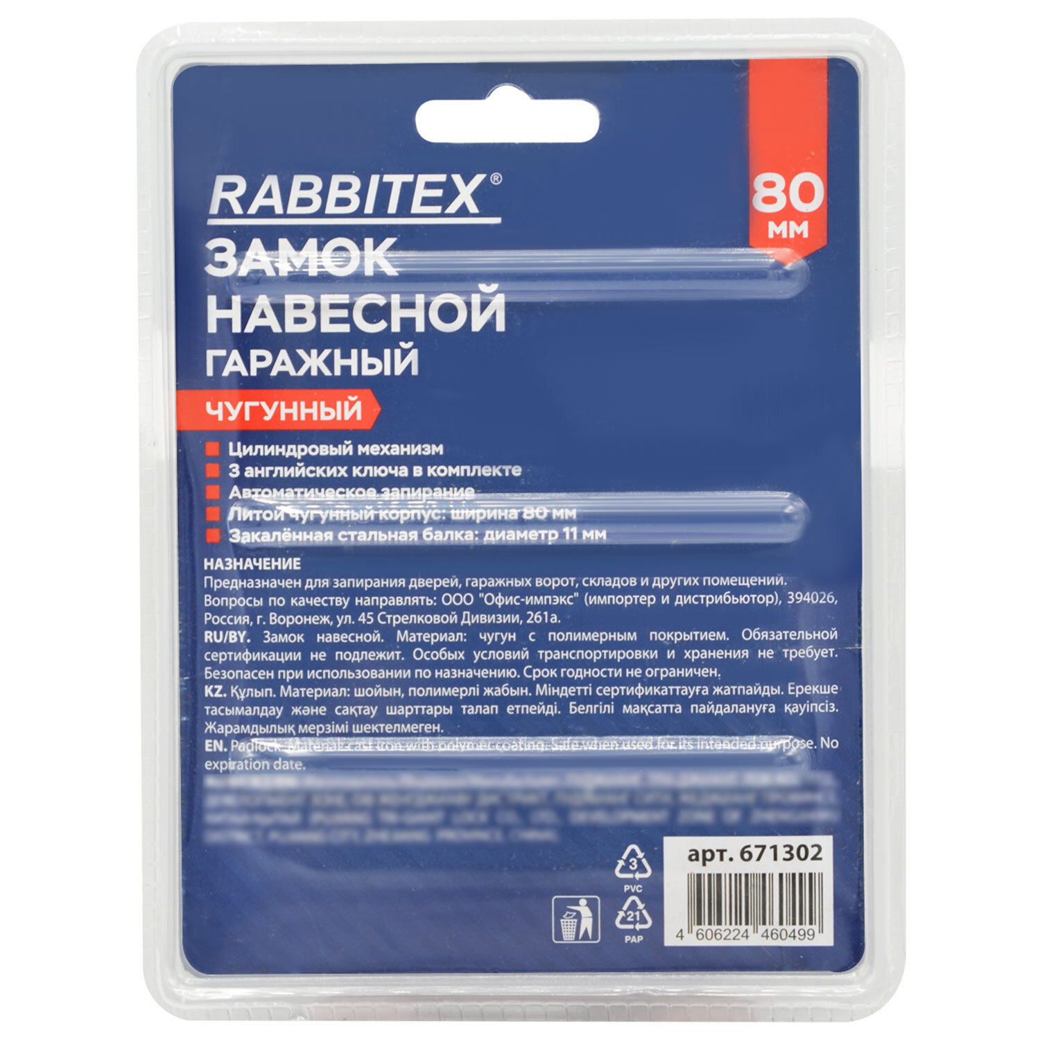 Замок навесной чугунный 80 мм "Гаражный" с полимерным покрытием, 3 ключа, RABBITEX (РАББИТЕКС) Код товара: 671302 494,51 ₽ Купить Производитель:RABBITEX Замок навесной RABBITEX с цилиндровым механизмом секретности предназначен для запирания дверей, гаражных ворот, складов и других помещений. Достаточно прост по конструкции и надёжен в повседневной эксплуатации. Замок навесной имеет литой чугунный корпус и оснащен закалённой стальной балкой, что делает его прочным и увеличивает сопротивляемость к взлому. Тип механизма секретности – цилиндровый. Три английских ключа в комплекте. Замок запирается автоматически (без использования ключа) при нажатии на балку, что облегчает его эксплуатацию. Большие размеры замка и толщина балки позволяют использовать его в качестве замка для калиток, складских и гаражных ворот и других помещений. Размеры замка: ширина – 80 мм, высота корпуса – 50 мм, толщина – 20 мм. Диаметр балки: 11 мм. Количество ключей: 3. Размер ключей: 53x23x1,6 мм. Упаковка: двойной блистер с европодвесом.Производство: КитайТип ключа: английскийКоличество ключей в комплекте: 3 шт.Материал корпуса: чугунОсобенности: автоматическая система запиранияДиаметр дужки: 11 ммШирина замка: 80 ммСерия: ГаражныйТип замка: навеснойВысота замка: 50 ммГлубина замка: 20 ммВес: 440 гТип упаковки: блистерРазмер упаковки: 2.7 × 17.4 × 13.2 смОбъём: 0.0006 м3Промежуточная упаковка: 6 штТранспортная упаковка: 36 штШтрих-код: 4606224460499 Файлы Сертификат-1.jpg Сертификат-2.jpg Сертификат-3.jpg Сертификат-4.jpg Сертификат-5.jpg Сертификат-6.jpg Сертификат-7.jpg Сертификат-8.jpg Сертификат-9.jpg Сертификат-10.jpg Сертификат-11.jpg Сертификат-12.jpg Сертификат-13.jpg Сертификат-14.jpg Сертификат-15.jpg Сертификат-16.jpg Сертификат-17.jpg Сертификат-18.jpg Сертификат-19.jpg Сертификат-20.jpg Сертификат-21.jpg Сертификат-22.jpg Сертификат-23.jpg Сертификат-24.jpg Сертификат-25.jpg Сертификат-26.jpg
