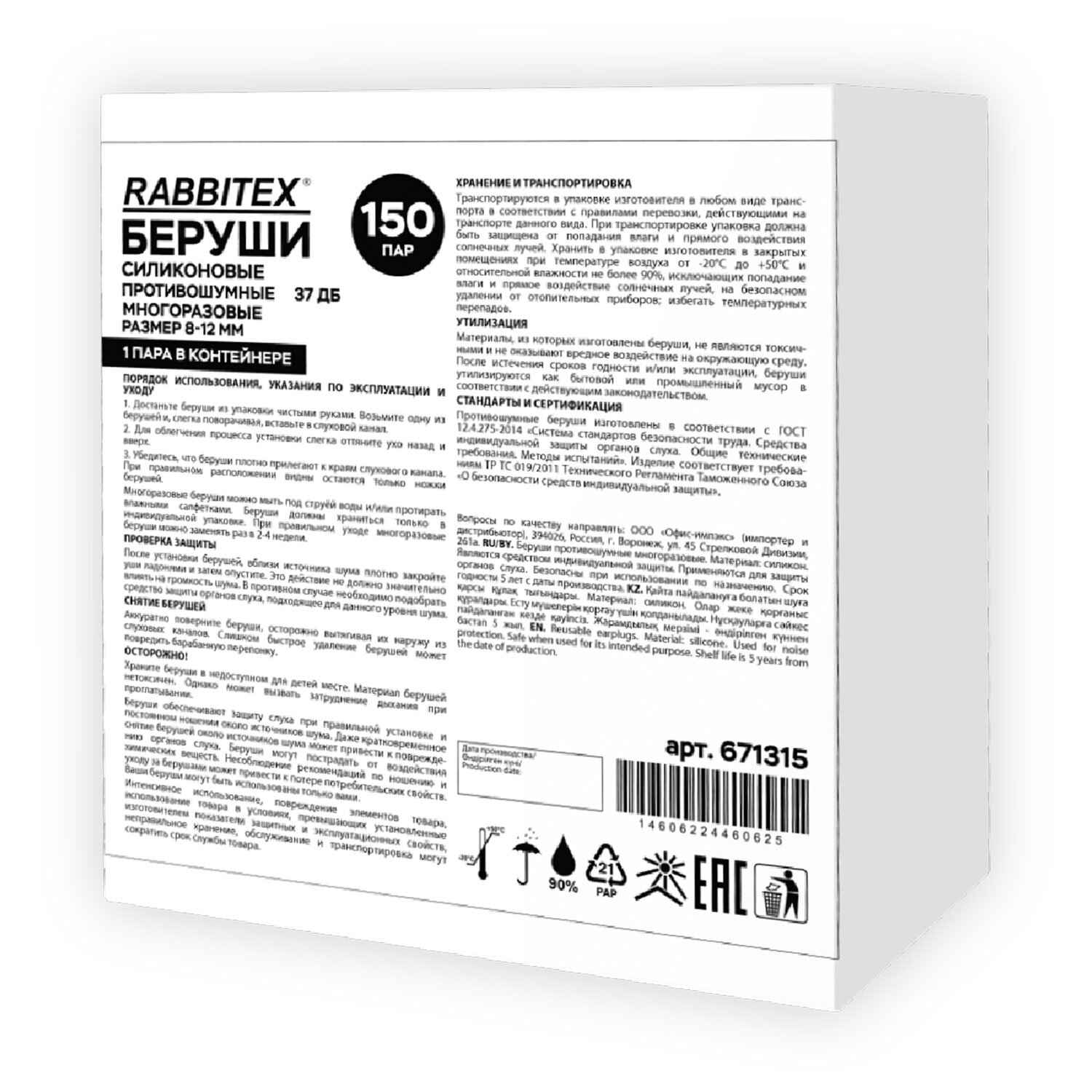 Беруши многоразовые силиконовые без шнурка, 1 пара в контейнере, SNR 37 дБ, RABBITEX (РАББИТЕКС) Код товара: 671315 32,2 ₽ Купить Производитель:RABBITEX Беруши применяются для защиты слуха от вредного воздействия шума на производстве, для создания комфорта во время путешествия, сна и отдыха, предотвращают попадание воды и посторонних предметов в слуховые каналы. Беруши используются для защиты слуха при регулярном воздействии шумов. Предотвращают нарушение слуха при громких звуках на работе и на концертах, защищают уши во время плавания; помогают усилить концентрацию во время работы и учебы благодаря эффекту шумоподавления. Изготовлены из силикона – гипоаллергенного, мягкого и эластичного материала. Форма берушей в виде ёлочки обеспечивает комфортную посадку в ухе. Благодаря силиконовой ножке беруши удобно вставляются и извлекаются из слухового канала. Могут применяться многократно, легко очищаются, не впитывают влагу, сохраняют со временем свои форму и свойства. Беруши располагаются в пластиковом контейнере для удобства хранения и переноски. Диаметр берушей 8 мм на конце и 12 мм ближе к серединке. Акустическая эффективность – 37 дБ. Материал – силикон. Цвет – жёлтый. Упакованы в индивидуальный пакет (1 пара в контейнере в пакете). Сферы применения: промышленные работы, строительные и монтажные работы, слесарно-столярные работы и другие работы, сопровождающиеся громким шумом.Производство: КитайВид: многоразовыеМатериал: силиконНаличие контейнера: даКоличество в комплекте: 1 парШумопонижение: 37 дБЦвет*: желтыйЦвет: желтыйУпаковка: контейнерСрок годности: 60 месВес: 9 грРазмер упаковки: 1.7 × 5.7 × 4.5 смПромежуточная упаковка: 150 штТранспортная упаковка: 1500 штШтрих-код: 4606224460628