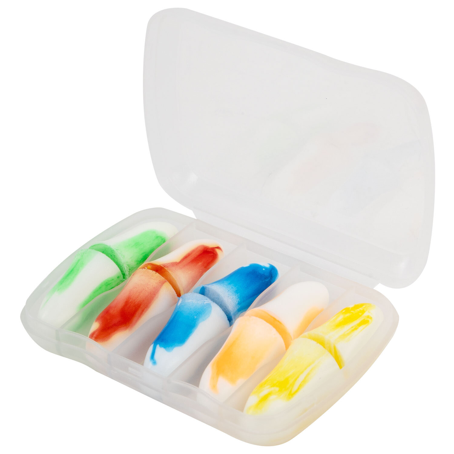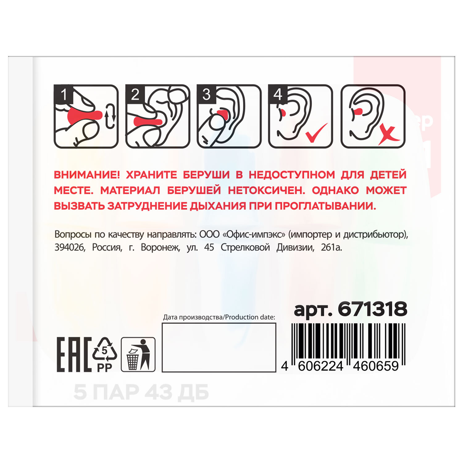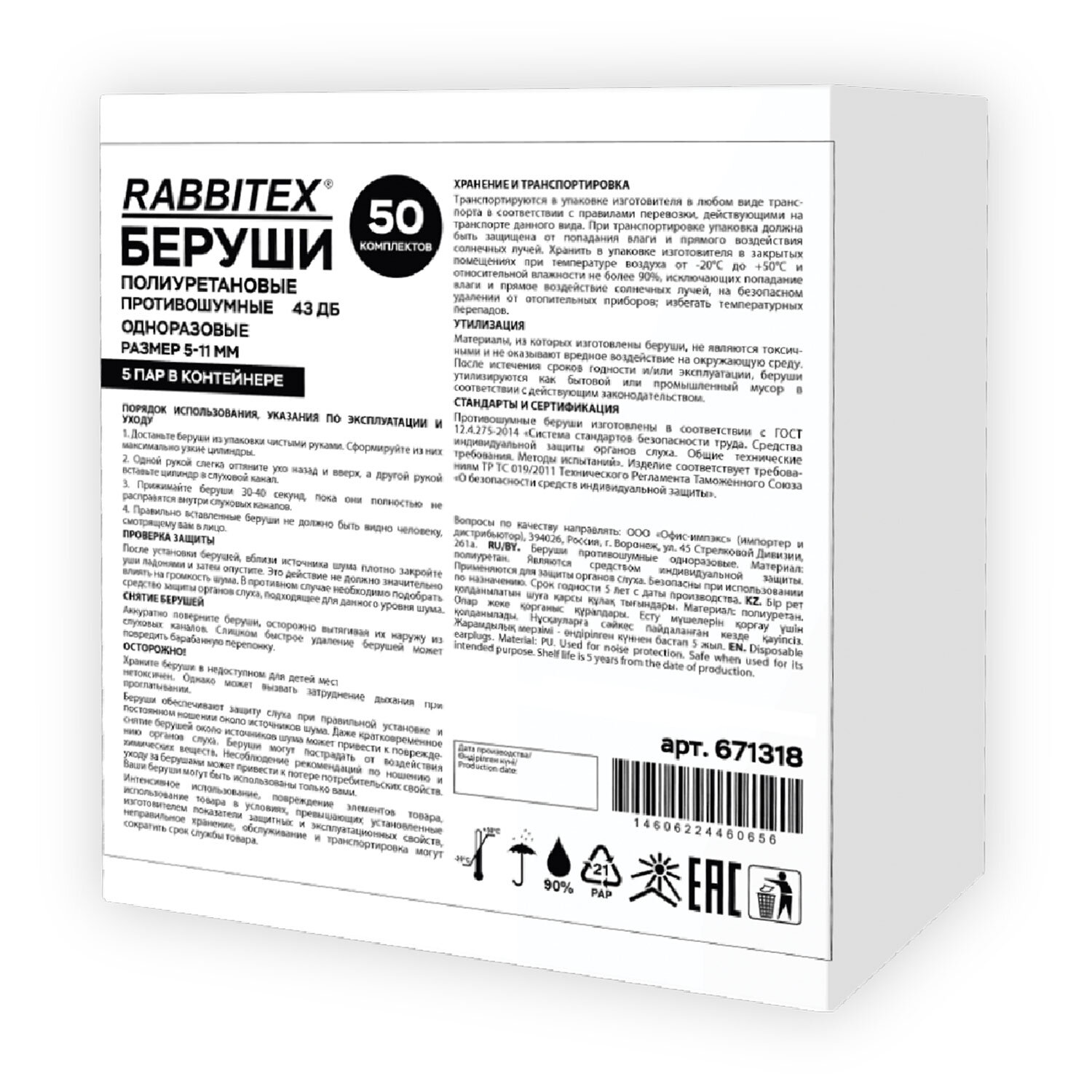 Беруши одноразовые пенополиуретановые двухцветные, КОМПЛЕКТ 5 пар в контейнере, RABBITEX (РАББИТЕКС) Код товара: 671318 143,41 ₽ Купить Производитель:RABBITEX Беруши применяются для защиты слуха от вредного воздействия шума на производстве, для создания комфорта во время путешествия, сна и отдыха, предотвращают попадание воды и посторонних предметов в слуховые каналы. Беруши используются для защиты слуха при регулярном воздействии шумов. Предотвращают нарушение слуха при громких звуках на работе и на концертах, защищают уши во время плавания; помогают усилить концентрацию во время работы и учебы благодаря эффекту шумоподавления. Изготовлены из вспененного полиуретана – гипоаллергенного, дышащего, очень мягкого и эластичного материала, который легко подвергается деформации, при этом быстро возвращается в исходное состояние, принимая форму наружного слухового канала. Устойчивы к влаге, легко моются при помощи мыла и воды. Сохраняют звукопоглощающие свойства даже при многократном применении. 5 пар двухцветных вкладышей располагаются в пластиковом контейнере для удобства хранения и переноски. Диаметр берушей может меняться с 11 мм (в исходном состоянии) до 5 мм в сжатом (перед непосредственным применением). Акустическая эффективность – 43 дБ. Материал – вспененный полиуретан. Цвета в сочетании с белым: жёлтый, красный, синий, оранжевый, зелёный. Упакованы в индивидуальный пакет (5 пар в контейнере в пакете). Сферы применения: промышленные работы, строительные и монтажные работы, слесарно-столярные работы и другие работы, сопровождающиеся громким шумом.Производство: КитайВид: одноразовыеМатериал: вспененный полиуретанНаличие контейнера: даКоличество в комплекте: 5 парШумопонижение: 43 дБЦвет*: желтый, оранжевый, красный, синий, зеленыйЦвет: разноцветныйУпаковка: контейнерСрок годности: 60 месВес: 27 грРазмер упаковки: 1.7 × 8.5 × 6.2 смОбъём: 0.0001 м3Промежуточная упаковка: 50 штТранспортная упаковка: 500 штШтрих-код: 4606224460659
