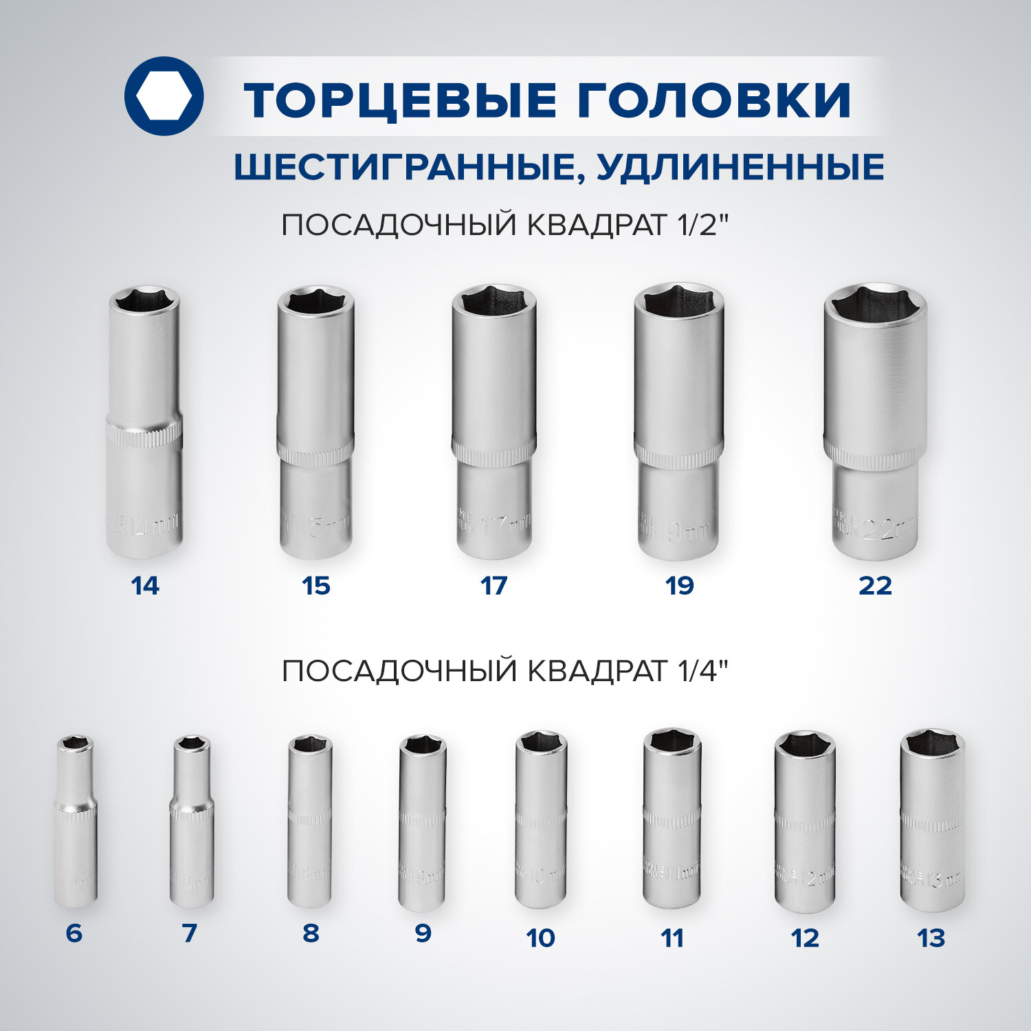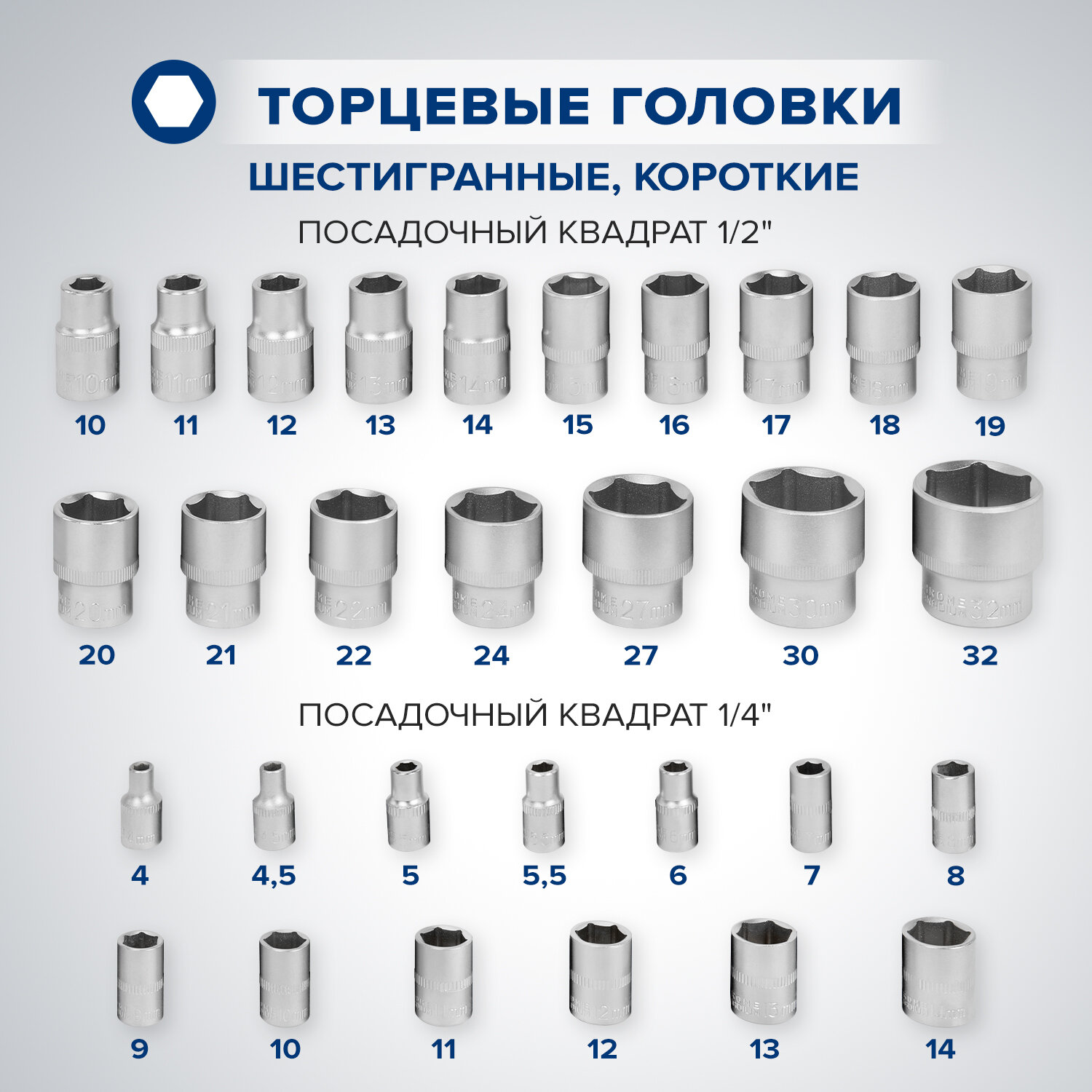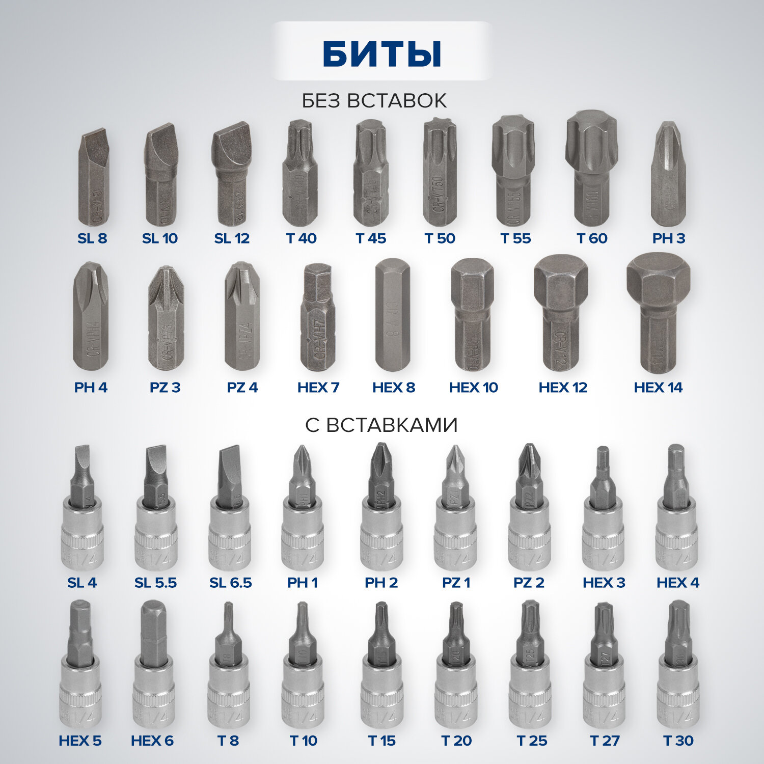 - Комплектация набора: адаптер, битодержатель, биты, ключ трещоточный, комбинированный удлинитель, переходники, свечные головки, торцевые головки, удлинитель, шарнир карданный, шестигранные ключи