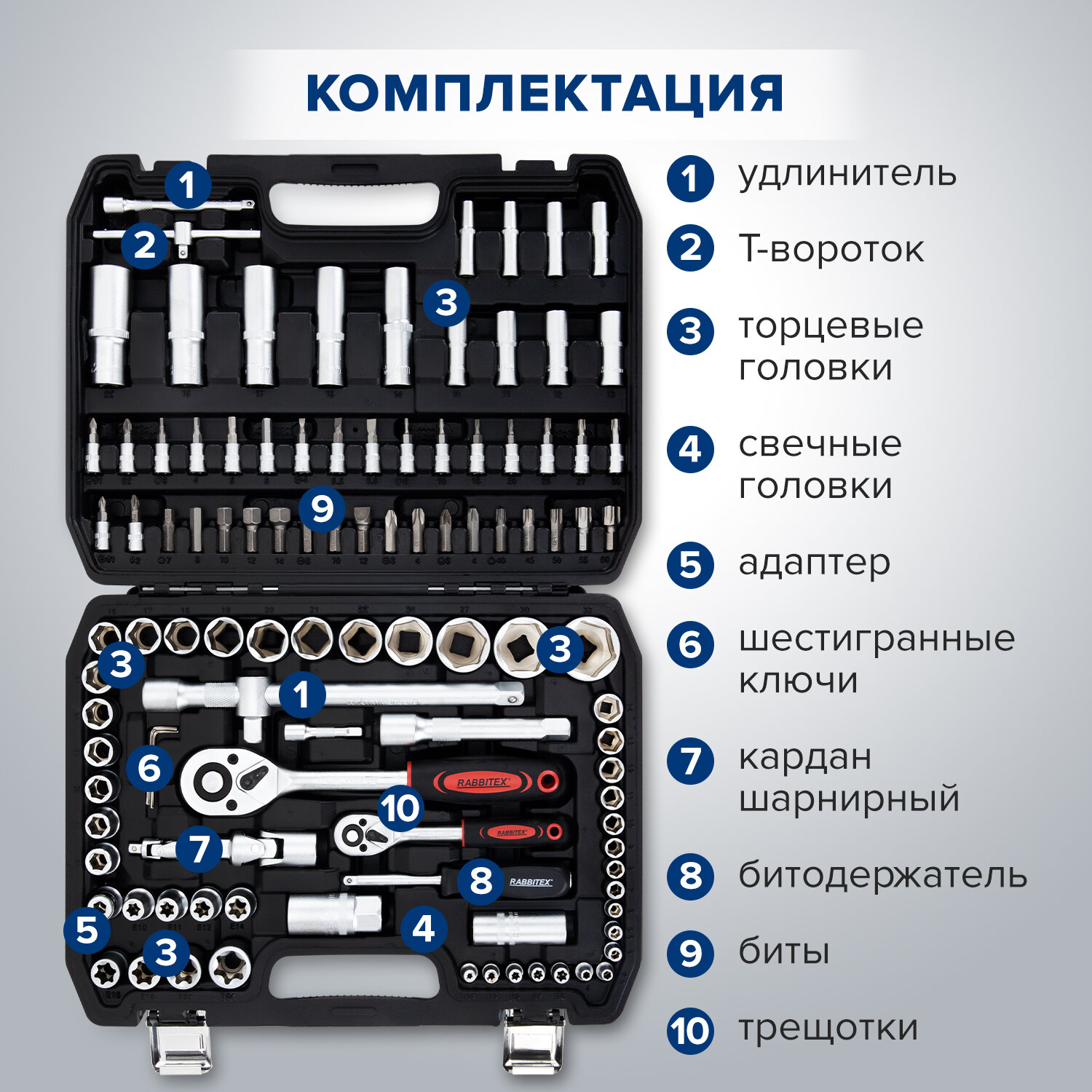 Инструменты RABBITEX изготовлены из высококачественной углеродистой стали и подходят для работы с различными видами крепежа. В набор входят ключевые приспособления для ремонта автомобилей, колесной и бытовой техники, а также мебели. Две реверсивные трещотки с разными посадочными квадратами, удлинители, адаптеры и шарниры обеспечивают доступ к креплениям и узлам даже в труднодоступных местах.