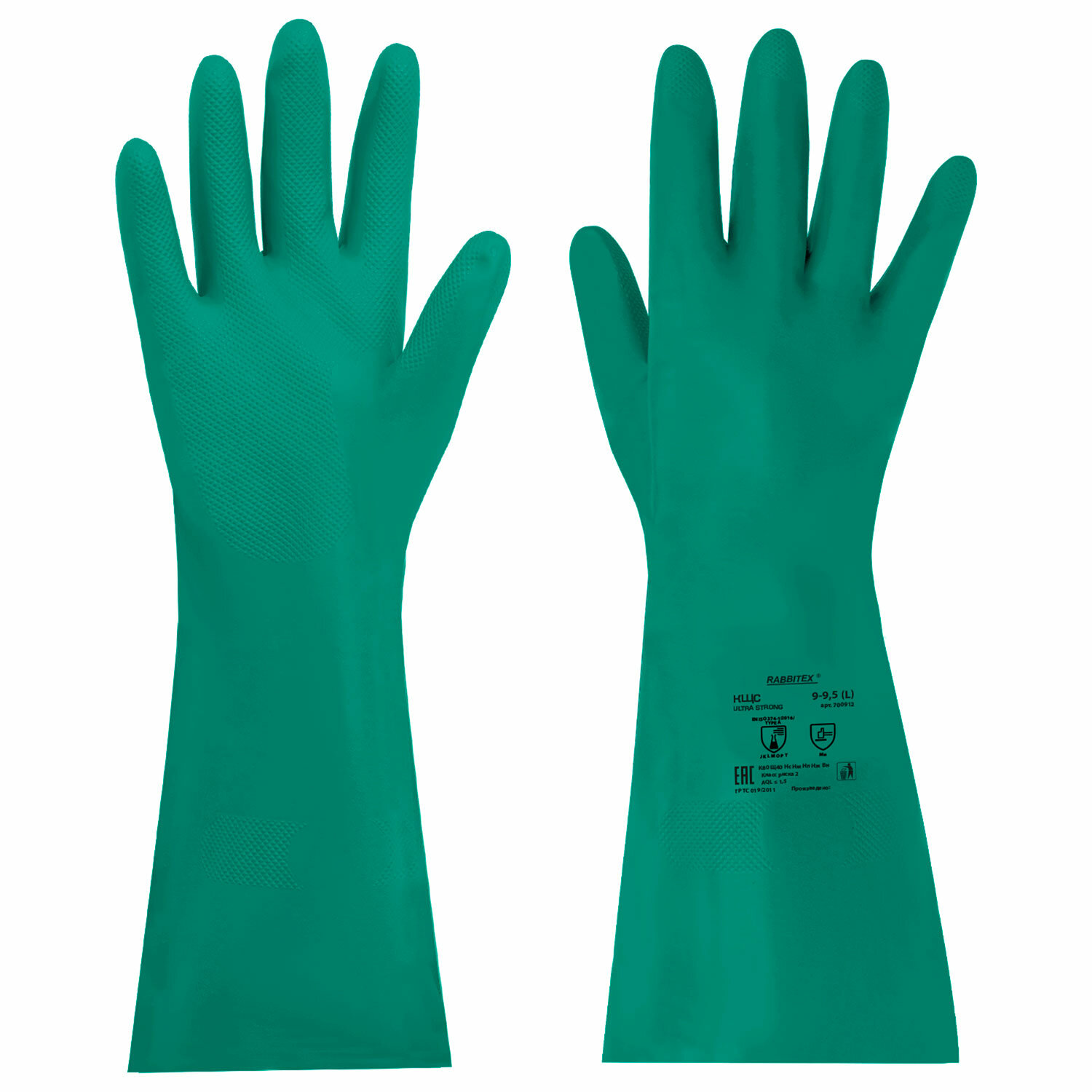 Перчатки нитриловые КЩС, ULTRA STRONG, химически устойчивые, с хлопковым напылением, зеленые, размер 9-9,5 L (большой), RABBITEX Код товара: 700912 131,29 ₽ Купить Производитель:RABBITEX Нитриловые перчатки RABBITEX для защиты рук от загрязнений и химических факторов: кислот, щелочей, нефтепродуктов, растительных и животных масел и жиров, а также от воды и растворов нетоксичных веществ. Могут применяться в быту и на производстве. Перчатки нитриловые КЩС Ultra Strong – это средство индивидуальной защиты рук от различных химических факторов: кислот концентрацией до 80% (К80), щелочей концентрацией до 40% (Щ40), сырой нефти (Нс), продуктов тяжелых фракций и нефтяных масел (Нм), продуктов легкой фракции (Нл), растительных и животных масел и жиров (Нж), а также от воды и растворов нетоксичных веществ. Благодаря повышенной плотности перчатки защищают от более высоких концентраций химических веществ. Внутреннее хлопковое напыление дарит комфорт во время работы. Рельефная текстура на ладони и пальцах обеспечивает надёжный захват влажных и промасленных предметов. Удлинённая манжета защищает руки и рукава одежды от загрязнений. Изготовлены в соответствии с EN ISO 374-1:2016 и ТР ТС 019/2011. Длина – 330 мм. Толщина – 0,38 мм. Цвет – зеленый. Упакованы в цветной пакет с европодвесом. Сферы применения: - автомобильная / механическая промышленности; - обработка / обезжиривание металлов с помощью агрессивных растворителей; - химическая промышленность; - погрузка барабанов для химической продукции; - обслуживание; - пропитка и отделка крепёжного леса; - применение пестицидов; - очистка типографских роликов.Производство: КитайЗащита от: химических воздействийРазмер: L (большой)Размер производителя: 9-9,5 (L)Вид: КЩСМатериал основы: нитрилПокрытие внешнее: нетПодкладка: хлопковое напылениеСерия: КЩССтепень защиты от кислот: 80%Степень защиты от щелочей: 40%Поверхность области захвата: рельефнаяСоответствует требованиям ГОСТа : ГОСТ EN ISO 374-1:2016/Type AКоличество в комплекте: 1 парДлина: 330 ммТолщина: 0.38 ммЦвет: зеленыйСрок годности: 60 месВес: 77 грРазмер упаковки: 1.5 × 21.9 × 13.9 смОбъём: 0.0003 м3Промежуточная упаковка: 12 штТранспортная упаковка: 120 штШтрих-код: 4606224501048 Файлы Сертификат-1.jpg Сертификат-2.jpg Сертификат-3.jpg Сертификат-4.jpg Сертификат-5.jpg Сертификат-6.jpg