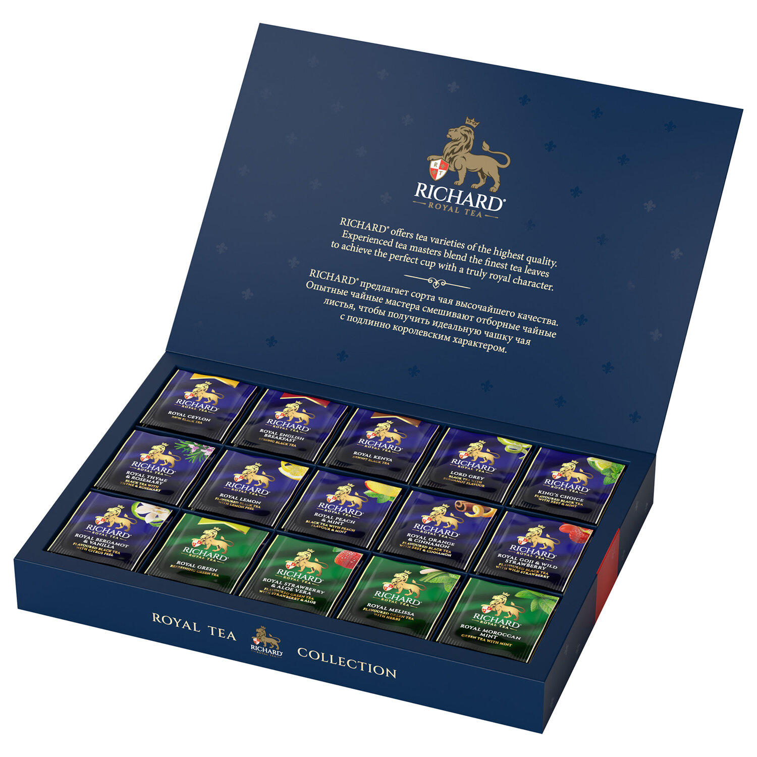 Чай RICHARD "Royal Tea Collection" ассорти 15 вкусов, НАБОР 120 пакетиков Код товара: 624561 959,85 ₽ Купить Производитель:RICHARD Подарочный набор RICHARD "Royal Tea Collection" – в составе 15 видов чая в индивидуальных сашетах. Классические черные сорта, выращенные на лучших плантациях мира: Цейлон, Кения и Индия, зеленый чай из Китая, а также уникальные купажи с фруктами (фруктовый чай) и травами (травяной чай). Ассорти: 1. ROYAL CEYLON – 8 пакетиков по 2 г; 2. ROYAL ENGLISH BREAKFAST – 8 пакетиков по 2 г; 3. LORD GREY – 8 пакетиков по 2 г; 4. ROYAL KENYA – 8 пакетиков по 2 г; 5. ROYAL BERGAMOT & VANILLA – 8 пакетиков по 2 г; 6. KING'S CHOICE – 8 пакетиков по 2 г; 7. ROYAL THYME & ROSEMARY – 8 пакетиков по 2 г; 8. ROYAL LEMON – 8 пакетиков по 1,7 г; 9. ROYAL PEACH & MINT – 8 пакетиков по 1,7 г; 10. ROYAL ORANGE & CINNAMON – 8 пакетиков по 2 г; 11. ROYAL GOJI & WILD STRAWBERRY – 8 пакетиков по 1,7 г; 12. ROYAL GREEN – 8 пакетиков по 2 г; 13. ROYAL STRAWBERRY & ALOE VERA – 8 пакетиков по 1,5 г; 14. ROYAL MELISSA – 8 пакетиков по 1,5 г; 15. ROYAL MOROCCAN MINT – 8 пакетиков по 2 г.Производство: РоссияТип упаковки: картонная коробкаВид чая: ассортиИдеи для подарка: для всехТип чая: пакетированныйМасса нетто: 224.8 гКоличество пакетиков: 120 шт.Срок годности: 24 мес.Фирма-производитель: ООО МайСрок годности: 24 месВес: 603 грРазмер упаковки: 5.1 × 38.5 × 27 смОбъём: 0.0056 м3Промежуточная упаковка: 5 штТранспортная упаковка: 5 штШтрих-код: 4660115906138 Файлы Сертификат-1.jpg Сертификат-2.jpg Сертификат-3.jpg Сертификат-4.jpg Сертификат-5.jpg Сертификат-6.jpg Сертификат-7.jpg Сертификат-8.jpg Сертификат-9.jpg Сертификат-10.jpg