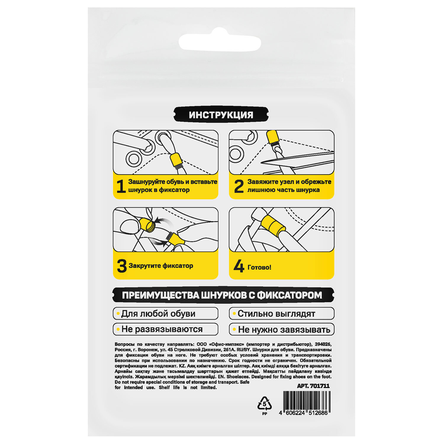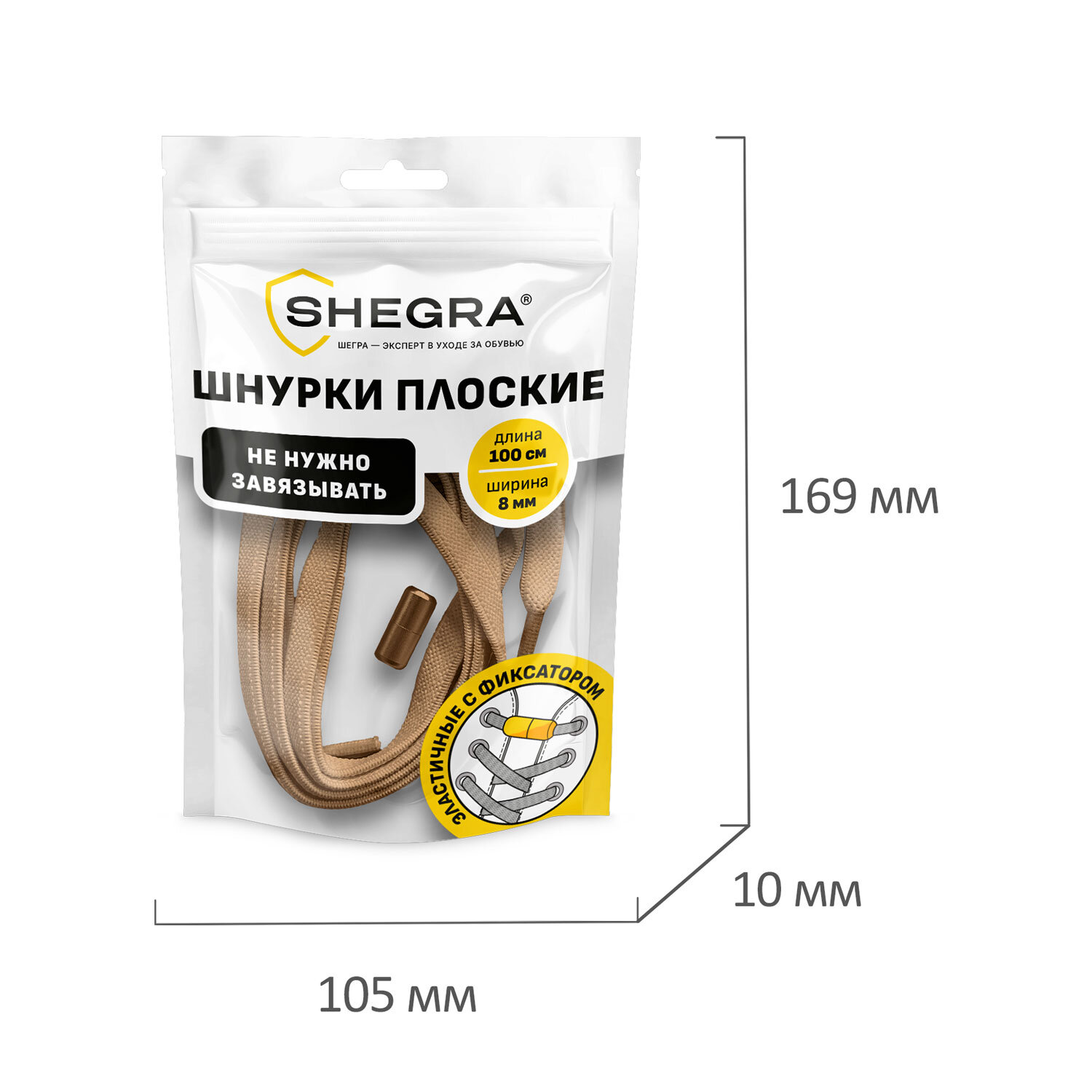 Шнурки плоские эластичные БЕЖЕВЫЕ длина 100 см, ширина 8 мм, 2 капсулы бежевого цвета, SHEGRA (ШЕГРА) Код товара: 701711 119,24 ₽ Купить Производитель:SHEGRA Плоские шнурки SHEGRA отлично подойдут для любой обуви, обеспечат надежную фиксацию и максимальное удобство. Шнурки бежевого цвета имеют универсальную длину 100 см и ширину 8 мм, что подходит для большинства видов обуви – от кроссовок до классических туфель. Шнурки выполнены из эластичного полиэстера, который обладает высокой прочностью на разрыв и сохраняет гибкость при отрицательных температурах. Отлично подходят как для взрослых так и для детей, не развязываются и предотвращают падения. Капсулы-фиксаторы в цвете шнурков. ИНСТРУКЦИЯ: 1. Зашнуруйте обувь и вставьте шнурок в фиксатор. 2. Завяжите узел и обрежьте лишнюю часть шнурка. 3. Закрутите фиксатор.Производство: КитайТип товара: шнурки эластичные для обувиФорма шнурка: плоскийДлина шнурка: 100 смШирина / Диаметр шнурка: 8 ммЦвет шнурков: бежевыйЭластичные: даМатериал шнурков: полиэстерФиксатор: даМатериал фиксатора: металлЦвет фиксатора: бежевыйУпаковка: OPP пакет с европодвесом и прозрачным окномВес: 23 грРазмер упаковки: 2.3 × 12.8 × 10.3 смОбъём: 0.0002 м3Промежуточная упаковка: 12 штТранспортная упаковка: 192 штШтрих-код: 4606224512686 Сертификат-1.jpg Сертификат-2.jpg
