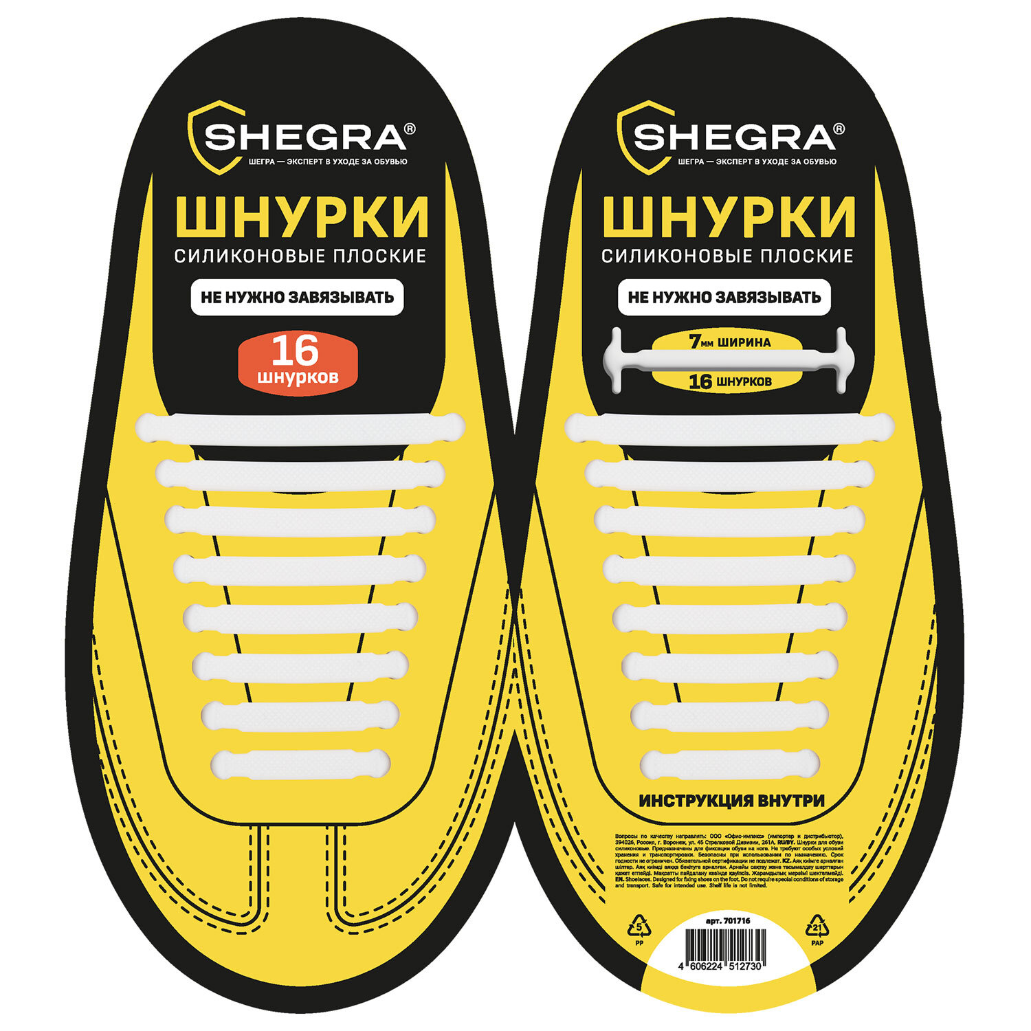 Шнурки силиконовые плоские БЕЛЫЕ 16 шт., ширина 7 мм, SHEGRA (ШЕГРА) Код товара: 701716 154,88 ₽ Купить Производитель:SHEGRA Силиконовые шнурки SHEGRA отлично подойдут для любой обуви, обеспечат надежную фиксацию и максимальное удобство. Шнурки хорошо тянутся и имеют диаметр 7 мм, что подходит для большинства видов обуви, в комплекте 16 шт. Шнурки выполнены из силикона, который обладает высокой прочностью на разрыв и сохраняет гибкость при отрицательных температурах. Отлично подходят как для взрослых так и для детей, не развязываются и предотвращают падения. Стильный белый цвет и лаконичный дизайн делают их универсальным аксессуаром для любой обуви. ИНСТРУКЦИЯ: 1. Вставьте кончик шнурка в отверстие с внешней стороны. 2. Повторите это с остальными шнурками. 3. Вставьте противоположные кончики шнурков в отверстия напротив.Производство: КитайТип товара: шнурки силиконовые для обувиФорма шнурка: плоскийДлина шнурка: 0 смШирина / Диаметр шнурка: 7 ммЦвет шнурков: белыйЭластичные: даМатериал шнурков: силиконМатериал фиксатора: нет фиксатораЦвет фиксатора: нетУпаковка: OPP пакет с европодвесом и картонным вкладышемВес: 36 грРазмер упаковки: 0.8 × 21.5 × 11 смОбъём: 0.0003 м3Промежуточная упаковка: 12 штТранспортная упаковка: 192 штШтрих-код: 4606224512730 Сертификат-1.jpg Сертификат-2.jpg