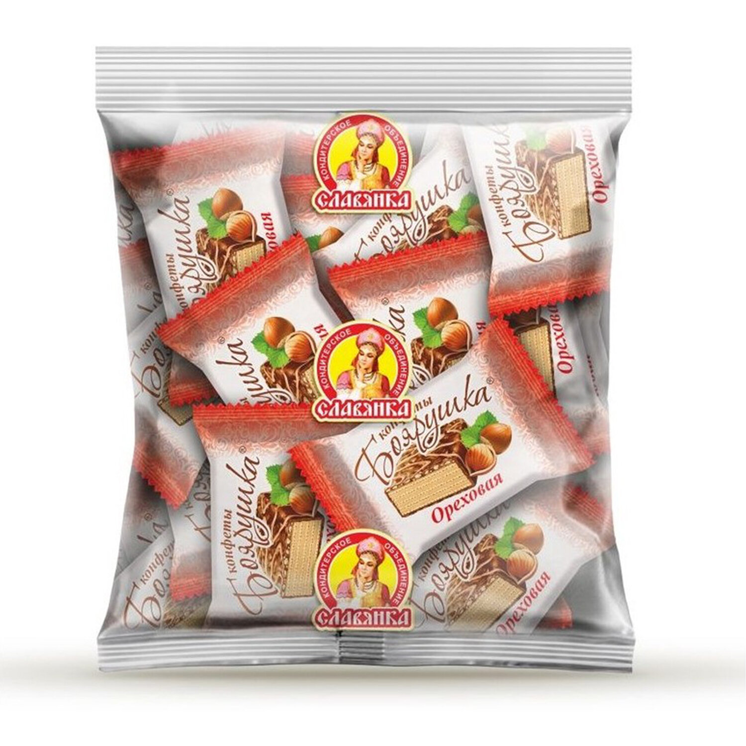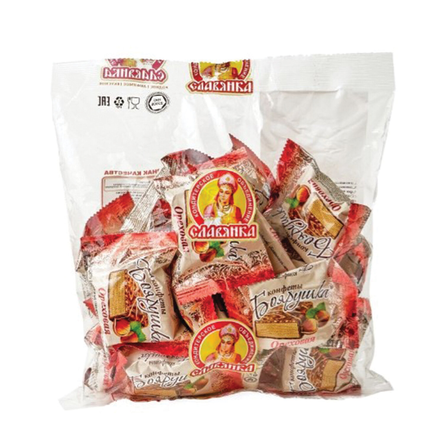 Конфеты шоколадные СЛАВЯНКА "Боярушка", вафельные, с арахисом и пралине, 1000 г, пакет Код товара: 622607 691,22 ₽ Купить Производитель:СЛАВЯНКА Вафельная конфета СЛАВЯНКА "Боярушка" ореховая покрыта блестящей шоколадной глазурью и посыпана арахисом. Сладость с большим содержанием нежной пралиновой начинки даст заряд энергии и бодрости на целый день. Состав: сахар, мука пшеничная, масло кокосовое, арахис дробленый, заменитель масла какао (масла растительные, эмульгаторы: Е492, лецитин соевый), антиокислитель Е306), сыворотка молочная сухая, желток яичный сухой, масло растительное, ядра фундука тертые, эмульгаторы (лецитин соевый, Е476), соль, патока, крахмал кукурузный, ароматизатор, разрыхлитель гидрокарбонат натрия.Производство: РоссияВес нетто: 1000 гУпаковка: мягкий пакетВид начинки: вафляВкус: шоколадно-ореховыйСрок годности: 10 мес.Фирма-производитель: "Славянка КФ"Срок годности: 10 месВес: 1 кгРазмер упаковки: 18 × 9 × 33 смОбъём: 0.0056 м3Промежуточная упаковка: 5 штТранспортная упаковка: 5 штШтрих-код: 4605142046211 Сертификат-1.jpg Сертификат-2.jpg