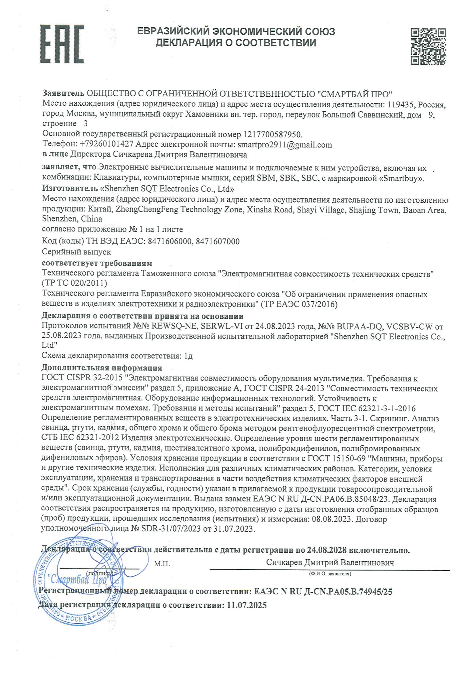 Набор беспроводной SMARTBUY 201359AG, клавиатура 79 клавиш, мышь 3 кнопки + 1 колесо, черный/серый/белый Код товара: 514311 1 317,02 ₽ Купить Производитель:SMARTBUY Беспроводной комплект клавиатура + мышь Smartbuy 201359AG – это современный стиль и максимальное удобство Вашего рабочего пространства. Ключевые особенности: держатель-подставка для планшета и телефона, компактность клавиатуры и низкопрофильные клавиши для максимального комфорта при печати + бесшумная мышь. У клавиатуры нескользящие резиновые "ножки" и 79 клавиш, включая полноценный мультимедийный набор команд. Мышь полноразмерная, для любой руки, с хромированным колесиком, приятным на ощупь Soft-Touch покрытием и опцией управления скоростью курсора. В комплекте 1 USB-ресивер для мыши и клавиатуры. Радиус действия – до 10 м. Вся информация на сайте о товарах носит справочный характер и не является публичной офертой в соответствии с пунктом 2 статьи 437 ГК РФ. Производитель оставляет за собой право изменять характеристики товара, его внешний вид и комплектность без предварительного уведомления продавца.Производство: КитайБеспроводное подключение: даРазъем клавиатуры и мыши: USBКоличество клавиш клавиатуры: 79Дополнительные клавиши клавиатуры: 12Количество кнопок мыши: 4Технология сенсора мыши: оптическаяМаксимальное разрешение курсора: 1600 dpiРадиус действия: 10 мДлина шнура: 0 мТип клавиатуры: мембраннаяБесшумный клик мыши: даЦвет: комбинированныйПитание клавиатуры: 1 батарея АААПитание мыши: 1 батарея ААБатарейки входят в комплект: даЭргономичная форма корпуса: даПокрытие корпуса soft-touch: даШирина клавиатуры: 380 ммГлубина клавиатуры: 152 ммВысота клавиатуры: 35 ммСерия: SBCВес клавиатуры: 400 гДлина мыши: 115 ммШирина мыши: 61 ммВысота мыши: 35 ммВес мыши: 58 гВес: 665 грРазмер упаковки: 4.2 × 50.1 × 15.7 смОбъём: 0.0038 м3Промежуточная упаковка: 20 штТранспортная упаковка: 20 штШтрих-код: 4690626106963 Файлы Сертификат-1.jpg Сертификат-2.jpg Сертификат-3.jpg Сертификат-4.jpg