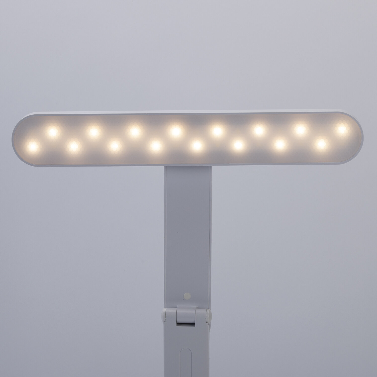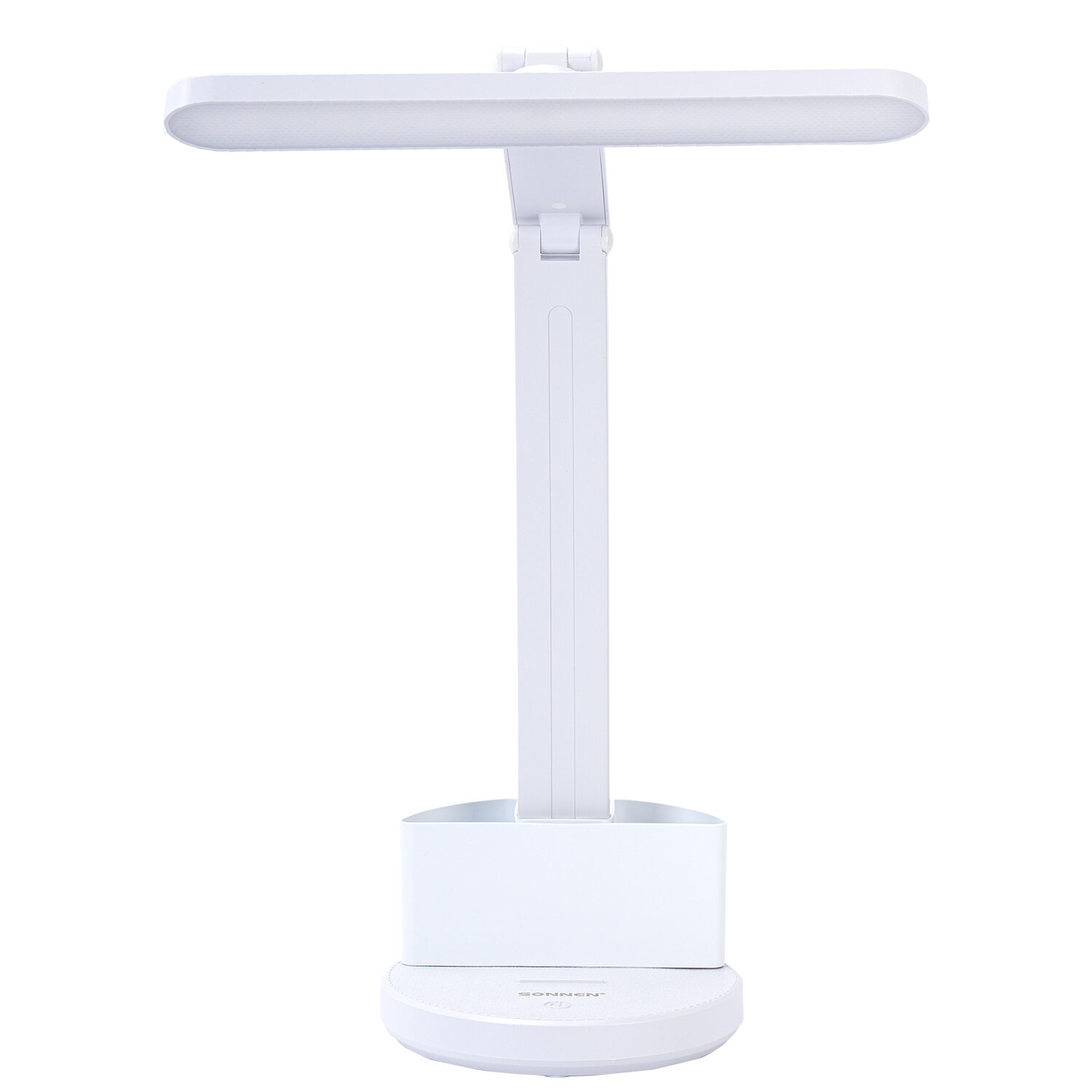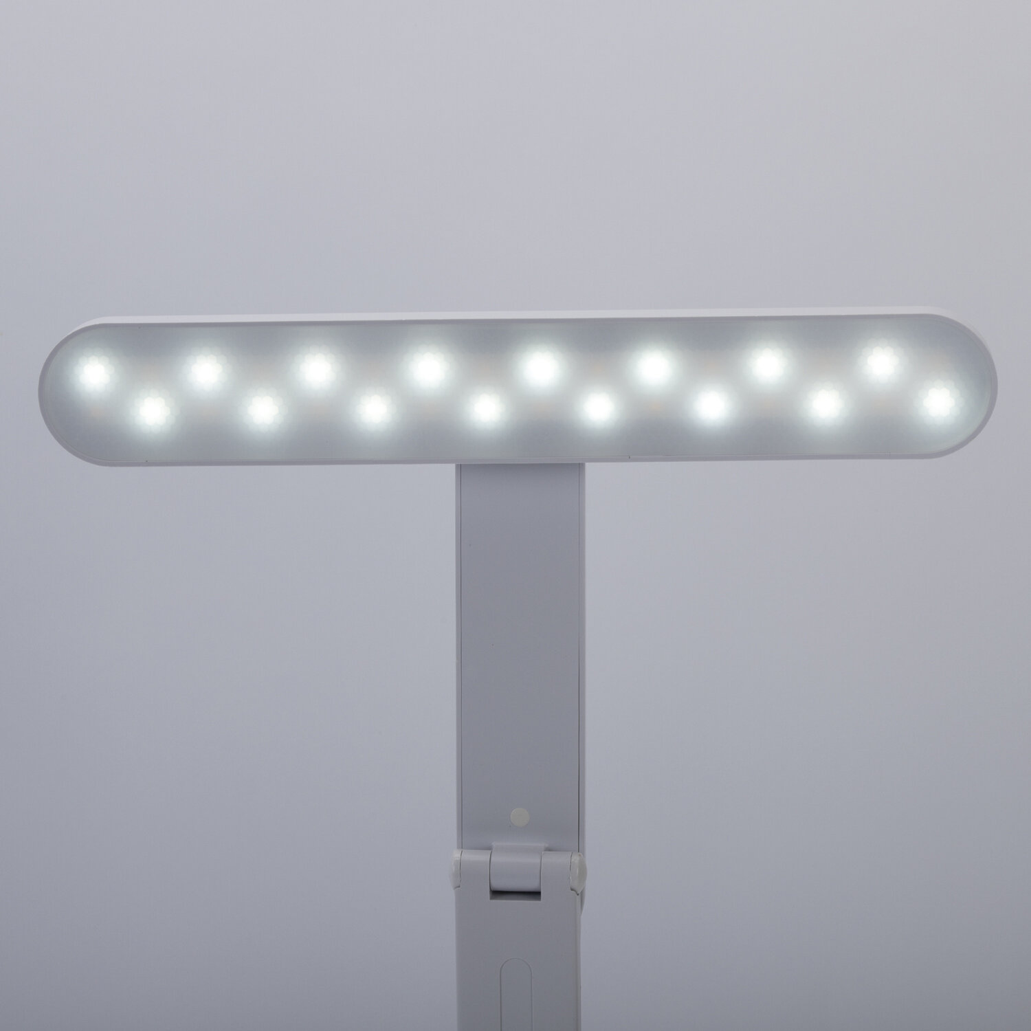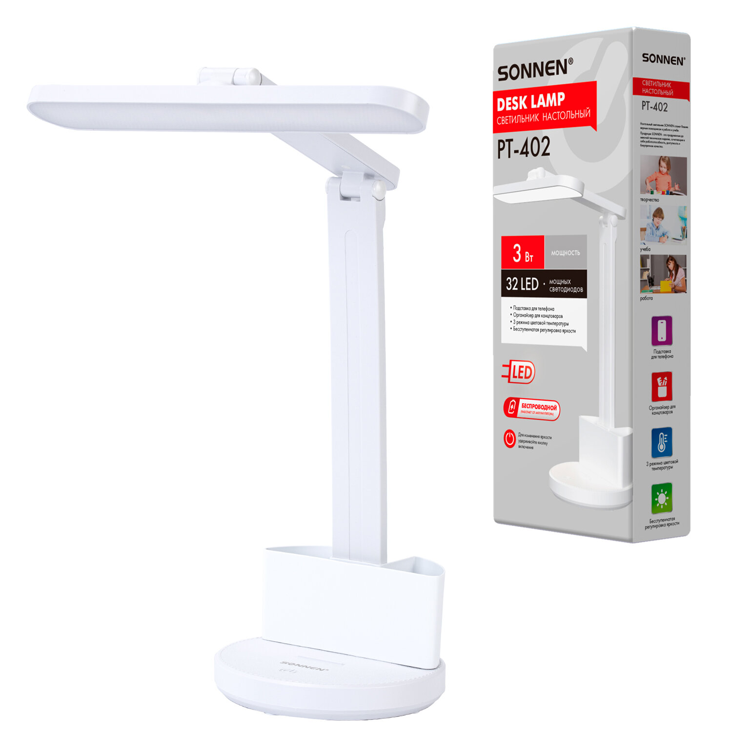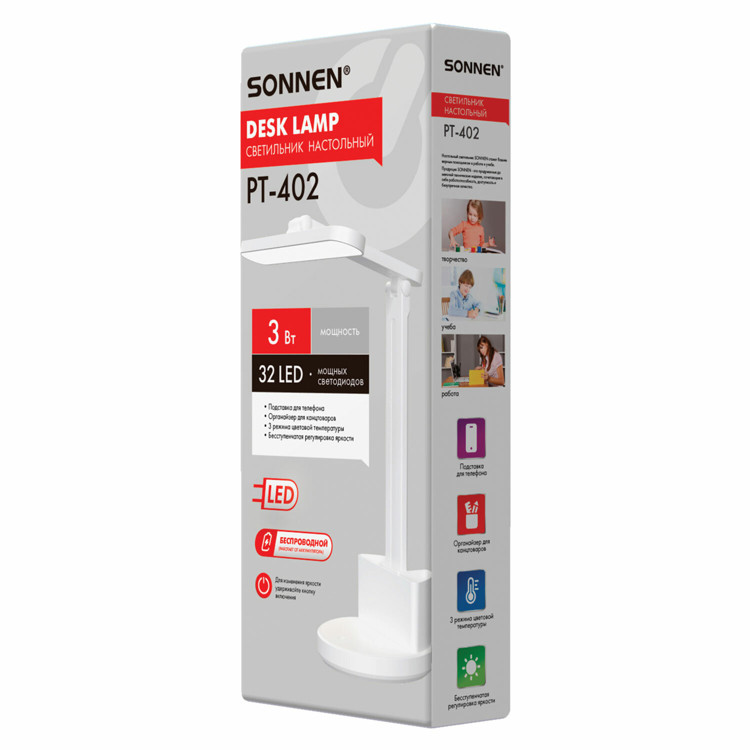 Настольная лампа / светильник беспроводная SONNEN PT-402, органайзер, USB, LED, 3 Вт, 3 режима Код товара: 238782 629,63 ₽ Купить Производитель:SONNEN Настольная лампа-светильник SONNEN PT-402 предназначена для освещения рабочего места в офисе или дома. Конструкция светильника обеспечивает произвольную регулировку направления света. Представляем многофункциональный светодиодный светильник 3 Вт – идеальное решение для офиса и дома. Светильник оснащен 32 яркими диодами, что обеспечивает равномерное освещение и бережную нагрузку на глаза при длительной работе. Три режима цветовой температуры (тёплый, нейтральный, холодный свет) и бесступенчатая регулировка яркости позволяют настроить свет под любую задачу и время суток. Интегрированный органайзер поможет поддерживать порядок на столе, а специальная подставка для телефона – держать устройство под рукой. Встроенный аккумулятор обеспечит бесперебойную работу светильника.Производство: КитайТип лампы: светодиоднаяТип крепления: подставкаМощность: 3 ВтЦоколь: нетНазначение: универсальныйСерия: PT-40Цветность света: нейтральный белый - 3500-4500 К, теплый белый - 2700-3400 К, холодный белый - от 6100 и болееСветовой поток: 350 ЛюменКол-во режимов свечения: 3Источник света: 32 LEDИсточник питания: сеть, аккумуляторРасположение кнопки выключателя: на корпусеСенсорный выключатель: даПроизвольная регулировка направления подсветки: даОтсутствие мерцания и шумов: даСкладная конструкция: даВысота: 35 смДлина шнура: 1.2 мМатериал корпуса: пластикЦвет корпуса: белыйВес: 604 грРазмер упаковки: 6.5 × 36 × 15.4 смОбъём: 0.0041 м3Промежуточная упаковка: 48 штТранспортная упаковка: 48 штШтрих-код: 4606224465982 Сертификат-1.jpg Сертификат-2.jpg