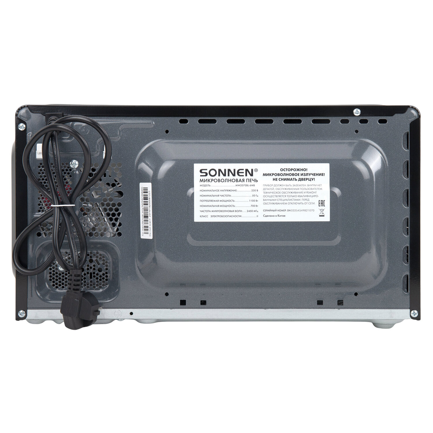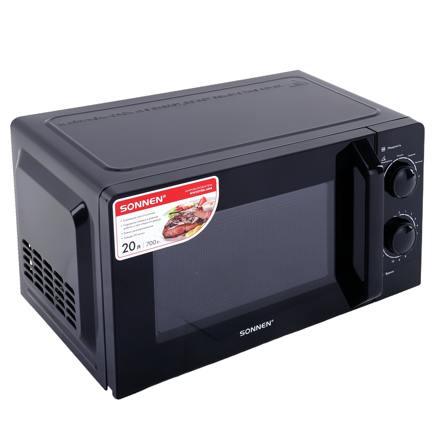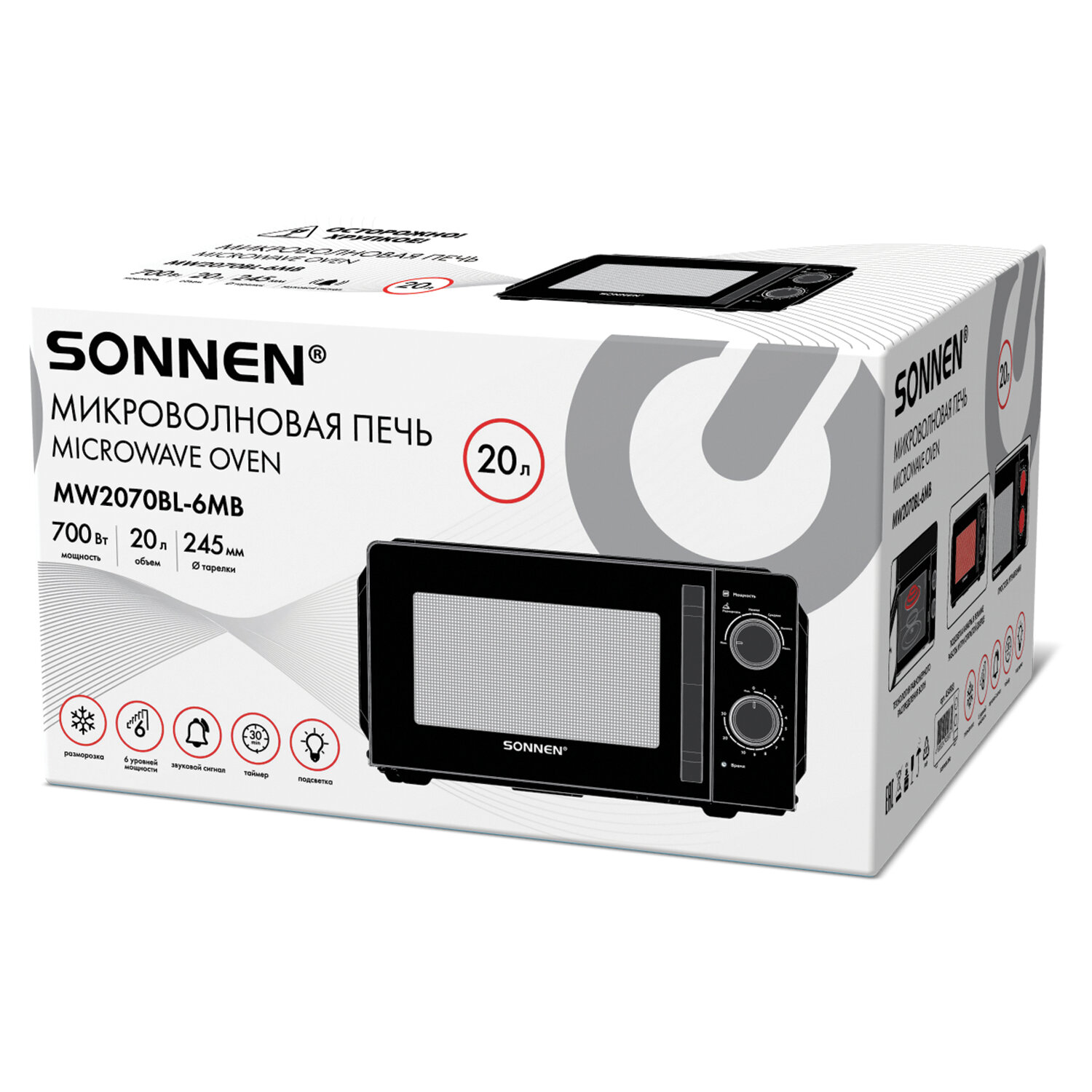 Микроволновая печь SONNEN MW2070BL-6MB, 20 л, 700 Вт, таймер, механическое управление, ручка, черная Код товара: 454983 5 990 ₽ Купить Производитель:SONNEN Стильная микроволновая печь SONNEN – ваш надежный помощник на каждый день! Микроволновая печь SONNEN выполнена в элегантном черном цвете. Обладает всеми необходимыми функциями. Она имеет объем 20 литров, что идеально подходит для приготовления вторых блюд, выпечки и разморозки продуктов. Мощность 700 Вт позволяет быстро и равномерно разогреть различные блюда. Простое механическое управление осуществляется с помощью поворотных переключателей. С их помощью вы можете переключить режим мощности или таймера. В микроволновой печи установлено 6 режимов мощности, благодаря которым вы с легкостью подберете самый подходящий для ваших любимых блюд. Дверца прибора открывается с помощью ручки. Внутреннее покрытие из эмалированной стали легко очищается губкой с моющим средством или даже обычной влажной салфеткой.Производство: КитайОбъем: 20 лМощность микроволн: 700 ВтУправление: механическоеВнутреннее покрытие: эмалированная стальФункционал: режим размораживанияТаймер: 30 мин.Внутреннее освещение: даНаличие звукового сигнала: даНаличие поворотного стола: даКоличество автоматических программ: 0 шт.Диаметр поддона: 24.5 смОткрывание дверцы: ручкаСерия: MW207Дизайн: MW2070BL-6MBЦвет корпуса: черныйШирина: 44.6 смВысота: 36 смГлубина: 24.3 смВес: 9.8 кгРазмер упаковки: 26.7 × 46.7 × 39.2 смОбъём: 0.0489 м3Промежуточная упаковка: 1 штТранспортная упаковка: 1 штШтрих-код: 4606224455631 Файлы Сертификат-1.jpg Сертификат-2.jpg Сертификат-3.jpg Сертификат-4.jpg Сертификат-5.jpg Сертификат-6.jpg Сертификат-7.jpg