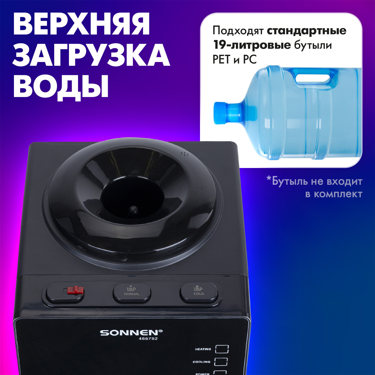 Кулер для воды SONNEN TSE-03BP, настольный, НАГРЕВ/ОХЛАЖДЕНИЕ ЭЛЕКТРОННОЕ, 3 крана, антрацит Код товара: 455752 6 423,51 ₽ Купить Производитель:SONNEN Кулер для воды SONNEN TSE-03BP – это современное и функциональное устройство для охлаждения и нагрева питьевой воды. Он идеально подходит для использования в офисах, домах и квартирах. Вода нагревается с помощью ТЭНА мощностью 500 Вт, что позволяет достичь температуры 90 °C за считаные минуты. Модуль электронного охлаждения мощностью 65 Вт поддерживает температуру холодной воды на уровне 15 °C. Для нагрева требуется в разы меньше электроэнергии, чем для обычного электрического чайника. Благодаря постоянной высокой температуре воды в кулере не нужно ждать, пока он нагреется, что особенно важно для крупных компаний с большим количеством сотрудников и посетителей. Кулер предназначен для настольного размещения и имеет 3 крана для горячей, холодной воды и воды комнатной температуры. Подача воды осуществляется нажатием кнопок в верхней части корпуса, при этом на кнопке горячей воды предусмотрена защита от детей. На верхней панели расположены LED-индикаторы нагрева, охлаждения и работы устройства. Для использования необходимо установить бутыль в специальное отверстие в верхней части диспенсера. Перед первым использованием следует слить около 1 л воды, чтобы очистить накопительный бак и трубки от производственной пыли.Производство: КитайТип установки: настольныйТип охлаждения: электронныйПодача воды с нагревом: даПодача воды с охлаждением: даПодача воды комнатной температуры: даКоличество кранов подачи воды: 3 шт. Серия: TSE-03Рекомендуемое количество пользователей: 10Размещение бутыли с водой: верхняя загрузкаТип крана: нажим рукойМощность нагрева: 500 ВтМощность охлаждения: 65 ВтПроизводительность нагрева: 5 л/часПроизводительность охлаждения: 0.75 л/часТемпература нагревания воды: 90 градусТемпература охлаждения воды: 15 градусЕмкость бака для горячей воды: 0.7 лЕмкость бака для холодной воды: 0.4 лТип нагревательного элемента: ТЭНЗащита от детей: даЗащита от протечек воды: даОбъем шкафчика: 0 лНапряжение: 220 ВМатериал корпуса: пластикЦвет корпуса: антрацитовыйДлина шнура: 1.2 мВысота: 400 ммШирина: 250 ммГлубина: 290 ммВес: 3.5 кгРазмер упаковки: 43.6 × 31.2 × 26.8 смОбъём: 0.0365 м3Промежуточная упаковка: 1 штТранспортная упаковка: 1 штШтрих-код: 4606224455594 Файлы Приложение-1.pdf Сертификат-1.jpg Сертификат-2.jpg Сертификат-3.jpg Сертификат-4.jpg Сертификат-5.jpg