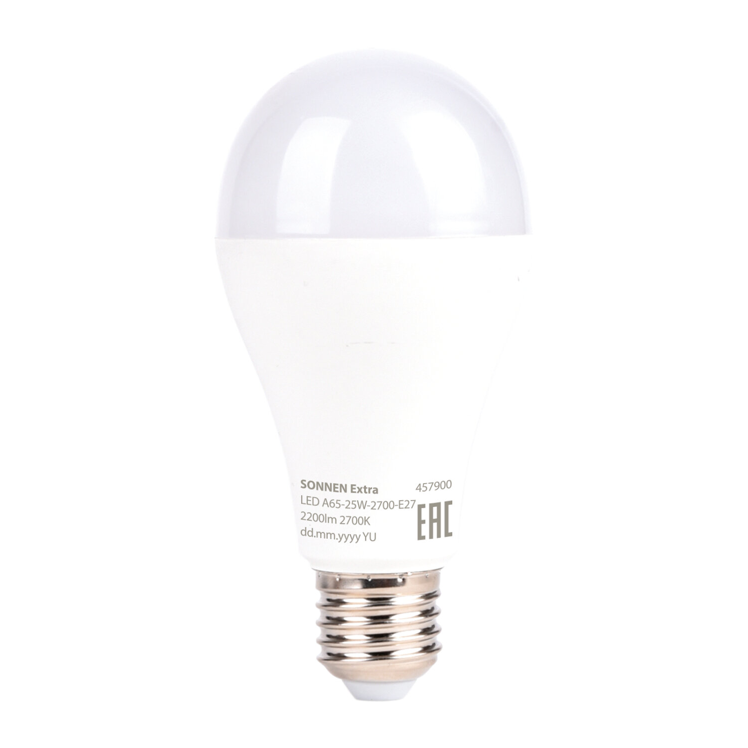 Лампа светодиодная SONNEN EXTRA, 25 (200) Вт, Е27, груша, теплый белый, 30000 часов, LED A65-25W-2700-Е27 Код товара: 457900 164,63 ₽ Купить Производитель:SONNEN Светодиодная лампа SONNEN EXTRA компактного размера. Срок службы лампы составляет не менее 30000 часов, что примерно в 30 раз больше, чем у обычной лампы накаливания. Оснащена цоколем типа Е27 и излучает теплый белый cвет. Отличается длительным сроком службы. Имеет грушевидную форму колбы и сделана из белого матового пластика. Мощность лампы составляет 25 Вт. Представленная модель дает световой поток 2200 Лм, а цветовая температура равна 2700 K. Диаметр лампы составляет 65 мм. Производитель сохраняет за собой право на внесение изменений в технические характеристики, комплектацию и конструкцию данной модели для улучшения эксплуатационных свойств без предварительного уведомления.Производство: Китай Тип цоколя : E27Оттенок света: теплый белыйМощность: 25 ВтТип лампы: светодиоднаяТип колбы: грушаВид колбы: матоваяМинимальное рабочее напряжение: 175 ВМаксимальное рабочее напряжение: 265 ВМощность эквивалентной по световому потоку лампы накаливания: 200 ВтСветовой поток: 2200 ЛмЦветовая температура: 2700 КИндекс цветопередачи: 80 %Срок службы: 30000 ч.Высота (длина) лампы: 131 ммДиаметр лампы: 65 ммВес: 74 грРазмер упаковки: 6.8 × 16.7 × 6.8 смОбъём: 0.0007 м3Промежуточная упаковка: 50 штТранспортная упаковка: 50 штШтрих-код: 4606224501598 Сертификат-1.jpg Сертификат-2.jpg