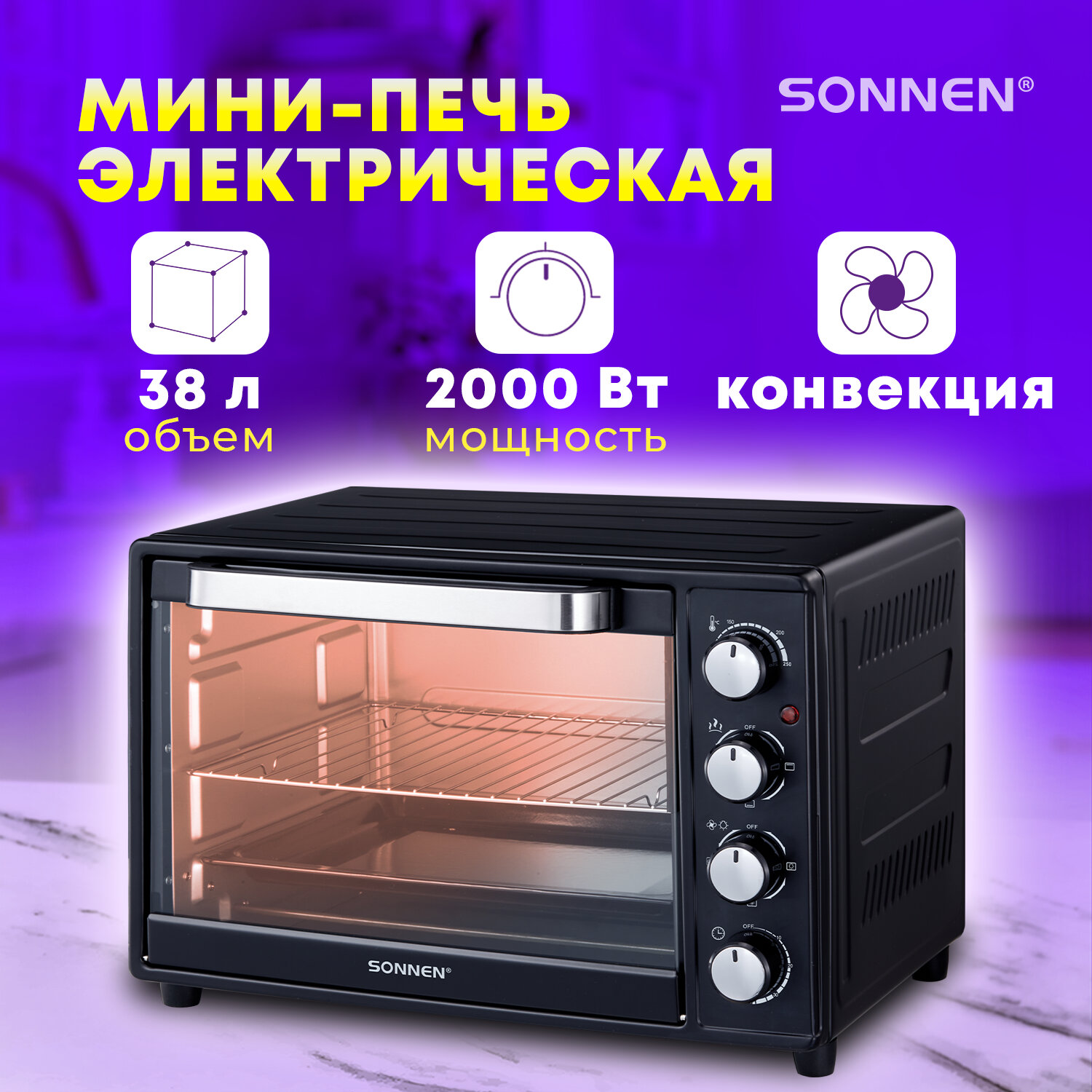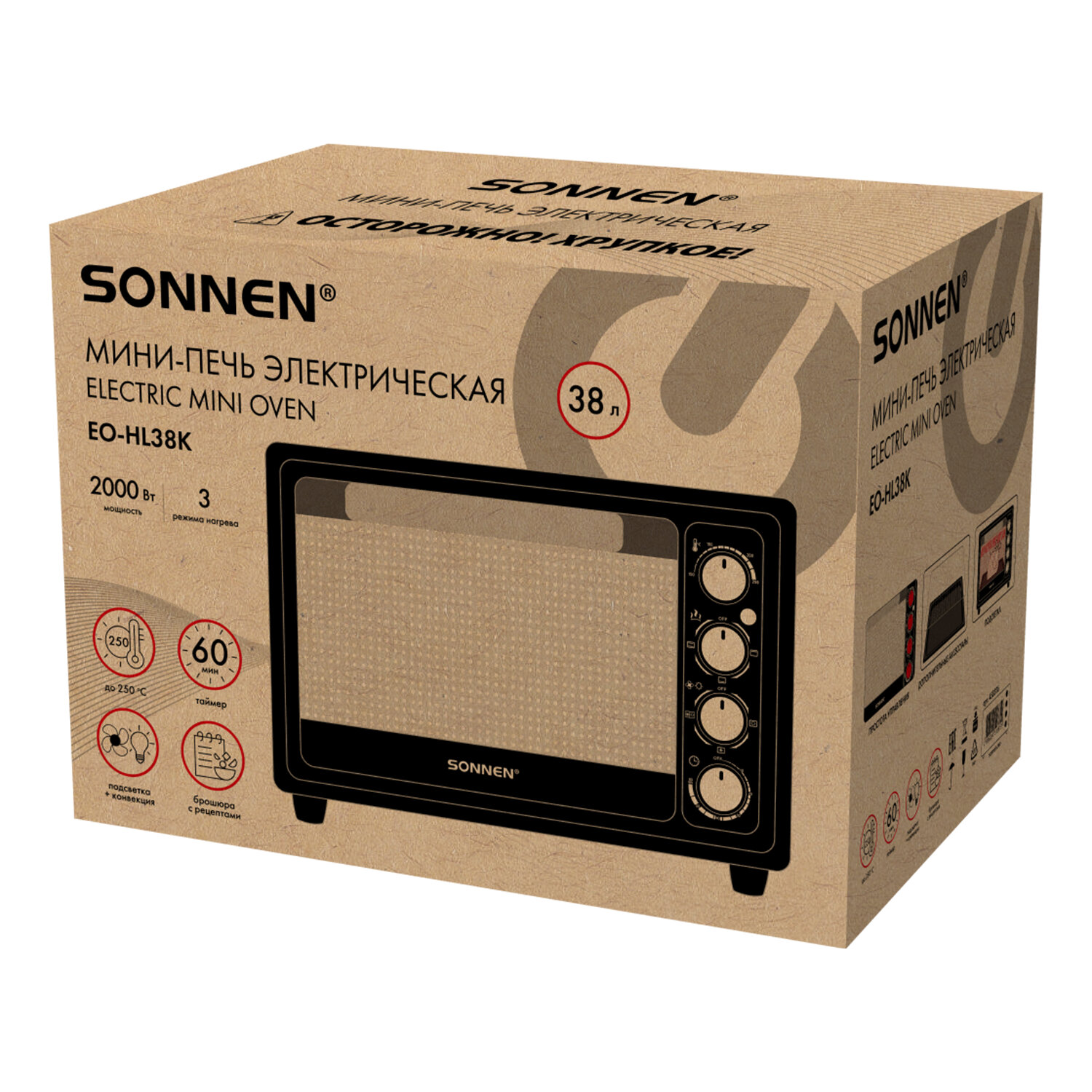 Мини-печь электрическая SONNEN EO-HL38K, 2000 Вт, 38 л, 3 режима нагрева, режим конвекции, таймер, механическое управление, черная Код товара: 458306 5 541,48 ₽ Купить Производитель:SONNEN Мини-печь SONNEN EO-HL38K обладает функциональностью полноценной духовки при компактных размерах. Мини-печь SONNEN EO-HL38K имеет внутренний объем 38 л, которого достаточно для приготовления блюд на всю семью. Мощность устройства – 2000 Вт, что обеспечивает быстрый нагрев и эффективное приготовление блюд. Система с 4 нагревательными элементами гарантирует равномерное приготовление блюда со всех сторон. Управление осуществляется с помощью 4 механических переключателей. Таймер с продолжительностью до 60 минут программирует необходимое время работы мини-печи. Также для приготовления разных блюд можно активировать режим конвекции, выбрать температуру в диапазоне 100-250 °C и подходящий режим нагрева: верхний, нижний или верхний + нижний. Подсветка камеры печи позволяет оценить степень готовности блюда. Размер устройства – 52,3х37,1х35,8 см. В комплекте с печью поставляется противень, решетка, ручка для противня, а также брошюра с рецептами.Производство: КитайМощность: 2000 ВтОбъем: 38 лКоличество режимов приготовления: 3Тип управления: механическоеВнутренняя подсветка: даТаймер: даАвтоматическое отключение и оповещение о готовности: даТип внутреннего покрытия: оцинкованная стальРешетка для жарки: даЦвет: черныйВес: 8,92 кгРазмер упаковки: 39.6 × 57 × 42.5 смОбъём: 0.0959 м3Промежуточная упаковка: 1 штТранспортная упаковка: 1 штШтрих-код: 4606224518619 Приложение-1.pdf Сертификат-1.jpg Сертификат-2.jpg