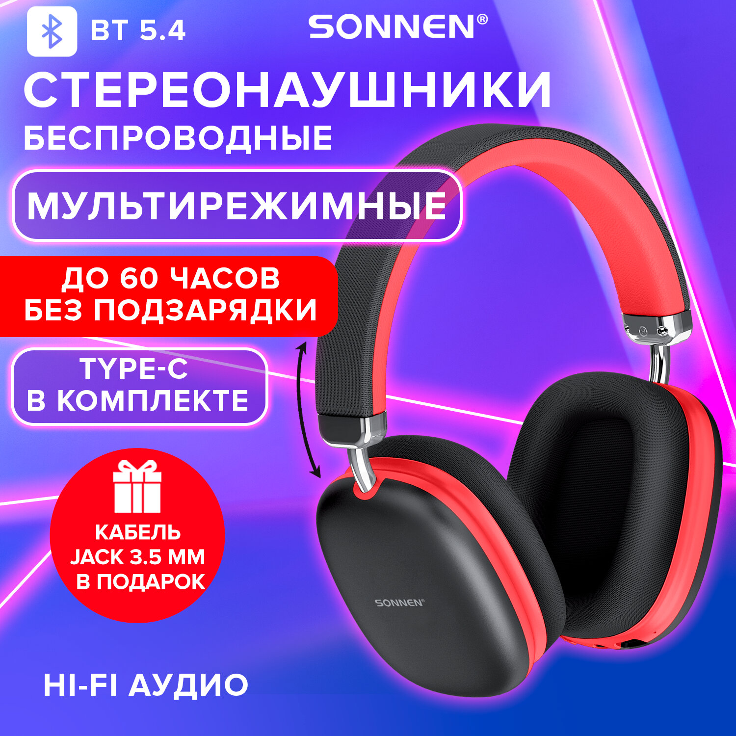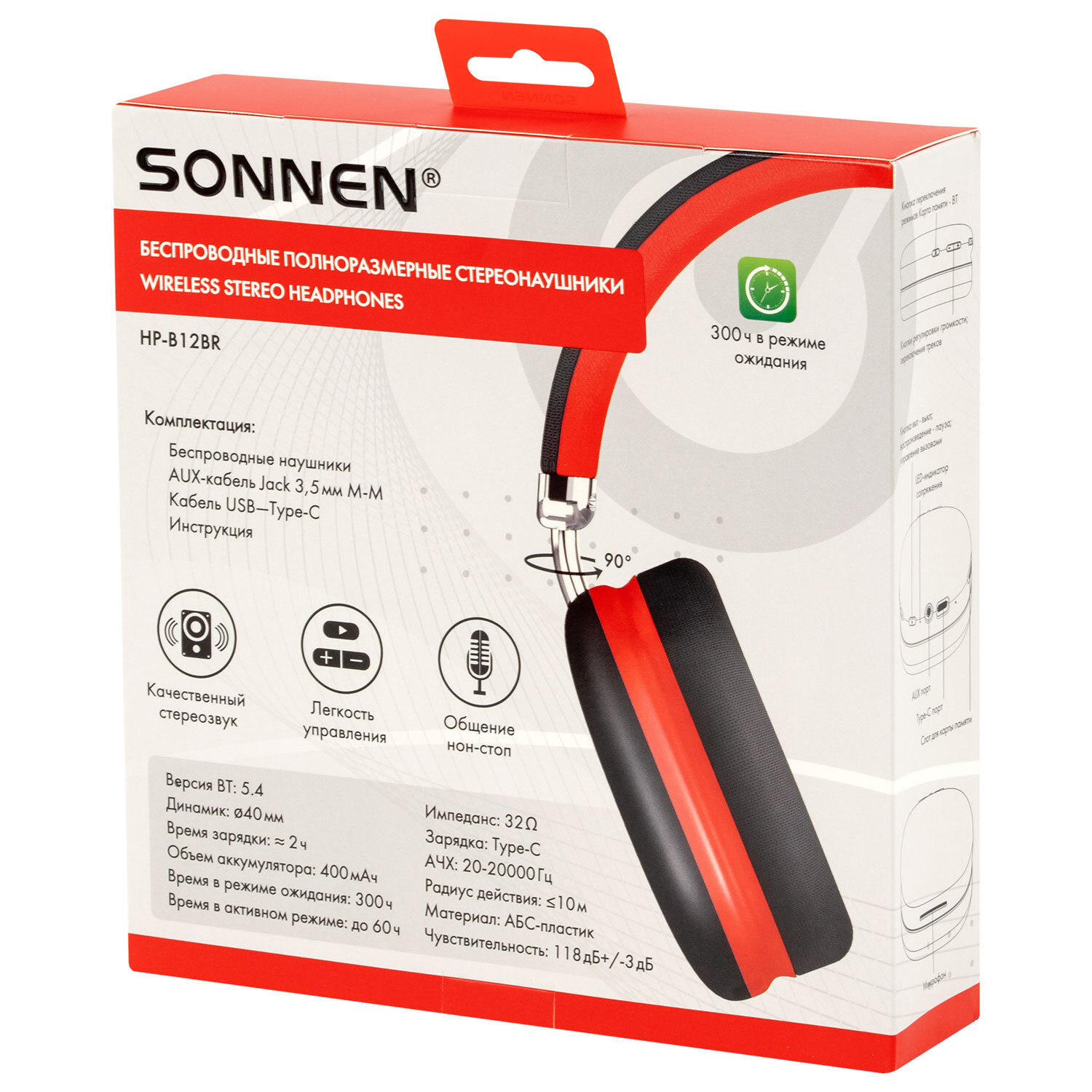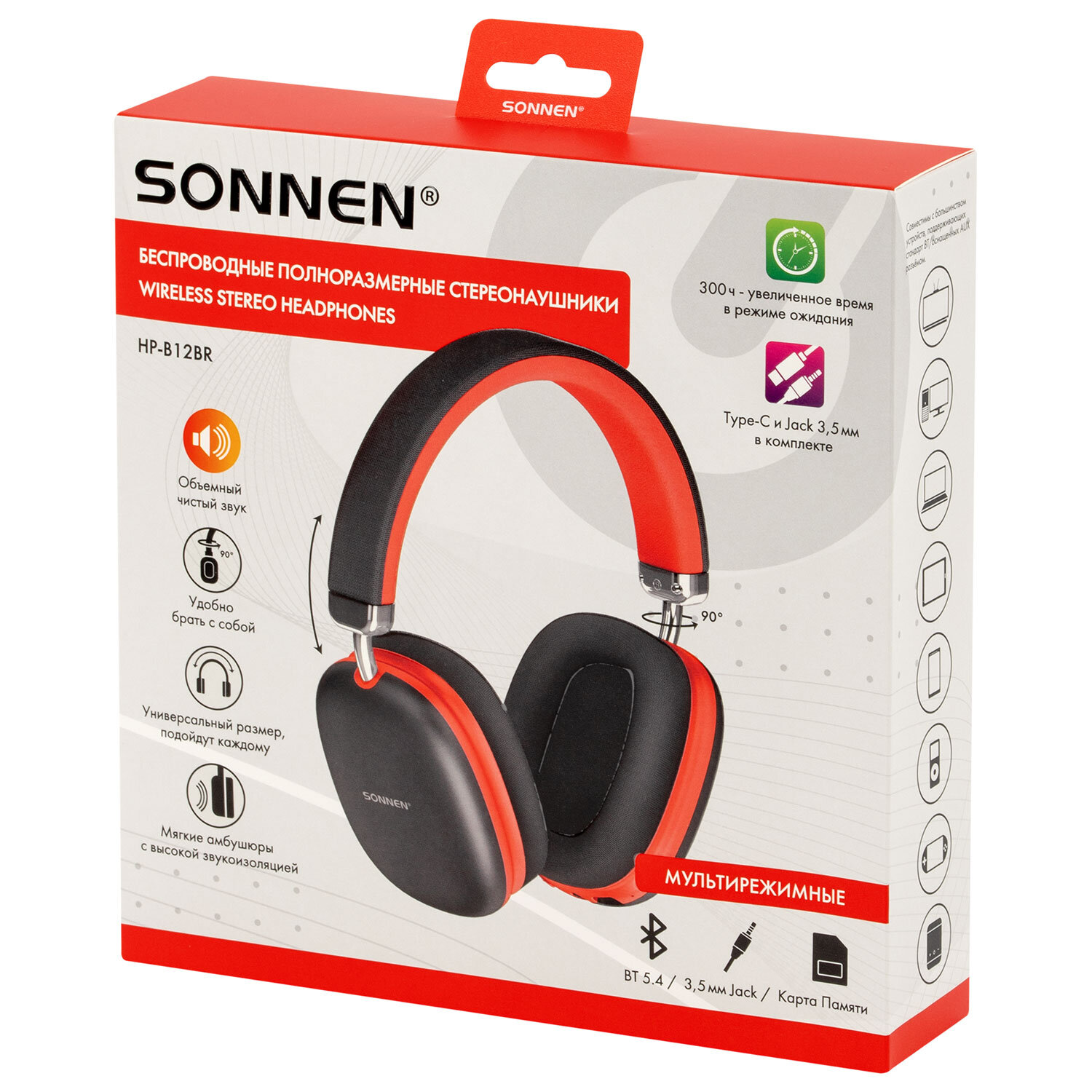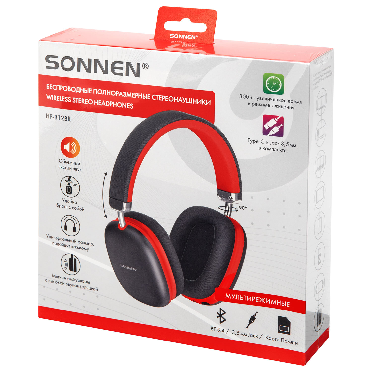 Наушники беспроводные накладные полноразмерные раздвижные мультирежимные, SONNEN HP-B12BR, Bluetooth 5.4, черный/коралловый Код товара: 514128 1 069,36 ₽ Купить Производитель:SONNEN Беспроводные наушники с микрофоном SONNEN HP-BH12BR – незаменимый аксессуар для прослушивания музыки, аудиокниг, лекций и подкастов, а также для телефонных разговоров на прогулке, во время занятия спортом, на отдыхе, за рулем. Наушники SONNEN HP-BH12BR – это качественный и стильный аксессуар для повседневной жизни и отдыха. Закрытое акустическое оформление и амбушюры из мягкой экокожи с высокой звукоизоляцией позволяют наслаждаться прослушиванием, не отвлекаясь на посторонние звуки. Раздвижная конструкция дужек делает модель универсальной - подойдет и взрослым, и детям. Поворотные на 90° чаши облегчают переноску. Мультирежимная модель SONNEN HP-BH12BR поддерживает 3 способа подключения: по Bluetooth, через кабель AUX jack 3,5 мм и карту памяти Micro SD*. Модуль Bluetooth версии 5.4 гарантирует бесперебойную и качественную связь с любым источником сигнала, поддерживающим подключение по Bluetooth. А входящий в комплект аудио-кабель Jack 3.5 поможет наслаждаться прослушиванием даже при разряженном аккумуляторе и от источников сигнала, не поддерживающих беспроводное соединение. Используйте слот для Micro SD для проигрывания любимых плейлистов. Увеличенный диаметр динамика 40 мм обеспечивает объемное и чистое стереозвучание. Встроенный HD-микрофон позволяет оставаться на связи в любой ситуации. Клавиши управления, расположенные на чаше, делают управление максимально простым и комфортным. Данная модель поддерживает оптимальный для восприятия частотный диапазон 20-20000 Гц. А также обладает высокой чувствительностью 118 дБ и сопротивлением 32 Ом, которые обеспечивают насыщенный звук даже при подключении к слабому источнику сигнала. Объем аккумулятора наушников 400 мАч обеспечивает работу в активном режиме прослушивания без дополнительной подзарядки до 60 часов**, в режиме ожидания до 300 часов***. Помимо наушников и аудио-кабеля Jack 3,5 мм М-М в комплект также входят кабель USB-A - Type-C для зарядки, руководство пользователя и гарантийный талон. Упакованы в элегантный цветной картонный короб с пластиковым европодвесом. Упаковка усилена термоусадочной пленкой для дополнительной защиты. Все это делает наушники SONNEN отличным подарком для друзей и близких. Производитель сохраняет за собой право на внесение изменений в технические характеристики, комплектацию и конструкцию данной модели для улучшения эксплуатационных свойств без предварительного уведомления. * Устройство поддерживает карты памяти объемом до 64 Гб включительно. Micro SD в комплект не входит. ** Время работы устройства может меняться в зависимости от режима прослушивания, уровня громкости и условий окружающей среды. *** Время от полного заряда до полного разряда без сопряжения с источниками сигнала.Производство: КитайКатегория товара: гарнитураРазъем: USB Type-C / AUX 3,5 мм / SDЗвук: стереоТип наушников: беспроводныеТип крепления: -Материал амбушюров: экокожаКоличество каналов: 2 шт.Шумоподавление: даРадиус действия: 10 мМинимальная воспроизводимая частота: 20 ГцМаксимальная воспроизводимая частота: 20000 ГцЧувствительность: 118 дБСопротивление (импеданс): 32 ОмМикрофон: даРегулятор громкости: даКнопка ответа вызова: даТип подключения: Bluetooth 5.4Крепление микрофона: встроенныйОсобен