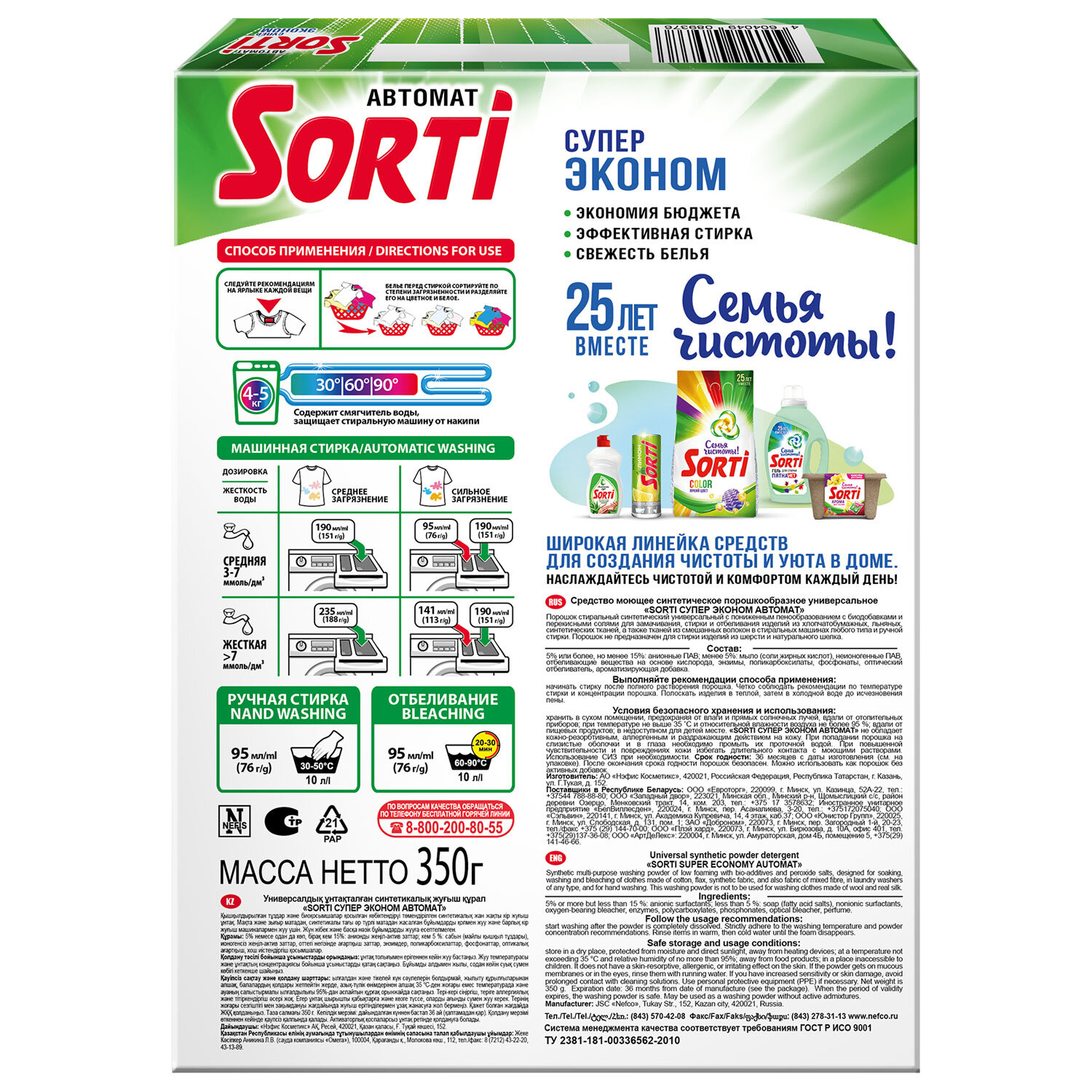 Стиральный порошок-автомат 350г SORTI "СУПЕР ЭКОНОМ", ш/к 89376 Код товара: 702643 102,77 ₽ Купить Производитель:SORTI Для стирки в автоматических стиральных машинах - современное решение, позволяющее экономить собственное время и затраты воды. Стиральный порошок Sorti Супер Эконом бережно отбеливает и устраняет комбинированные загрязнения. Белоснежная чистота без хлопот. Подходит для ежедневной стирки в широком диапазоне температур от 30 до 90С. Предназначен для использования в стиральной машине и ручной стирки. Разумный выбор для экономии семейного бюджета. Состав: 5% или более, но менее 15%: анионные ПАВ; менее 5%: мыло (соли жирных кислот), неионогенные ПАВ, отбеливающие вещества на основе кислорода, энзимы, поликарбоксилаты, фосфонаты, оптический отбеливатель, ароматизирующая добавка.Производство: РоссияТип: универсальныйВес/Объем: 350 г/млВид средства: порошокНазначение: Для всех видов тканиОтдушка: свежестьОбласть применения: бытовое использованиеВид упаковки: картонная коробкаСрок годности: 36 месВес: 350 грРазмер упаковки: 19 × 14.3 × 3.3 смОбъём: 0.0013 м3Промежуточная упаковка: 24 штТранспортная упаковка: 24 штШтрих-код: 4604049089376
