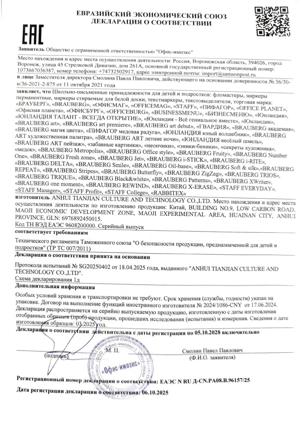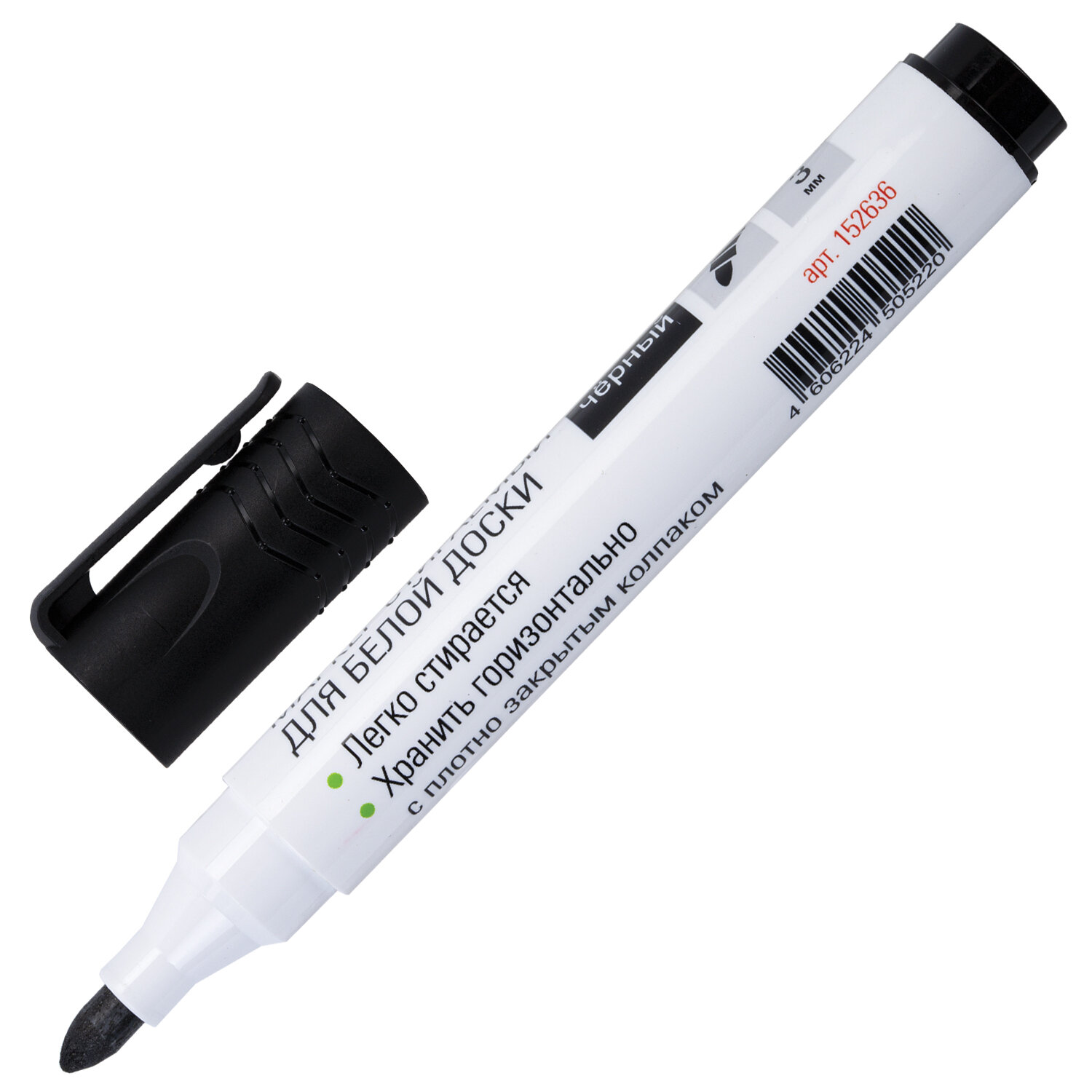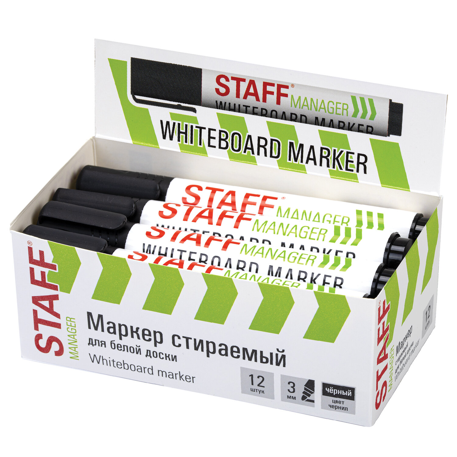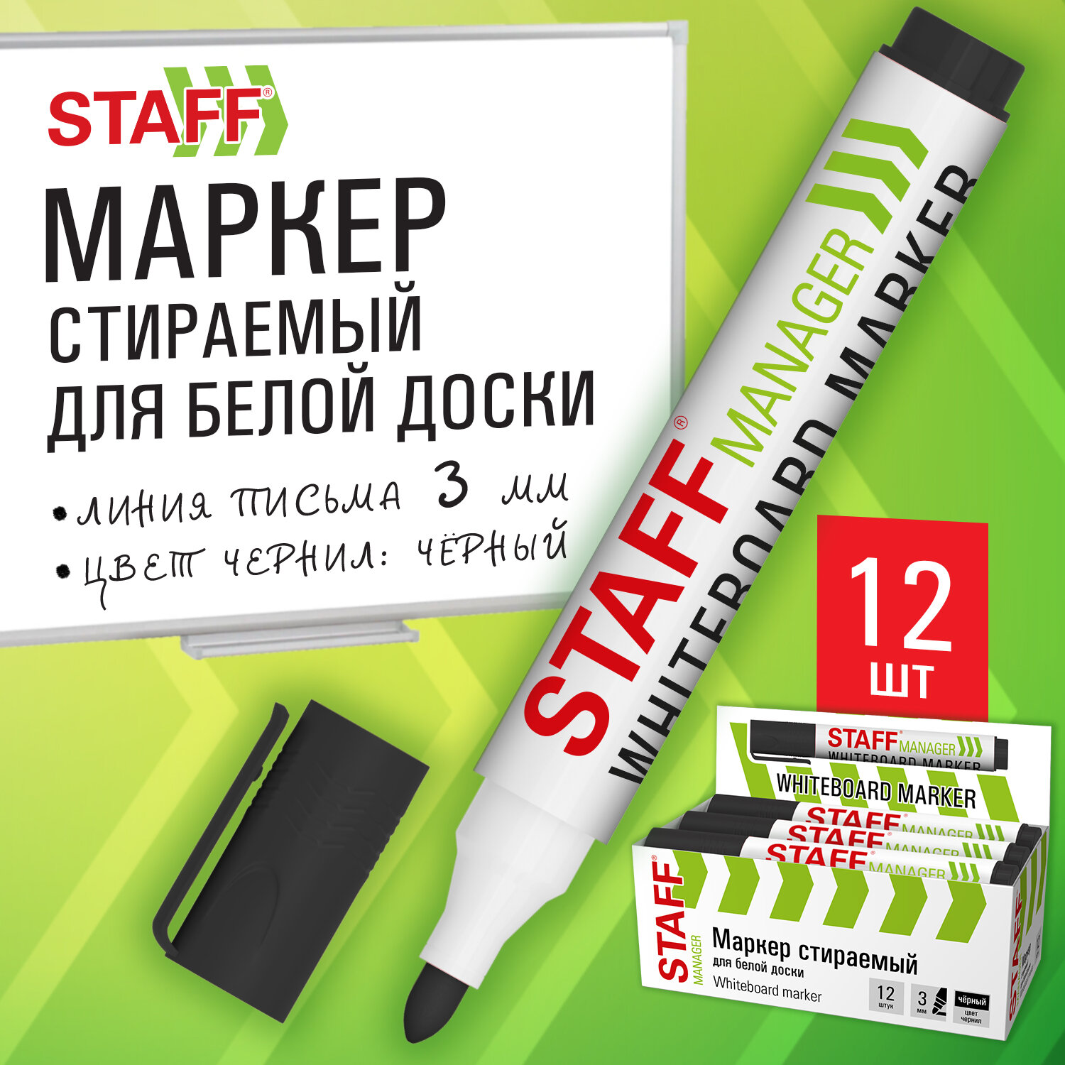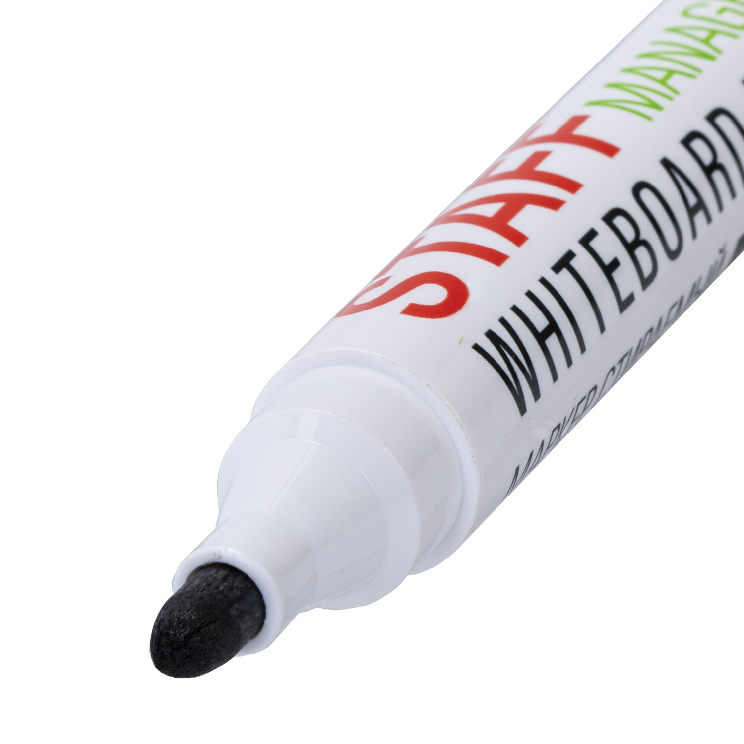 Маркер стираемый для белой доски, ЧЕРНЫЙ, STAFF "MANAGER" WBM-300, 3 мм, с клипом Код товара: 152636 21,84 ₽ Купить Производитель:STAFF Маркер для белой доски STAFF "MANAGER" WBM-300 создан для сохранения ярких идей и создания четких записей. Идеальное решение для совещаний и презентаций, также подойдет для обучения и планирования. Маркер предназначен для письма на всех типах магнитно-маркерных поверхностей. Круглый пластиковый корпус обеспечивает удобное письмо. Наконечник круглой формы диаметром 3 мм создает четкие и однородные линии оптимальной толщины. Чернила на спиртовой основе быстро высыхают, не размазываются и без труда стираются сухой губкой или салфеткой. Цвет колпачка соответствует цвету чернил. Изделие не предназначено для повторной заправки. Маркер предназначен для письма на всех типах магнитно-маркерных поверхностей. Круглый пластиковый корпус обеспечивает удобное письмо. Наконечник круглой формы диаметром 3 мм создает четкие и однородные линии оптимальной толщины. Чернила на спиртовой основе быстро высыхают, не размазываются и без труда стираются сухой губкой или салфеткой. Колпачок оснащен надежным клипом для крепления к планингу или блокноту.Производство: КитайЦвет: черныйСерия: "MANAGER" WBM-300Толщина линии письма: 3Наконечник: круглыйКоличество в комплекте: 1 шт.Основа чернил: спиртоваяУстойчив к засыханию: даЧернила стираются сухой губкой: даНе протекает при перепаде давления: даНаличие клипа на колпачке: даМатериал корпуса: пластикСрок годности: 48 месВес: 18 грРазмер упаковки: 1.7 × 13.8 × 2.1 смОбъём: 0.0001 м3Промежуточная упаковка: 12 штТранспортная упаковка: 1200 штШтрих-код: 4606224505220 Сертификат-1.jpg Сертификат-2.jpg Сертификат-3.jpg