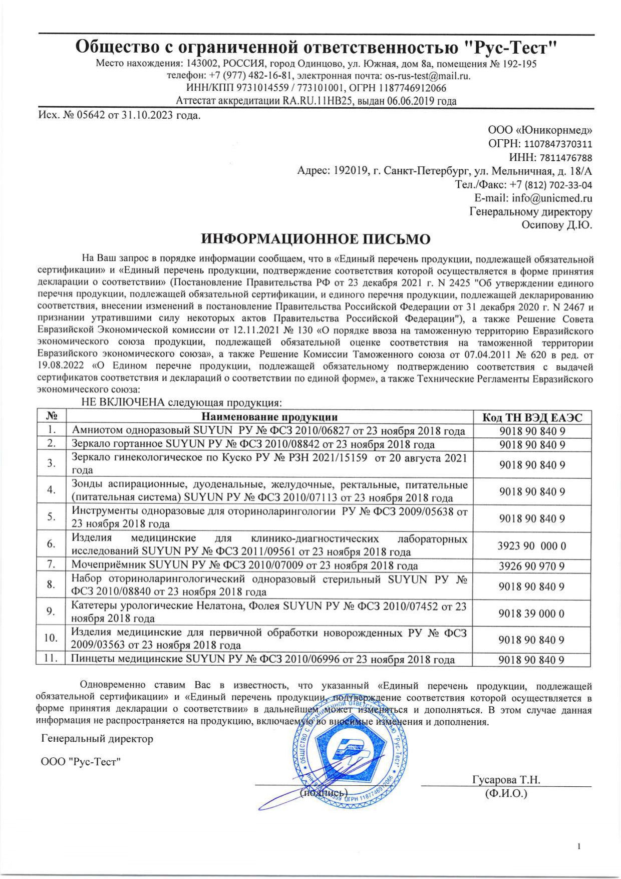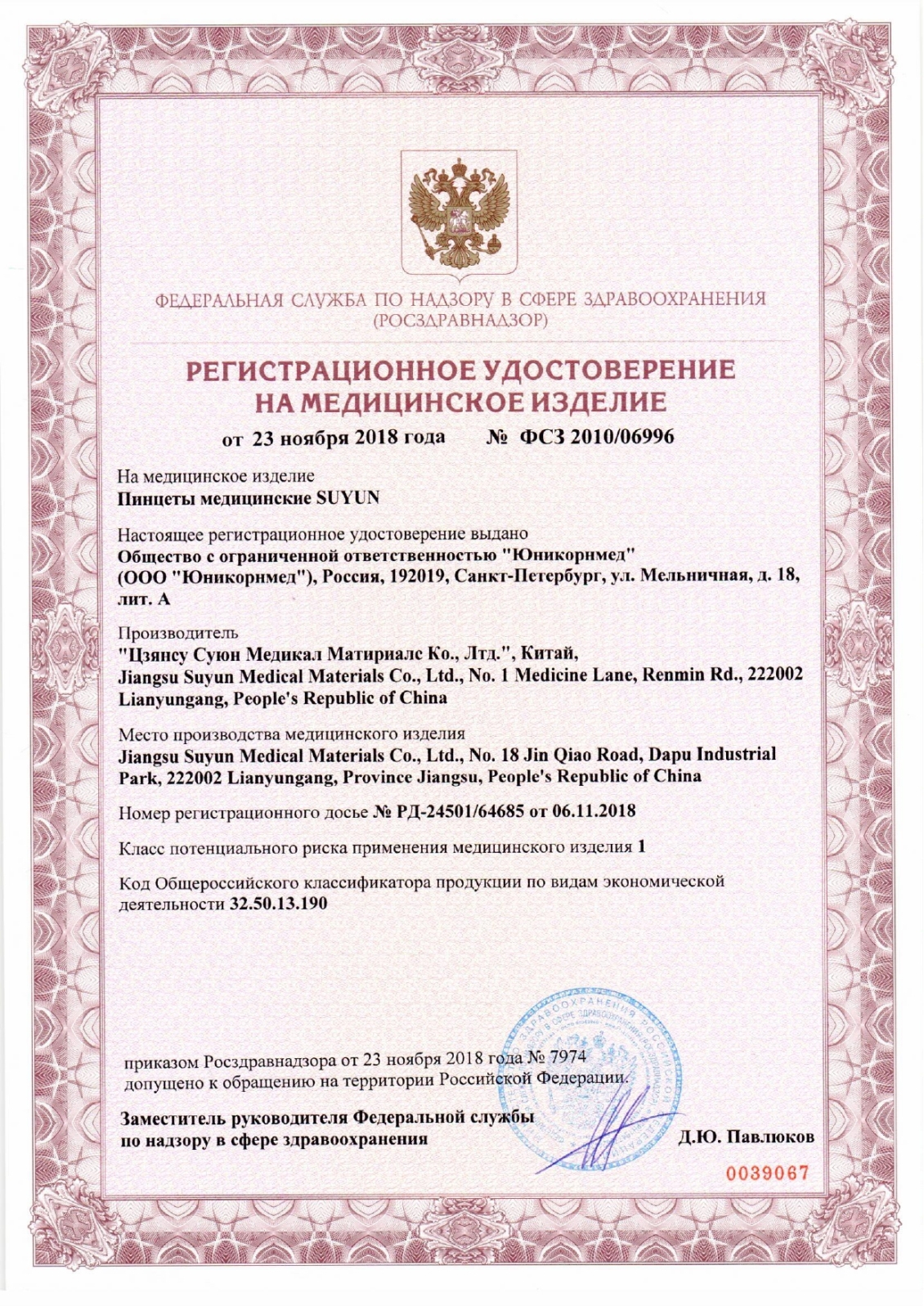 Пинцет одноразовый полимерный стерильный 250 мм, SUYUN Код товара: 631533 30,24 ₽ Купить Производитель:SUYUN Пинцет предназначен для захватывания перевязочных материалов, ватных и марлевых тампонов во время лечебных процедур и профилактических осмотров. Только для одноразового использования. Изготовлен из медицинского нетоксичного полистирола. На внутренней стороне бранш пинцета на кончиках имеются насечки для надежного захвата и удержания предмета. Специальные насечки на внешней стороне браншей исключают возможность выскальзывания инструмента из рук во время осуществления манипуляций. Сферы использования: отоларингология, стоматология, гинекология, общая хирургия. Одноразовый пинцет упакован в герметичный пакет, который снабжен насечкой, обеспечивающей быстрое вскрытие без использования ножниц. Стерилизован оксидом этилена.Производство: КитайКоличество в комплекте: 1 шт.Длина: 1 смТип товара: пинцетОдноразовый: даСтерильный: даМатериал: полимерУпаковка: блистерСрок годности: 60 месВес: 19 грРазмер упаковки: 1.2 × 28.3 × 6.6 смОбъём: 0.0002 м3Промежуточная упаковка: 100 штТранспортная упаковка: 500 штШтрих-код: 6933298201207 Сертификат-1.jpg Сертификат-2.jpg