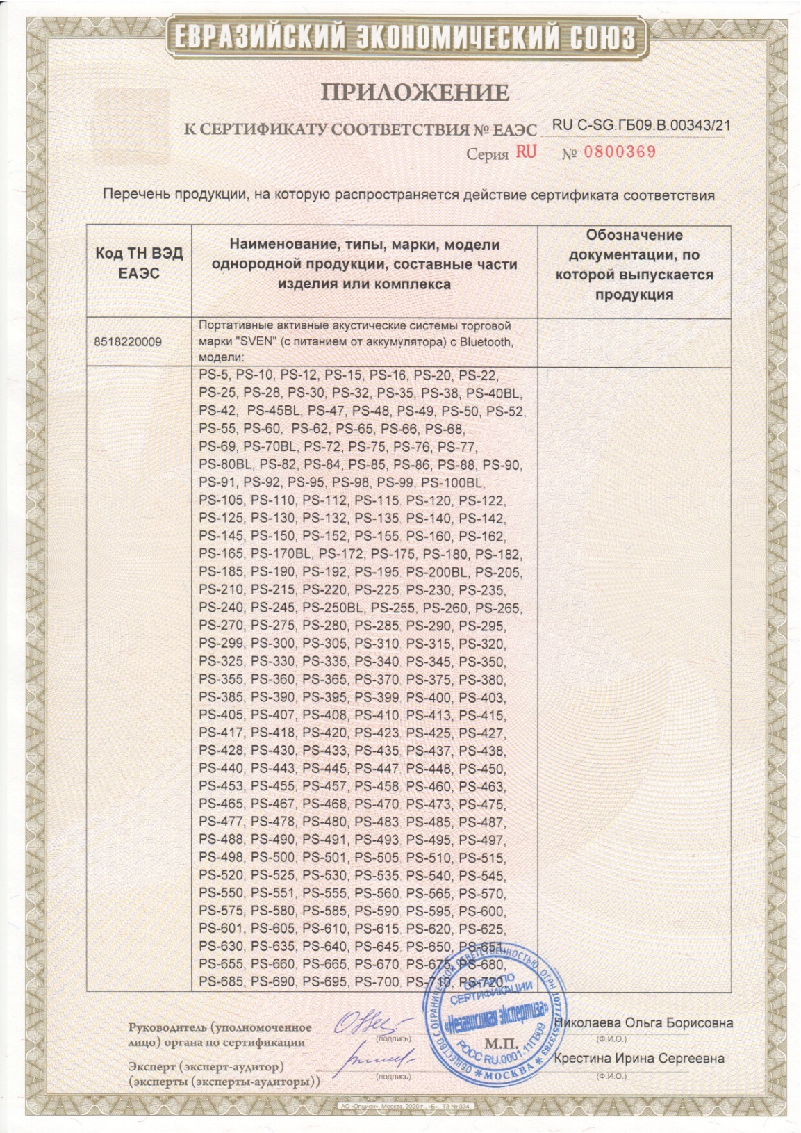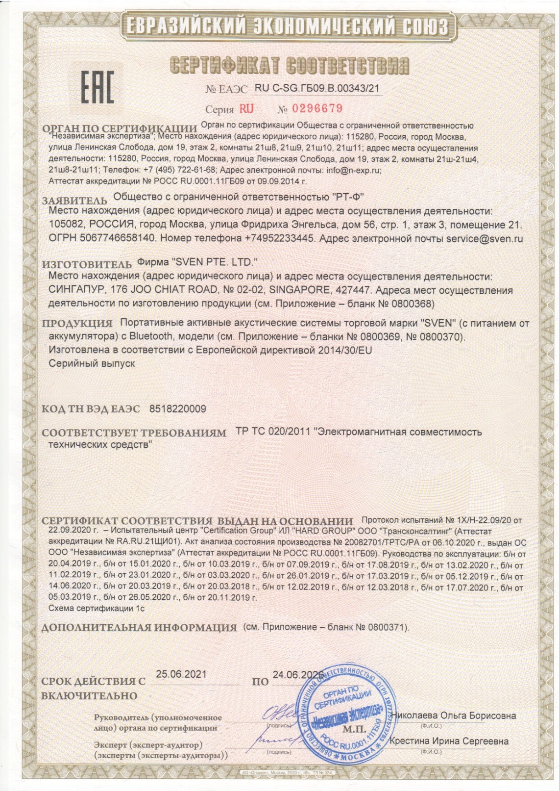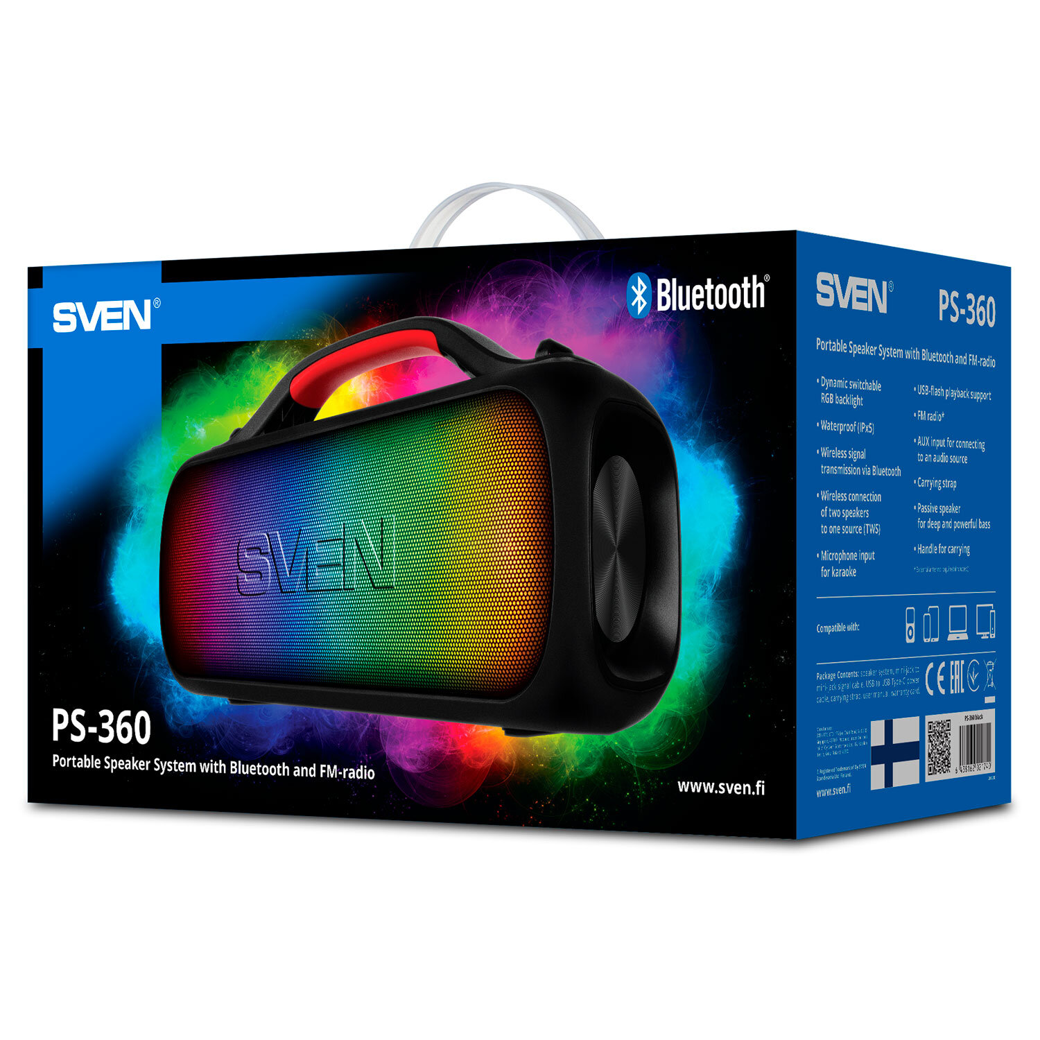 Колонка портативная SVEN PS-360, 24 Вт, TWS, Bluetooth, FM, USB, черный Код товара: 514314 4 592,65 ₽ Купить Производитель:SVEN Портативная акустика PS-360 от финской компании SVEN – устройство сравнительно небольшое: ее масса – 1,9 кг, а размеры – 380х184х135 мм. Благодаря удобной ручке и специальному ремню в комплекте ее легко брать с собой и переносить с места на место. Выходная мощность (RMS) – 24 (2х12) Вт. Режим воспроизведения – стерео. Частотный диапазон – 60-20 000 Гц. Диапазон частот тюнера – 87.5-108 МГц. Размеры динамиков – 80 мм. Беспроводная передача сигнала по Bluetooth. Воспроизведение музыки с носителей памяти формата USB. Поддерживаемые аудиоформаты: MP3, WAV, WMA, FLAC. Источник питания – литий-ионный aккумулятор: 3.7 В, 3000 мА*ч (11.1 Вт*ч). USB: DC 5 V. Время работы (при 30% громкости, базовые настройки эквалайзера, в режиме Bluetooth, без подсветки, при комнатной температуре): 15 часов. Время полной зарядки (может меняться в зависимости от используемого зарядного устройства и кабеля): 4 часа. Номинальный ток потребления – 0,32 А. Тип соединения – Bluetooth, проводной (3.5 mm jack). Поддерживаемые профили Bluetooth: HSP, HFP, A2DP, AVRCP. Тип разъёма питания – USB Type-C. Совместимость в режиме TWS – SVEN PS-360. Размеры изделия (ШхВхГ) – 360х184х135 мм. Вес – 1900 г. Цвет – черный. Вся информация на сайте о товарах носит справочный характер и не является публичной офертой в соответствии с пунктом 2 статьи 437 ГК РФ. Производитель оставляет за собой право изменять характеристики товара, его внешний вид и комплектность без предварительного уведомления продавца.Производство: КитайФормат акустической системы: 2Мощность: 24 ВтДиапазон частот: 60-20000 ГцБеспроводной интерфейс: BluetoothРегулировка громкости: даРазъем для микрофона: даПульт дистанционного управления: нетМатериал корпуса: пластикВид электропитания: литий-ионный aккумулятор: 3.7В, 3000мА*ч (11.1Вт*ч) USB: DC 5 VОсновной цвет корпуса: черныйДополнительный цвет корпуса: нетВес: 1900 гСерия: PSМодель: PS-360Размер упаковки: 17.5 × 20.5 × 38.3 смОбъём: 0.0148 м3Промежуточная упаковка: 6 штТранспортная упаковка: 6 штШтрих-код: 6438162021740 Файлы Сертификат-1.jpg Сертификат-2.jpg Сертификат-3.jpg Сертификат-4.jpg Сертификат-5.jpg Сертификат-6.jpg Сертификат-7.jpg Сертификат-8.jpg Сертификат-9.jpg Сертификат-10.jpg Сертификат-11.jpg Сертификат-12.jpg Сертификат-13.jpg Сертификат-14.jpg Сертификат-15.jpg Сертификат-16.jpg Сертификат-17.jpg Сертификат-18.jpg Сертификат-19.jpg Сертификат-20.jpg Сертификат-21.jpg Сертификат-22.jpg Сертификат-23.jpg Сертификат-24.jpg Сертификат-25.jpg Сертификат-26.jpg Сертификат-27.jpg Сертификат-28.jpg Сертификат-29.jpg Сертификат-30.jpg Сертификат-31.jpg Сертификат-32.jpg Сертификат-33.jpg Сертификат-34.jpg