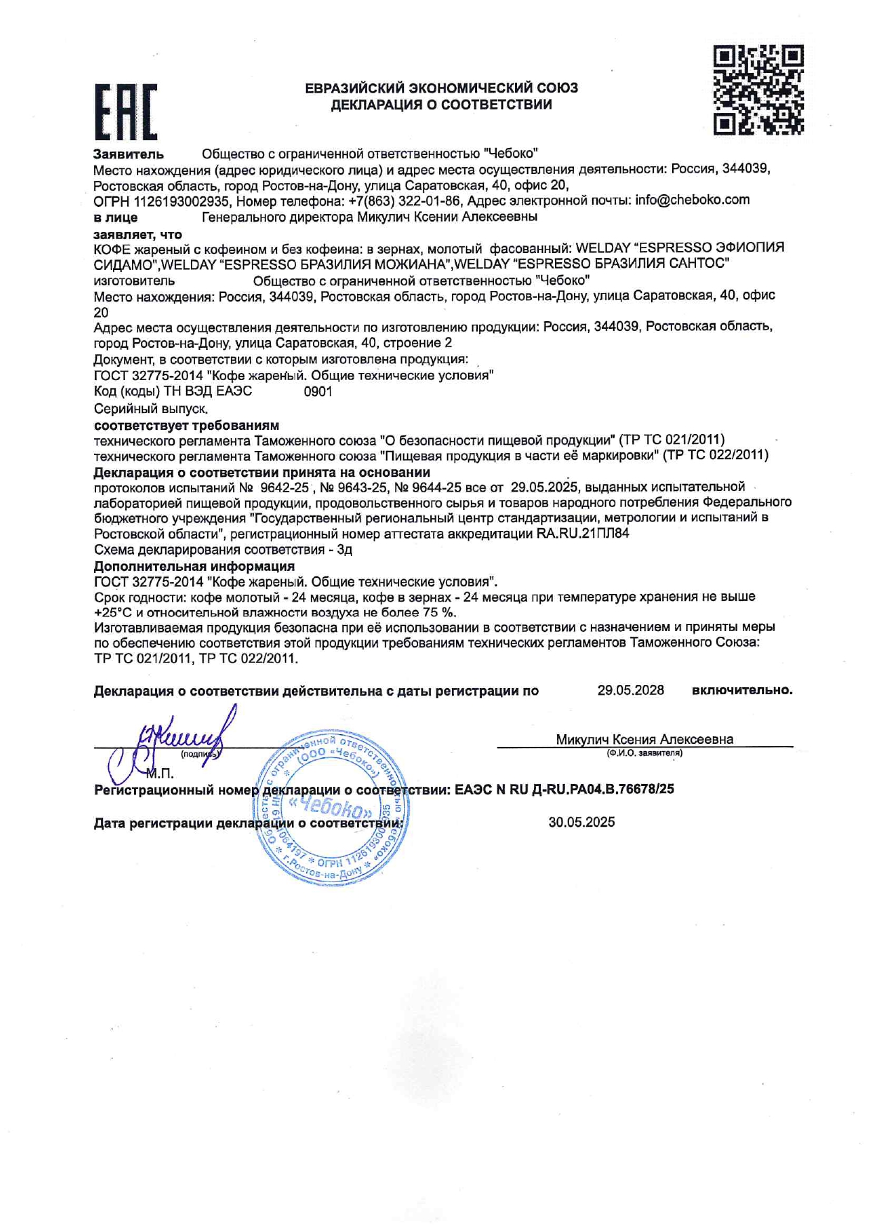 Кофе в зернах WELDAY (ВЭЛДЭЙ) "ESPRESSO ЭФИОПИЯ СИДАМО" 1 кг, арабика 100%, 624399 Код товара: 624399 1 867,9 ₽ Купить Производитель:WELDAY Кофе жареный в зернах WELDAY ESPRESSO ЭФИОПИЯ СИДАМО – это тщательно подобранный купаж арабики из Эфиопии. Такой вкус по достоинству оценят как просто любители, так и истинные ценители кофе. Продукт представляет собой зёрна 100% арабики с средней степенью обжарки, обеспечивающей сбалансированное сочетание горечи и кислинки. Упакован в пакет, что сохраняет свежесть и качество продукта на протяжении долгого времени.Производство: РоссияМасса нетто: 1000 гСтепень обжарки: средняяСорт зерна: 100% арабикаТип кофе: зерновой кофеСрок годности: 24 мес.Вкус: ESPRESSO ЭФИОПИЯ СИДАМОСерия: WELDAYФирма-производитель: Чебоко ОООУпаковка: пакетСрок годности: 24 месВес: 1,07 кгРазмер упаковки: 9 × 30 × 13.7 смОбъём: 0.0037 м3Промежуточная упаковка: 10 штТранспортная упаковка: 10 штШтрих-код: 4606224512266 Сертификат-1.jpg Сертификат-2.jpg Сертификат-3.jpg