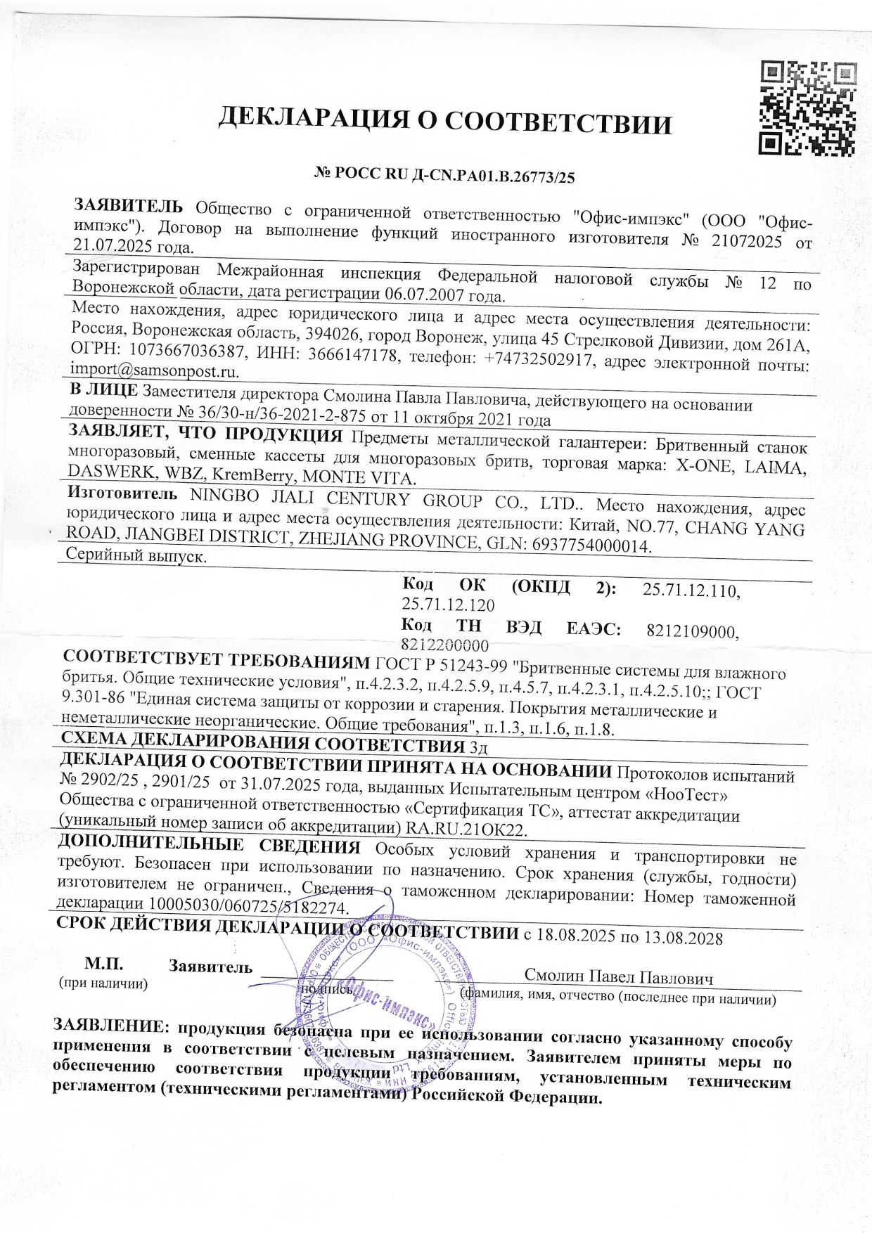 Кассеты для бритвенного станка многоразового женского, 4 лезвия, 2 кассеты, X-ONE (ИКС-УАН) Код товара: 700019 176,14 ₽ Купить Производитель:X-ONE Кассеты X-ONE женские с 4 лезвиями всего за одно движение обеспечивают невероятно чистое бритьё, шелковистость и гладкость кожи. Кассеты для бритв X-ONE. Четыре высокоточных лезвия работают как одна сплоченная система, чтобы с первого движения обеспечить безупречно гладкую кожу без раздражения. Каждое лезвие выполняет свою функцию – от захвата волоса до его точного среза для длительной гладкости. Специальная полоска с алоэ успокаивает и увлажняет кожу, обеспечивая максимальную защиту от раздражения. Всего одно движение для невероятно чистого бритья и шелковистой гладкости кожи. Подвижная головка точно повторяет контуры тела, не пропуская ни одного волоска. Все сменные кассеты X-ONE подходят для ручек серии X-ONE и для большинства известных брендов бритвенных станков.Производство: КитайПол: женскийТип: сменные кассеты Количество лезвий в кассете: 4 штКоличество кассет в упаковке: 2 шт.Эффект от использования: гладкость, комфорт, чистотаСерия: Кассеты для бритвенного станкаВес: 35 грРазмер упаковки: 2 × 11.5 × 9.8 смОбъём: 0.0003 м3Промежуточная упаковка: 24 штТранспортная упаковка: 144 штШтрих-код: 4606224461663 Сертификат-1.jpg Сертификат-2.jpg Сертификат-3.jpg