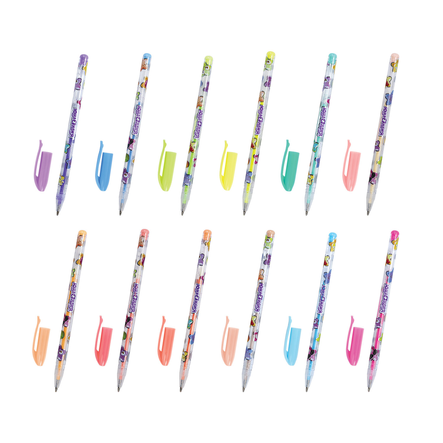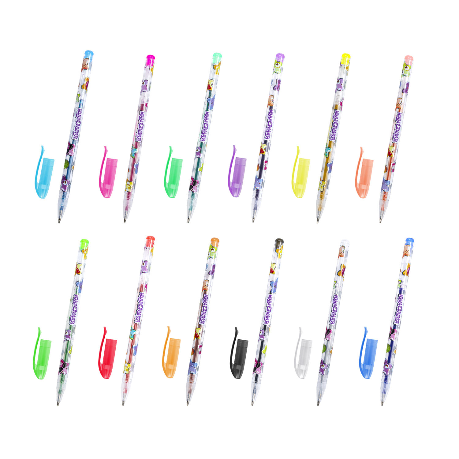 Ручка имеет круглый яркий корпус с печатью. Сменный стержень длиной 130 мм со стандартным наконечником позволит использовать ручку максимально долго. Диаметр пишущего узла 1 мм создает линию письма толщиной 0,5 мм. Набор включает 36 гелевых ручек с различными эффектами: 12 ручек с пастельными оттенками, 12 с блестками, 12 неоновых.