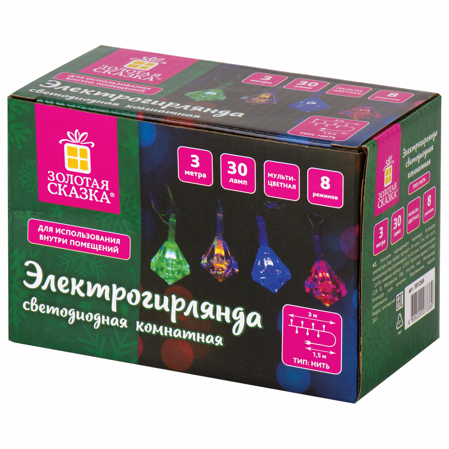 Электрогирлянда-нить комнатная "Бриллианты" 3 м, 30 LED, мультицветная, 220 V, ЗОЛОТАЯ СКАЗКА Ликвидация Код товара: 591269 182,69 ₽ Купить Производитель:ЗОЛОТАЯ СКАЗКА Светодиодные гирлянды ЗОЛОТАЯ СКАЗКА – это яркие, красочные и эффектные спутники любого праздничного события. Мягкий и вместе с тем насыщенный свет этих украшений позволяет использовать их для придания магического и праздничного свечения внутри помещений. Гирлянда электрическая светодиодная представляет собой светодиоды, соединенные между собой электрическим проводом. Тип конструкции электрогирлянды - "Нить". Длина рабочей части гирлянды составляет 3 м, длина силового кабеля (кабеля питания) составляет 1,5 м. Конструкцией электрогирлянды предусмотрено наличие декоративных колпачков для светодиодных элементов в форме бриллиантов. Размер декоративного колпачка - 2,08х1,88 см. Количество светодиодов - 30 шт. Конструкцией гирлянды предусмотрено наличие контроллера для принудительного переключения между режимами свечения. Количество режимов свечения - 8 шт. Цвет свечения гирлянды - многоцветный (RGB). Гирлянда работает от сети. Номинальное напряжение электрической цепи гирлянды составляет 220 В. Тип используемой штепсельной вилки для соединения с источником питания - europlug (CEE 7/16). Допускается использование только внутри помещений.Производство: КитайИспользование: помещениеТип электрогирлянды: Нить "Декоративная"Количество режимов: 8Наличие контроллера: даДлина: 3 мМощность: 3.6 ВтКоличество ламп: 30 шт.Тип ламп: светодиоднаяФорма ламп/фигуры: бриллиантЦвет ламп: мультицветныйЦвет провода: прозрачныйПитание: сетьУпаковка единицы товара: картонная коробкаВес: 186 грРазмер упаковки: 7 × 13.4 × 9.1 смОбъём: 0.001 м3Промежуточная упаковка: 60 штТранспортная упаковка: 60 штШтрих-код: 4606224273389 Файлы Сертификат-1.jpg Сертификат-2.jpg Сертификат-3.jpg Сертификат-4.jpg Сертификат-5.jpg Сертификат-6.jpg