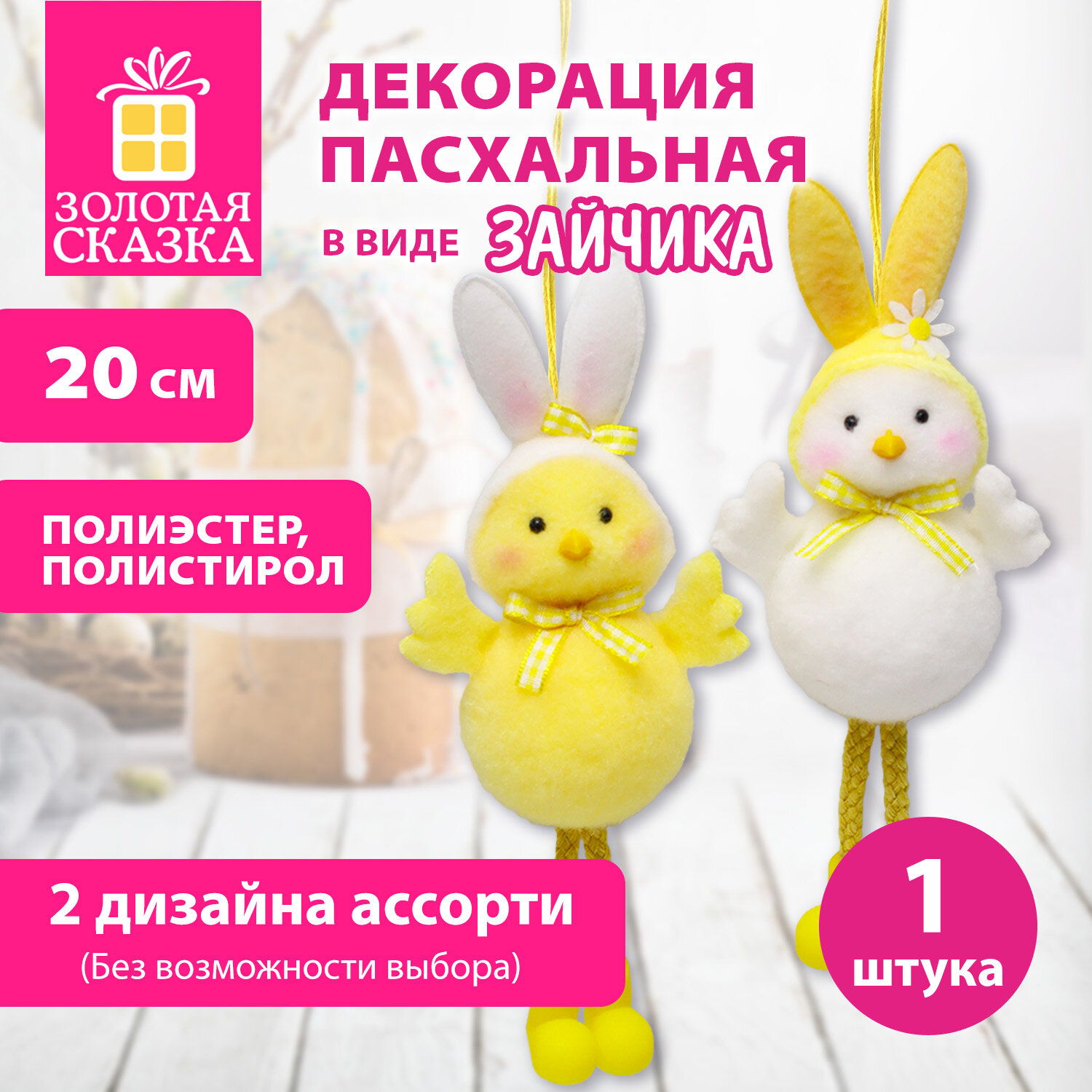 Декорация пасхальная (1 шт.) 20 см "Зайчик", полиэстер, 2 дизайна ассорти, ЗОЛОТАЯ СКАЗКА Код товара: 592637 152,9 ₽ Купить Производитель:ЗОЛОТАЯ СКАЗКА Окунитесь в атмосферу тёплого, светлого праздника Пасхи с очаровательной декорацией "Цыпа с ушами" ЗОЛОТАЯ СКАЗКА. Необычный и невероятно милый пасхальный цыплёнок в забавной шапочке с кроличьими ушками. Декорация выполнена из полиэстера, украшена яркими деталями и представлена в двух дизайнах (без возможности выбора). Благодаря удобной верёвочке, декорацию легко подвесить для украшения интерьера. Размер – 20 см.Производство: КитайТип товара: пасхальная декорацияМатериал: полиэстер, полистиролРазмер: 20х5х8 смКоличество в комплекте: 1 шт.Цвет: желтый/белыйДизайн: Цыпа с ушамиУпаковка: -Вес: 17 грРазмер упаковки: 5 × 7 × 10 смОбъём: 0.0003 м3Промежуточная упаковка: 6 штТранспортная упаковка: 96 штШтрих-код: 4606224535562 Сертификат-1.jpg Сертификат-2.jpg