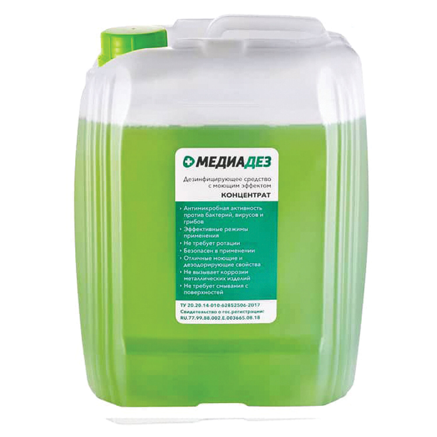 Дезинфицирующее средство с моющим эффектом «МЕДИАДЕЗ» представляет собой прозрачную жидкость без механических примесей от желто-зеленого до зеленого цвета со слабым специфическим запахом или запахом применяемой отдушки; допускается наличие незначительного осадка.