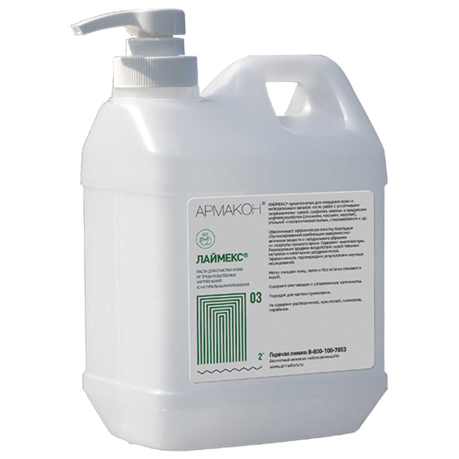 Паста очищающая, 2000 мл, АРМАКОН "ЛАЙМЕКС", от трудноудаляемых загрязнений, с абразивом, дозатор Код товара: 605174 1 438,8 ₽ Купить Производитель:АРМАКОН Паста АРМАКОН "ЛАЙМЕКС" для очищения кожи от трудносмываемых загрязнений: нефтепродуктов, масел, металлической пыли, графита, смазочных веществ, масляных красок, битума, сажи. Нейтрализует неприятные запахи с кожи. • Обеспечивает бережное и эффективное очищение кожи благодаря сбалансированной комбинации ПАВ и мягкого абразива из скорлупы грецкого ореха. Абразив изготовлен с использованием современной вакуумной технологии, исключающей образование острых частиц. • Содержит инактиваторы, нейтрализующие вредное воздействие солей тяжелых металлов и химических раздражителей. Эффективность подтверждена заключениями научных исследований. • Подходит для частого применения. • Не содержит растворителей, красителей, силиконов, парабенов. • Соответствует ГОСТ 31696-2012, ТР ТС 019/2011. • Высшая категория эффективности по ГОСТ Р 12.4.303-2018. Способ применения: не добавляя воды, нанести на загрязненные участки кожи 1-2 мл пасты. Хорошо растереть, уделяя особое внимание местам, где грязь въелась в кожу. Добавить 4-5 мл воды, и снова тщательно растереть. Смыть водой.Производство: РоссияФорма выпуска: пастаОбъем: 2000 млТип ДСИЗ: очищениеНазначение: для рук, универсальныйВид средства: очищающееВид абразива: натуральныйЭффект от использования: очищениеСерия: ЛАЙМЕКСНаличие абразивных частиц: даpH: 4.5Соответствует требованиям стандарта: ГОСТ 31696-2012, ТР ТС 019/2011Тип крышки: дозаторУпаковка: канистраСрок годности: 24 месВес: 2,24 кгРазмер упаковки: 9.8 × 22.8 × 14.1 смОбъём: 0.004 м3Промежуточная упаковка: 6 штТранспортная упаковка: 6 штШтрих-код: 4607077130997 Файлы Приложение-1.pdf Приложение-2.pdf Сертификат-1.jpg Сертификат-2.jpg Сертификат-3.jpg